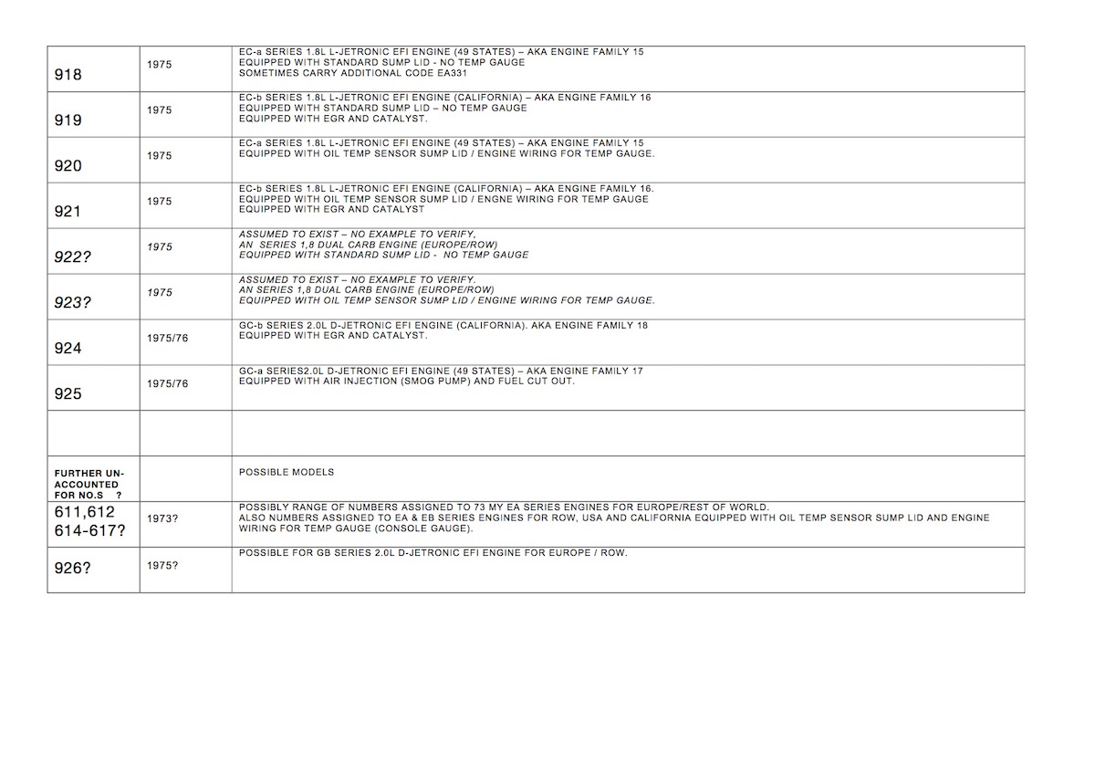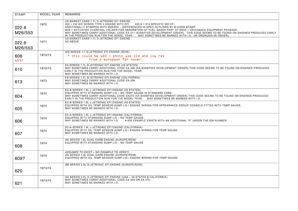 I'm still processing the above, but here are a couple of other fun facts to ponder: The 1971 wiring schematic includes an oil temp sender circuit on the ignition harness and the original ignition harnesses have this circuit. The 1970 and 1972 do not. My thinking is that a separate wire directly connected the 1971 ignition harness to a sump mounted oil temp sender. Unlike the later 73-76 cars with the circuitry in the main chassis harness. The 1973-76 cars have the center console gauge harness connections in the main chassis harness under the carpet, the 1970-72 cars do not. ok @jeffBowlsby - returning to this. (this thread has been good. wandering further north of the seat cushion into the package bin along with this info on the harness of the 73-76 cars might throw a bit of light on the last mystery i was trying to find data on re three number engine code stamps on the 4 cylinders). i got to here. as you may recall Jeff we were initially only restricting research to 74 1.8 L jet cars. we started turning up enough examples of the engine stamp codes to pretty much capture the extent of them. and there was a verifiable pattern. there were 4 number codes present on north american engines. they corresponded to first of all whether a 49 states engine or california. and further subdivided into whether it was a car built as an appearance group 1.8 or a base 1.8. if appearance group (fitted with gauge + console) the engine was also assembled and supplied by engine factory at hanover with a sump plate with oil temp sensor and engine wiring to plug directly into the chassis wiring loom. using PET we worked out that the 1.8 engines have listed the two types of sump plate as fitted. whereas 2.0 engines always were fitted with sump plate with sensor and wiring. what also became clear was that in 74 all 1.8s got as part of what we call appearance group package with the same guage and console as the 2.0 cars. in fact the 1.8s were pretty much the same as 2.0 appearance group optioned car, just gave you the choice of it being the smaller engine (fuel economy, first oil crisis? scenario). after that 74 1.8 engine research i extended the collection of data into the 75 1.8s. 75s used a very similar spread of 4 letter codes across a sequential range of 4 consective numbers. i got all those codes and connected them to verified data (original window stickers). a repeat of 74 data in terms of what type of engine was numbered with which number. similarly 75 1.8s also repeat the 74 spec re appearance group and base car. after the 75s i went into the 73 1.7s. i figured if my theory was right there ought to be also 4 of these codes for the 1.7 engines in 73. 1 for base EA (49 states), for appearance group EA, 1 for base EB (California) and 1 for a. g. EB. but i have only ever been able to find 2 engine stamp numbers for the 73 1.7 610 for the EA 613 for the EB. but now i can see the assumption i got wrong. its clear to me now the 1.7 appearance group cars were not fitted with a console and guages as a factory spec option set up. only the 73 2.0s. the 1,7s got a parcel bin console. VW-Porsche kept a bit of spec difference to distinguish the two different engined cars in 1973. likely a marketing strategy? but there was a four consecutive range of numbers alocated to the 1.7s. running from 610 to 613. the wiring loom you say exists in all 73 cars and can take the temp sensor connection from the engine along with the 4 number range allocated indicates to me that VW-Porsche contemplated offering the guage+console in the 73 1.7s for appearance group. to do this they would have used all 4 of the numbers just as they did in 74 and 75. however a late decision was made i think and they changed strategy. as a result they simply used the first and last code number possibilities from the allocated range of 3 number codes. 610 for EA and 613 for EB. i conclude there is no 611 or 612 engines. they dropped the necessity for these late in their plans for 73 models. -------- another curiousity of these code combinations is as follows. the EC 1.8 engines come after the EA and EB 1,7 engines chronolgically. yet when you look at the code allocations. the EC engines have the 600-609 range. the EA/EB engines have the 610-619 range. and the G engines have the 620 range. which almost suggests that in terms of engine design projects that the EC precedes the EA/EB. which it might have. thats what i am thinking. negotiations with the EPA by all the big car manufacturers in 1972 caused the program for emissions standards introductions to be be delayed one year and shifted in time. kind of opening up an interim year in 1973. i think the EA and EB engines of 73 were a late insertion into the development program of the 914 and the EC engines were given more time to be developed - in particular focussing on the new L jetronic injection system. that is probably why they get their own 10 range of 3 number codes? --------- thats why i think the wiring loom is there in the 73 1.7s but never the possibility of the temp gauge (at least from the factory as an ordered car). in fact i am yet to come across a verifiable 1.7 fitted with the temp gauge from factory. enough examples come up with a console and gauge but these are not original condition cars you can use to verify data. --------- after 73 it looks to me like VW-Porsche go ahead with their planned model strategy given thought to earlier. ie that the appearance group versions of the 1.8s and 2.0s are very similar (almost identical spec) cars only distinguished by their engine types as the difference. -----or its all about fuel economy versus power. apart from that you can have the same car if you wish. |