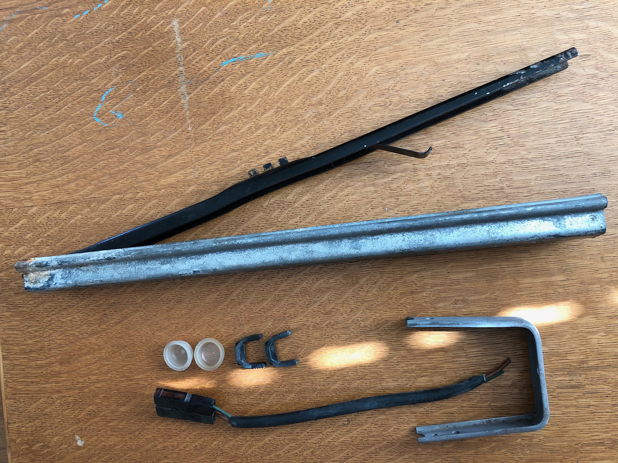Left tail light housing (looking for good to very good but not perfect) One rear sway bar drop link One seat slider, that has the internal spring (see photo) Two plastic plugs for the trunk cross brace One retaining bracket for the front turn signal Two cable retaining clips for the engine relay board One two-pole shrouded connector box Thanks for checking your stock! Attached thumbnail(s) Attached image(s)