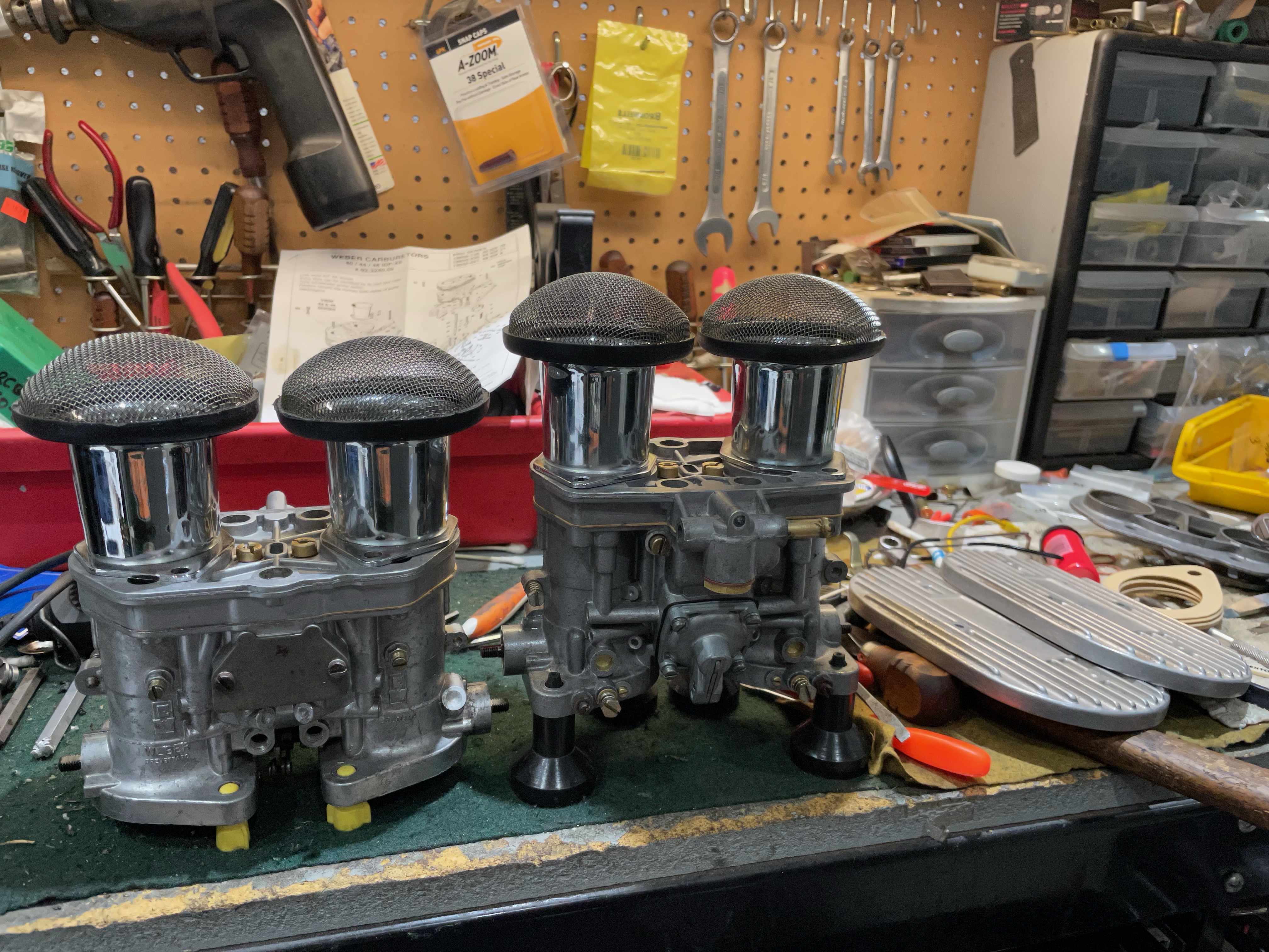 Need some cast 2 bolt air cleaner bases to match the top [/quote] Is the ID of those velocity stacks the same as the carb barrel ID's right at the top ? Don't know what throttle linkage design you're using, but look closely. My Dell 40's using the cross bar top plates resulted in the ID of the top plates being larger than the carb barrel bores. That resulted in a zero radius for air entering the carb itself. I made my own 2 piece velocity stacks. Had to be 2 piece as the lower part fit UNDER the cross bar top plate. This would not permit a well radiused inlet for the top part as not enough OD . |