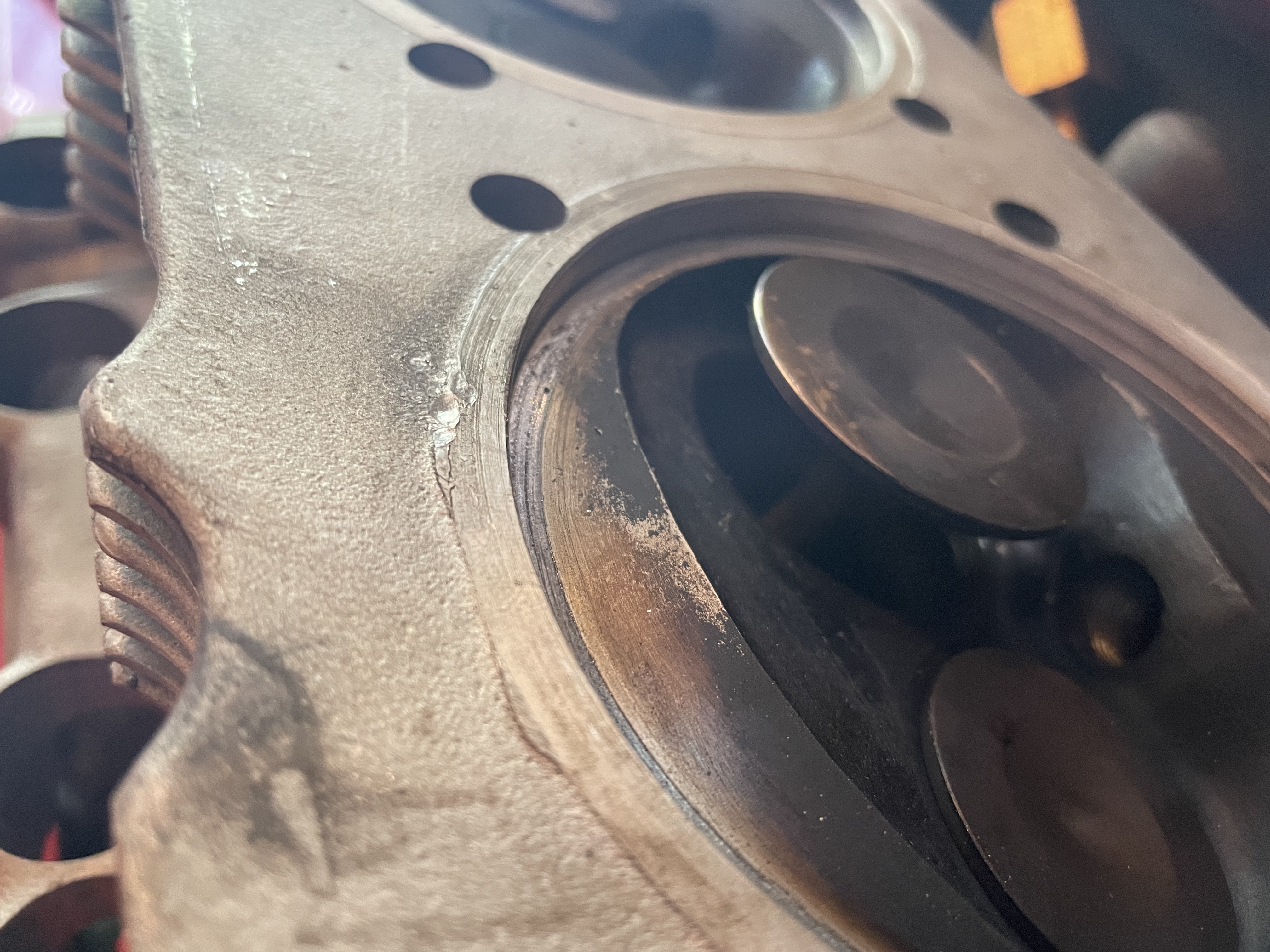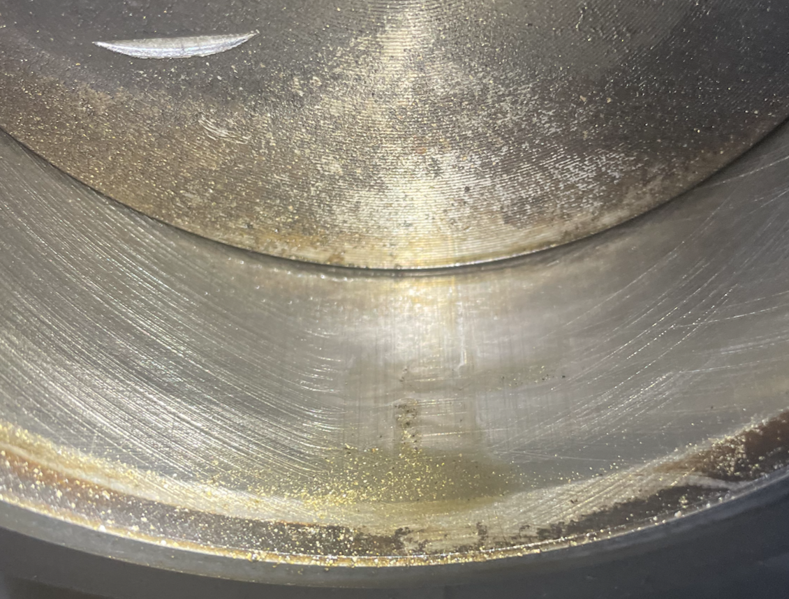 It looks like a valve interfered on the surface of the piston. In reference to barefoot's question, one technique used to verify clearance is to put some substance like playdo on the piston surface, install the heads, and then rotate the engine through a cycle. Inspecting the playdo afterwards can help confirm that you have sufficient clearance between valve face and piston surface. I can't recall if you did something like that before final assembly. If you don't have sufficient clearance you'd need cylinder shims. I hope that makes sense. |
