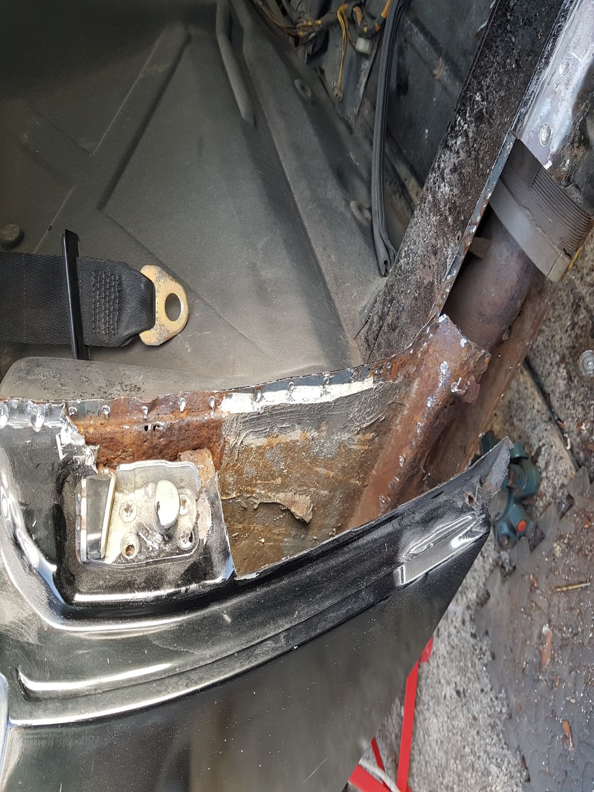 Motor fully stripped now, it seems in good shape for 100k miles, only minor wear on all bearings, expect oil leaks and possibly valve guide wear got the PO part tear down started. Ordering parts now, going 2056 with stock FI and have sent the cam to Elgin cams for regrind (330-1), new injectors ordered as was missing one, new metal fuel lines in. MPS is buggered, have ordered the tangerine racing repair kit. Have decided to have the one damaged head repaired locally instead of going new, the chambers and valve seats are perfect still so feel its worth saving. On the the body, thankfully the problem rust is confined to the area around and above the jack points on both sides, on the passenger side the door catch was only held in place by "the force" (have more than in the pic cut out now), new panels from RD have arrived so moving on to test fitting them with some self made patch panels before starting the welding |