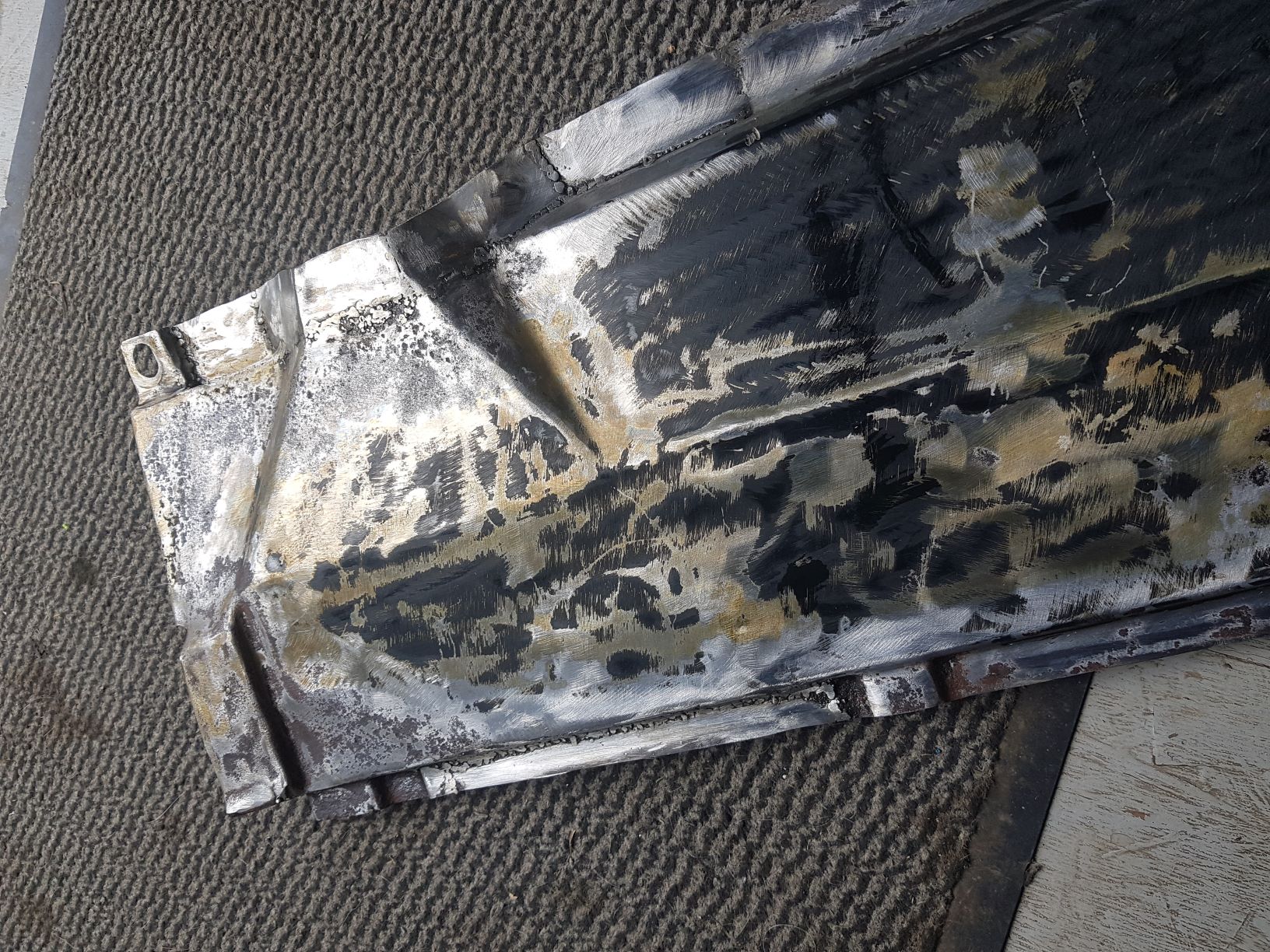 Weather has not been the best to progress the structural welding, plus I was out of practice so decided to see if I could save the front protection plate, it was very tricking to weld, so thin and even though cut and ground worst out i was blowing through all the time but got to a level could live with and then re finished. Also got to finish off the caliper rebuild, new brakes lines 50% in. realy hope to make headway on the structural welding in the next couple of weeks, really want to get it behind me
