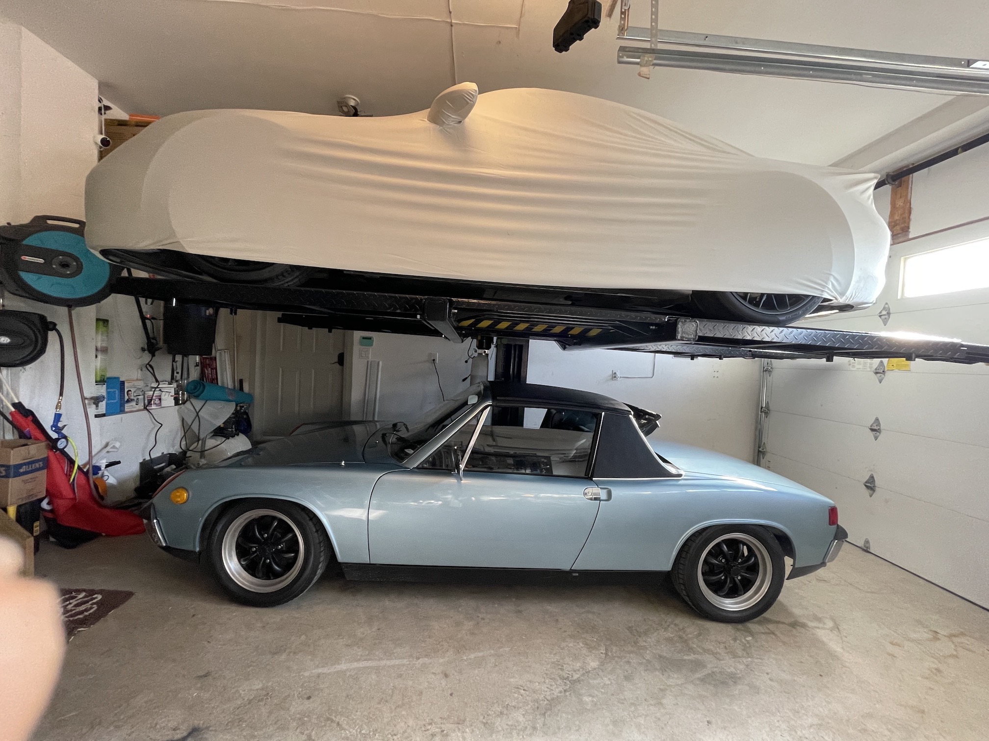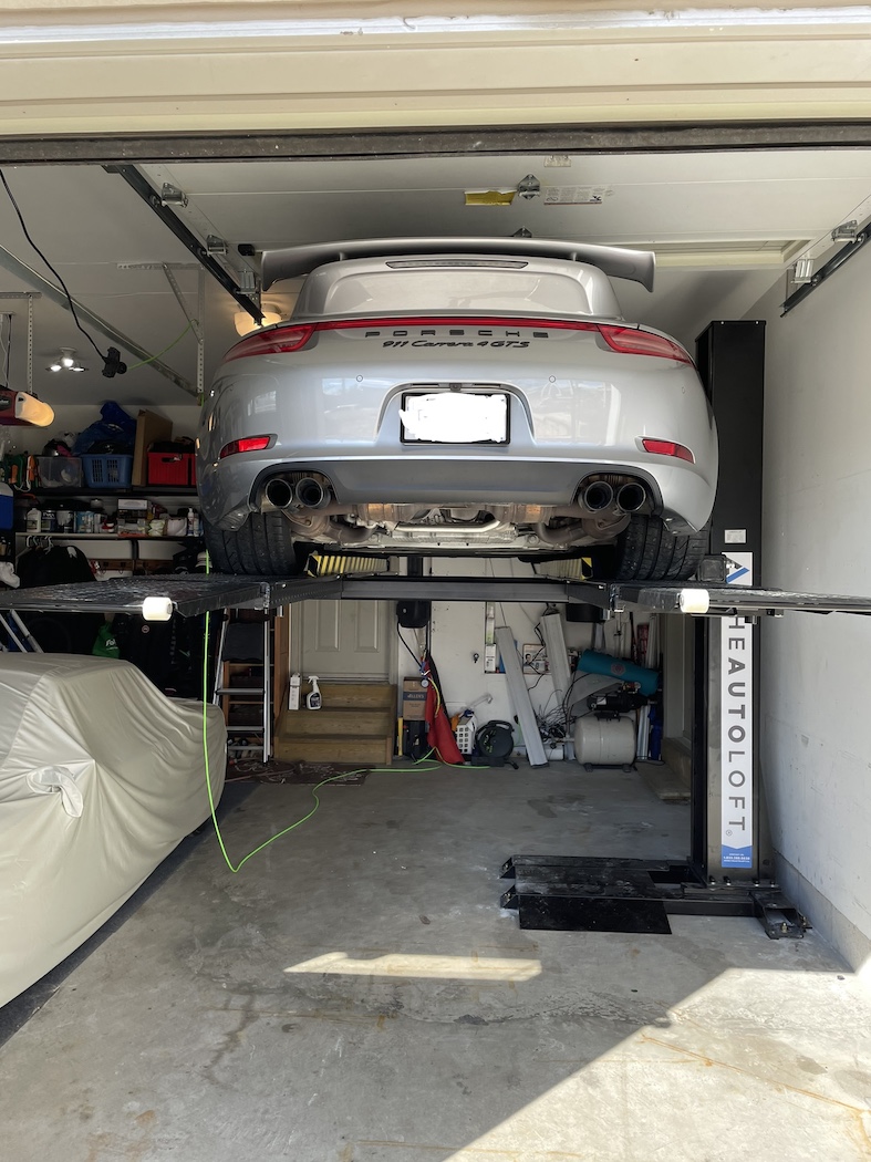 I have a 4-post that serves a similar purpose but does get in the way more. I think I've seen the single post type that has the base piece (floor) extend the same distance as the lift fork. Personally I would be more comfortable with that than the one you have that 100% relies on the bolts in the floor. It's counter-lever so there is a base that extended about mid-way. The lift is rated for 6000lb and I had it professionally installed. That's exactly it, I get complete unfettered access to the vehicles from the sides and the bottom. There is a 10-yr warranty on the lift and 3-year for labour. The company is reputable and has done many installs without any issues. Also these bolts practically go 1/2 ft into the ground and there are about 20 I would say. It is a marvel of engineering. That balancing act does look a bit scary to me, the Carrera 4 GTS is quite a bit heavier than a 914! (IMG:style_emoticons/default/icon8.gif) So far so good. Had it for a month. |