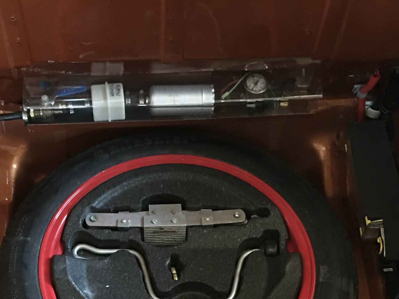 Move the filter and pump to front trunk; added a shut valve and pressure gauge . A lexsn shield was added to protect the set-up