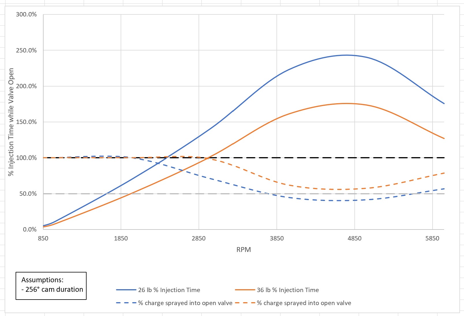Pulses of ~10 ms aren't too bad. But... I don't see where you add an engine pumping efficiency (VE) into the air flow calculation. I didn't check your calcs from a PV=nRT sense so I'm assuming those are correct in terms of air/fuel mass flows with perfect cylinder filling. The engine is only going to be pumping maybe 10-30%* 'efficiently' at idle making your actual fuel flow requirements much less. Pulses of 0.96 ms are too short. Most injectors have 1-1.5 ms latency (voltage and fuel pressure dependent). *Edit: Found a post showing Falcor76 has ~20% VE @ idle so I think these numbers are somewhat reasonable. Excellent! Yes, there's a little obscure note in the chart that says VE is calculated at 100%. This is all new to me so I was going to refine the values to include more realistic VE numbers later. Any guidance on some standard VE values to plug in? So far I've only found typical values at max HP. This is obviously critical to the analysis. So assuming 10% VE, the idle pulse width should be around 1.3 ms with 26 lb injectors and, as you said, 0.96 ms with 36 lb. That puts the nail in the coffin for the larger injectors it seems. It seems even the 26 lb injectors might be pushing the limit. Assuming 20% VE at idle, I get a 2.7 ms pulse width with the 26s (1.9 ms with 36s). Playing with VE a little and assuming a static 85% through the range above idle stretches out the theoretic band where sequential could potentially benefit. I've added curves for % of charge sprayed into open valves below with a reference line at 50% to show the point where sequential is no different from batch. Once I have more realistic guestimate numbers for VE, I'll post updated tables. |