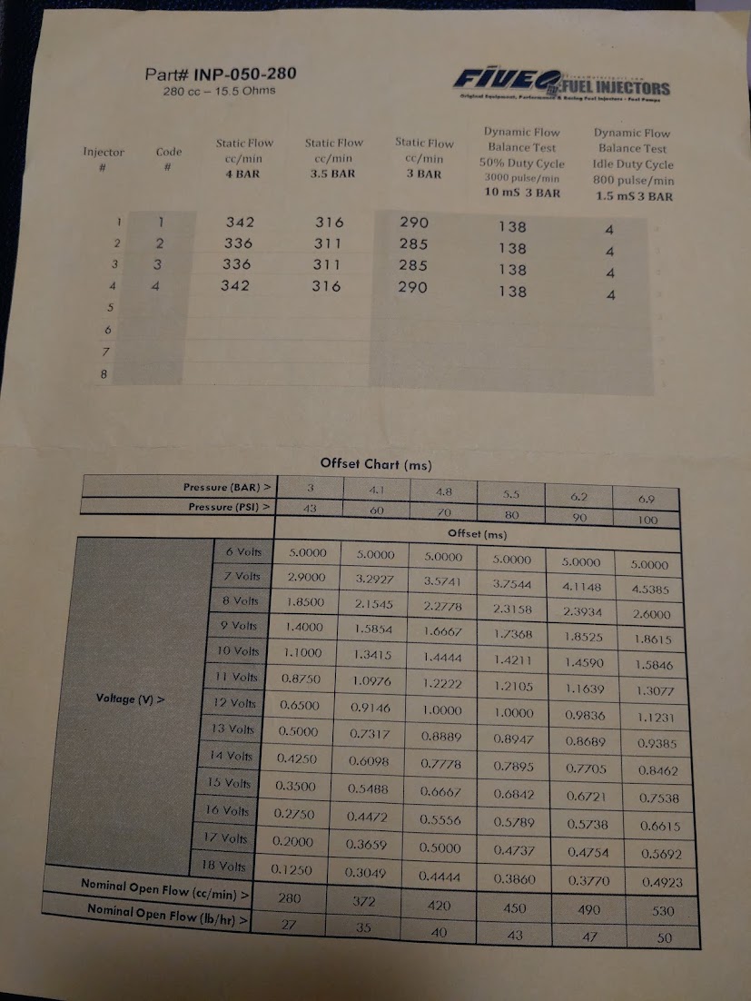This is the datasheet I got with those A280H injectors The 26lb rating was at 3bar pressure however they provide the flow specs and voltage corrections for running them all the way up to 7 bar!!! I would imagine the 36lb sets come with similar abilities. Have read that higher pressures improve atomization, and if you wanted to look at shortening your injector pulse even further, its something to consider. |