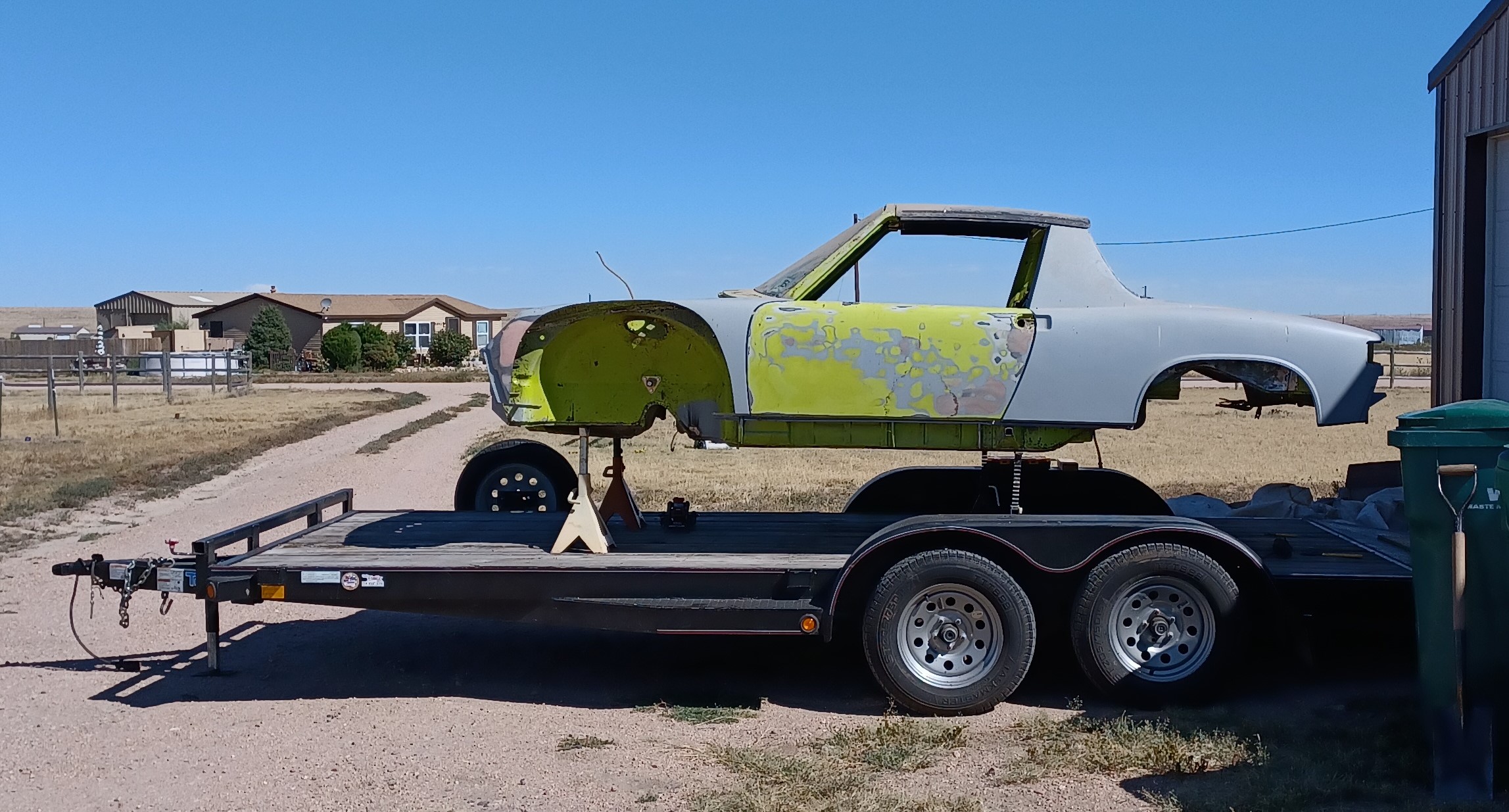 (IMG:style_emoticons/default/piratenanner.gif) So I finally got the first of the two Texas Twins down from Colorado down here to Texas and cant wait to get started on the build. I first obtained this 914 as a parts car back in 2010. After getting it home, I realized it was actually in better shape than the one I already owned. The first one is a 1973, 2.0. This one was a 1974 1.8 in Ravenna Green. Unfortunately I never was able to make allot of time to play with the car, so it sat in my overcrowded garage in Colorado. Since I retired and moved to Texas, the wife said I had better find something to do and stay out from under her feet, so last week I made the treck to Colorado and brought the first of 3 914s back. (the 3rd really is a parts chassis). The car was on a rolling frame so was easy to get onto the trailer, problem is it had to be lowered enough to fit inside a four foot cover to be added onto the trailer, so first we had to raise it high enough to get it off the rolling frame. Then it had to be carefully lowered to where the car was sitting on 4 X 4 blocks so it would be lower than 4 feet high and secured to the trailer. It came in at around 3'8" when done. Then the shipping crate was built over and around the car. The trip was long and went well till I got about 10 miles from home and disaster struck. A catastrphic loss of one tire on the trailer. Thanks to a good samaritan who flagged me down, because I never heard or felt a thing. Also a testament to Top Hat Trailer Company, the trailer was slightly damaged but did not roll, in fact it rode so smooth that I never new the tire had gone away. Of course...no spare for the trailer, so I limped the last 10 miles at 15 miles per hour. So 16 hours of driving and now one of my babies is here in Texas and the work shall begin. From the appearance of the other tire wear, looks like you need to invest in new trailer tires all around! :confused:Isn't that a spare mounted on the other side of the trailer in an above photo? |