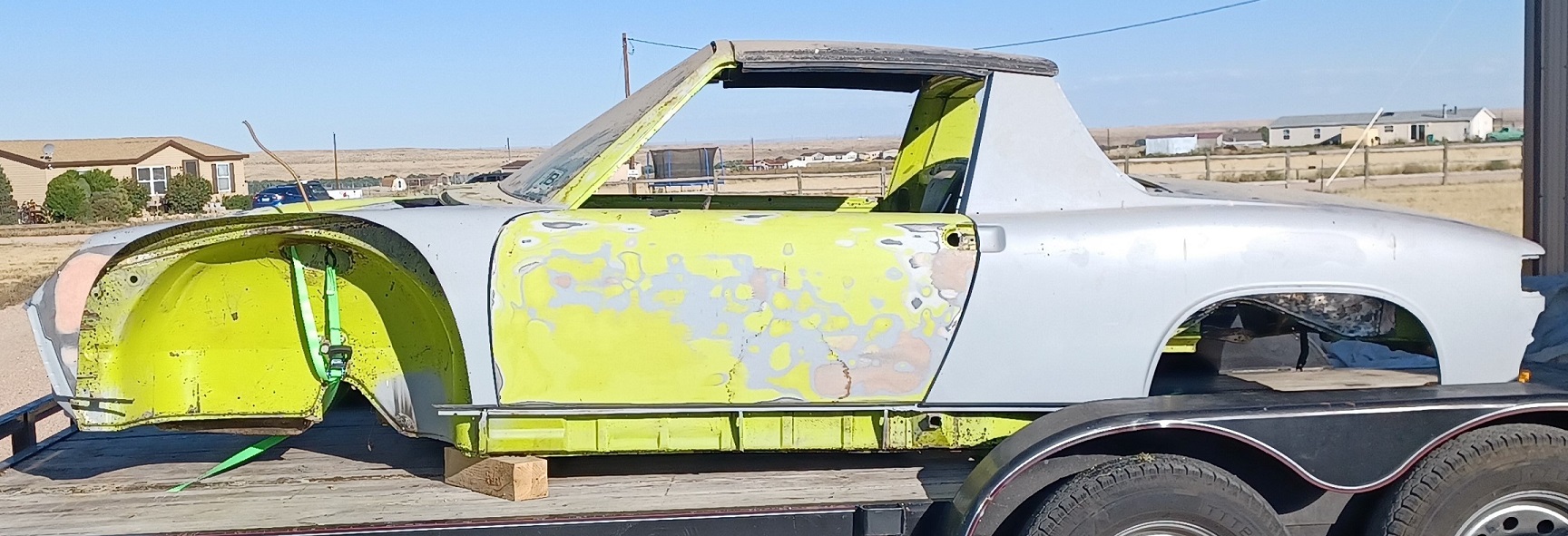 Since I retired and moved to Texas, the wife said I had better find something to do and stay out from under her feet, so last week I made the treck to Colorado and brought the first of 3 914s back. (the 3rd really is a parts chassis). The car was on a rolling frame so was easy to get onto the trailer, problem is it had to be lowered enough to fit inside a four foot cover to be added onto the trailer, so first we had to raise it high enough to get it off the rolling frame. Then it had to be carefully lowered to where the car was sitting on 4 X 4 blocks so it would be lower than 4 feet high and secured to the trailer. It came in at around 3'8" when done. Then the shipping crate was built over and around the car. The trip was long and went well till I got about 10 miles from home and disaster struck. A catastrphic loss of one tire on the trailer. Thanks to a good samaritan who flagged me down, because I never heard or felt a thing. Also a testament to Top Hat Trailer Company, the trailer was slightly damaged but did not roll, in fact it rode so smooth that I never new the tire had gone away. Of course...no spare for the trailer, so I limped the last 10 miles at 15 miles per hour. So 16 hours of driving and now one of my babies is here in Texas and the work shall begin. |