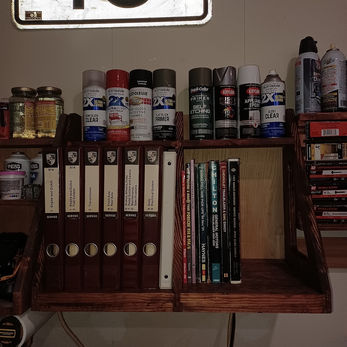 So, over the weekend I got frustrated about not having my work manuals in the garage where they are readily handy. So I built a bookshelf to add to the wall specifically for workshop manuals.