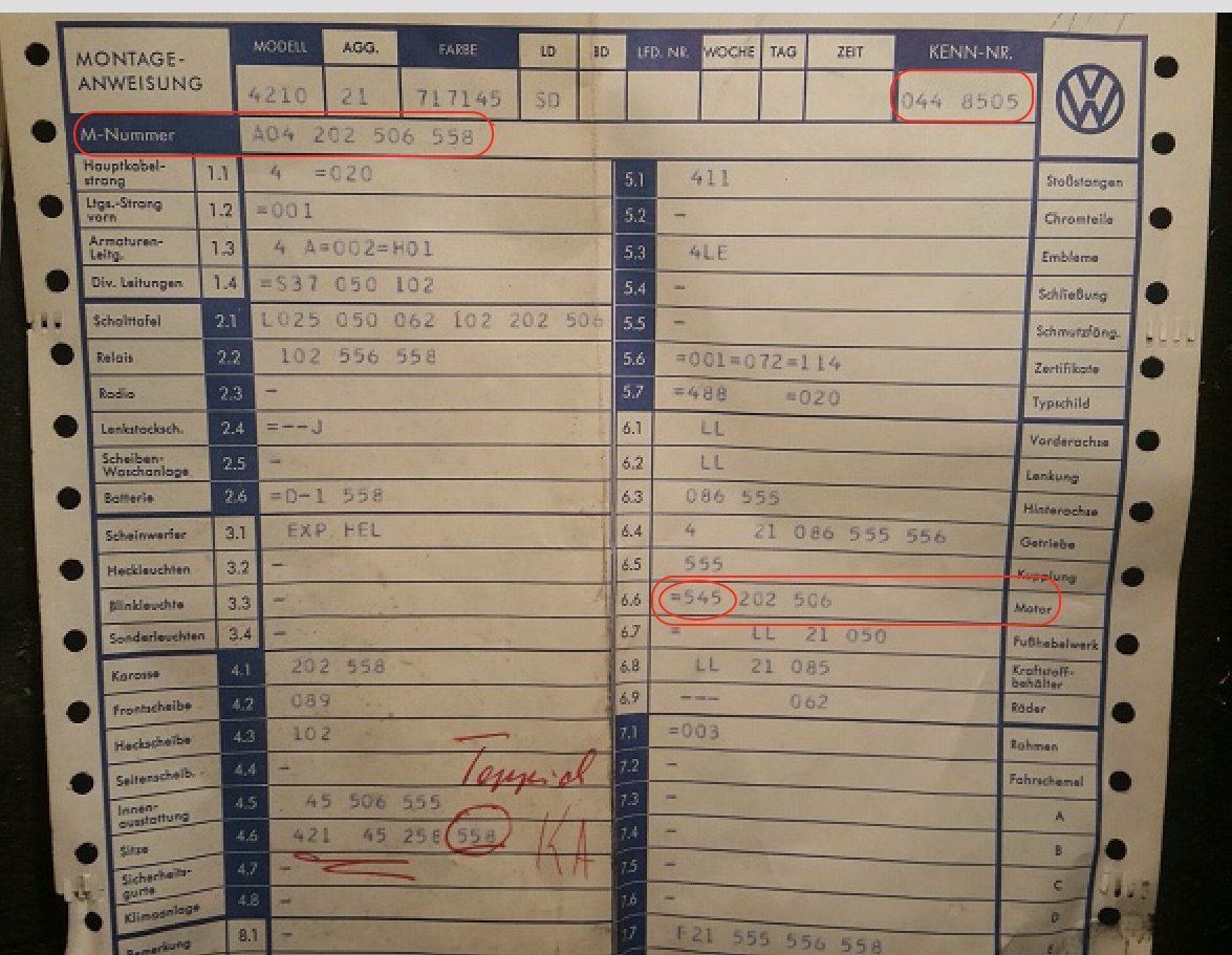its a build sheet for a 411. these were often taped to the doors of the cars as they were produced at the main VW plants. after the cars were completed they were taped to the springs under the rear seats where owners often found them. there would have been something similar at the Karmann Factory. By the time they were producing the 914, Karmann was under ownership by VW and was following VW production protocols and procedures. I'd love to see a build sheet for a 914 but i don't think they escaped the factory still in the car. at least no one has ever found one it seems. i can read quite a bit of this build sheet off the codes. I know its for a 1972 MY 411 european spec. under model it says 4210. = 4 door VW 411 L left hand drive. under Farbe (which means color) 7171 = maya metalllic 45 means black vinyl interior. i can read three of the 4 option (M Nummer) = M Codes. i don't know what A04 means. the other three are as follows. 202 is short for M202 = verstorkkle motorheitzung mit verstorktem heizluftgeblose. reinforced engine heating with additional heating air flow. ie heater fan blower with ducting in engine bay. 411s came standard without the fan blower unlike 914s. M506 = bremskraftverstorker brake booster. again standard 411s did not have the engine vacuum brake booster. M558 = zusorzlich 2 batteririe. dual batteries. apparently 411s could come with twin batteries. presumably for starting in super cold conditions? whatever you could fit dual batteries. of most interest to ideas of engine stamps is the listing under Motor. 545 202 506 this is the engine tin stamp off the same car. the engine stamp accords with the first three numbers noted on the build sheet. 545. the other two sets of three digit numbers are the M codes that would affect the engine install but not necessarily the engine as it came out of stock pile. 202 being the heater blower fan. this would be installed after engine install in car. in a 411 it is mounted a little differently than in the 914s as it is attached to the body work air inlet ducting not the engine itself. only the hoses connect to engine tin. 505 is the brake booster connectiong. presumably this was an engine vacuum hose connection to a port on the enigine. don't know exactly as i have never seen one and of course 914s did not have brake boosters. interestingly M202 and M558 is picked up in the body work listing. Karosse. 202 and 558 are listed. I can see why as i have seen an australian 411 which also never had the engine bay fan booster. the circular hole in the engine intake air duct that the fan would couple to is blocked by a rivetted in circular cover. so the body would have come to the production assembly line with this hole either open or closed dependent on the M202 option. don't really know about the provision for twin batteries but presumably this also afffected the raw delivered body shell in some way. the build sheet also notes the KENN NR. at top right hand corner. often called the Karmann Number by 914 owners. really its the VW production number assigned to all VWs during that time period. car carried it for the purposes of production according to the build sheet (Customer order) before it was completed and received VIn. the 4th number is interesting. its an 8 where 914s have a 9. i believe the 8 signifies the Satzlinger Plant where production of 411s and 412s was done. i think from memory the 1 in that position signifies Wolfsburg and 6 signifies Embden. all type 4 engines were made at the Hannover plant. so they would have all needed to be stamped with some kind of identification for production line placement and other factories they were shipped to where the varying cars were finally assembled. i'll bet if anyone ever turned up a build sheet for a karmann ghia or a beetle cabriolet that the 914s had the same build sheet. its highly likely it was either the same as the example i have posted above or very similar. the build sheet i have posted looks like its computer generated. those of us old enough would recognise the sides of the page with the punched out holes. its out of vintage IBM style 1960s / 70s mainframe. VW did have those IBM mainframes at its major plants but its possible that karmann did not - it may have used different stationary. anyway. if you could ever find one of those build sheets i have no doubt the white engine stamp numbers would be there listed on the build sheet for the particular car. some images of beetles, buses and type 4s on assembly line at other VW plants. you can see the build sheets taped to the side of the cars. photos i have seen from karmann appear to show they did not follow the practice of taping the build sheet to the cars in those locations. ![]() |