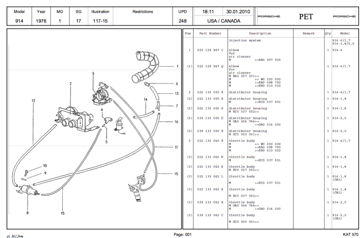 photo of your TB shows it is exactly same as mine (at least on visible half). i'm guessing you never changed your TB - you are in the fortunate position of absolutely knowing. mine could be a replacement during first owners stint. i went and had a look at the 411/412 catalogue at VW classic. you know about that one. on the german VW website. hidden on the website are old catalogues. but the PN catalogues are for euro 412s. exclude the USA catalogues. so only earlier D Jet 1.7 and twin carb 1.8 parts, no L jet parts. guess only USA 412s ran L jet? those catalogues do have the original part #s for things at the time of production. thinking thats why the AAV is listed in the PET i have as a 944 PN. 944 AAV is now NLA. but if i could find a 944 PET of recent date i'd probably be able to get to a replacement AAV and it would be good for a 914 as well? (IMG:style_emoticons/default/beerchug.gif) |
