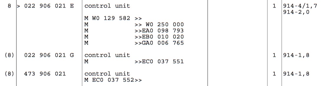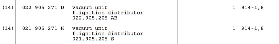 Wow...I think you are on to something. I dont knwo 1.8L throttle bodies. Wonder if the 1.8 owners brain trust can survey their car for the TB ports and dizzy PN. Great job... all right youz two @JeffBowlsby & @StarBear . part # on throttle body of mine. 022 133 067A with a H above it. wouldn't you know it - does not accord with parts catalogue #022 133 062 H. except for maybe the H bit, sort of. this made me think someone's whacked in a replacement throttle body before i got it. did a search on web, threw up a lot of stuff that has already gone down on this website 10 years ago. you have already brushed up against this one before jeff. everyone got a headache out of it back then and no one had their head around it except dave darling and capn krusty. point 1. turns out the part# on my TB is right. same as other 74 1.8s so something short circuits in the parts catalogue where VW does a part number resequence or whatever for the 1.8s and its not in there right. the parts catalogue is right for D jet 1.7 TBs PN. they do have the 022 133 062 number - i inspected a random ebay photo . point 2. in that thread from 10 years back someone posted a 75 1.8 with throttle body part # 022 133 067C. it was a cali i believe with EGR etc. i conclude that the 1.8s have throttle body part #s that are 022 133 067 followed by a Letter for region/chronological variant identification. there are at least 2 versions an A in 74 and a C in 75. i can't read my distributor PN at the moment. i need a magnifying glass hooked up to a robot to crawl down there and read it. tried taking a photo. just blurs. what this survey would need from owners of 1.8s is as suggested above the PN of dizzy and TB. but also the pic of the engine bay sticker (EC-A or EC-B). ------ its possible that the 1.8 throttle body PN cast in is an audi part #? VW part # in the catalogue might correspond or equate via internal code. its got audi symbol cast in as well as VW. |
