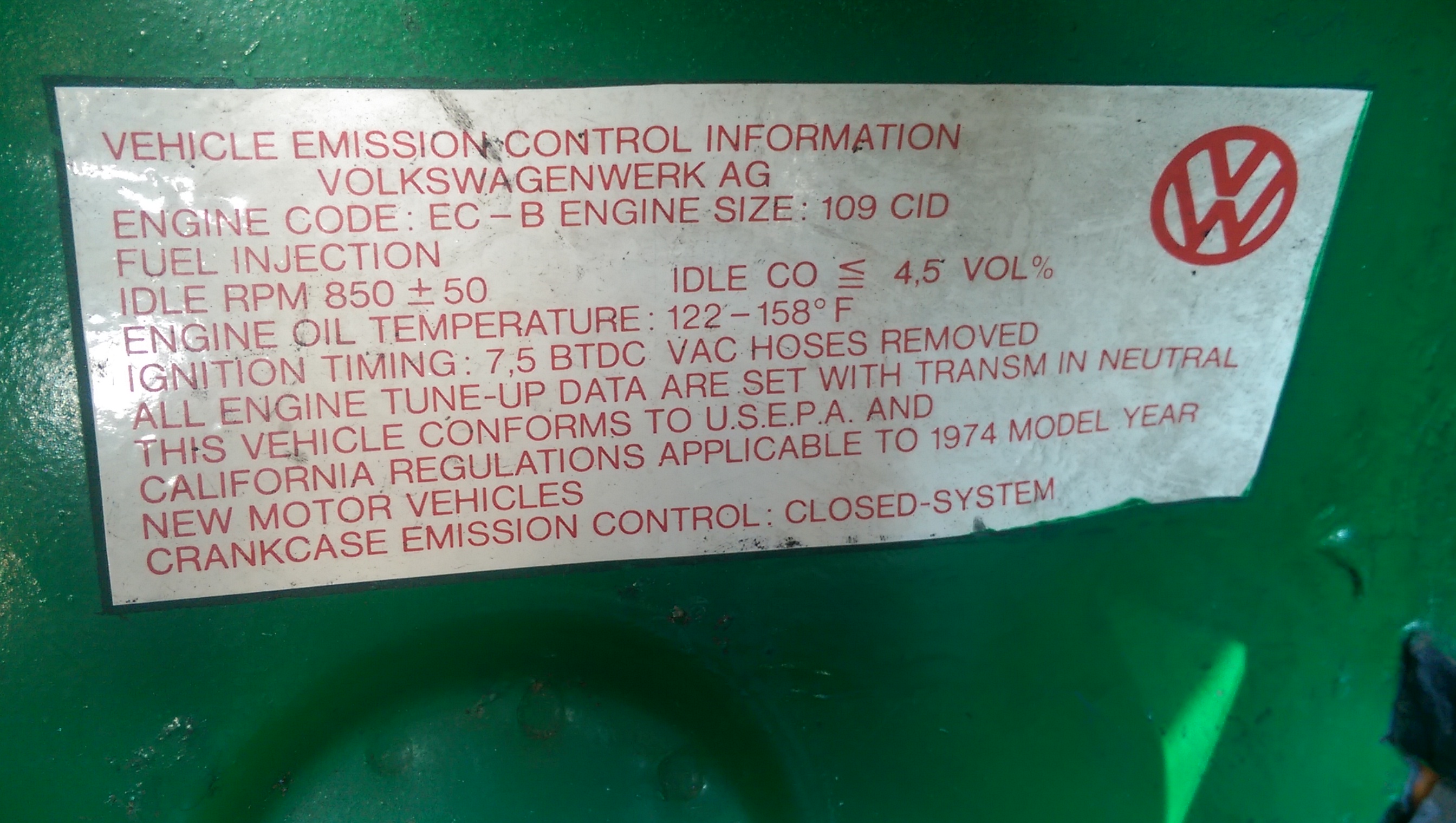 1. 74 MY; Build date 11/73 door jamb sticker 2. EC-B Engine sticker 3. Dizzy: Bosch 231-181-009; VW 022 905 205AA (my notes show VW superceded by 205S). Two-port vacuum can. 4. Throttle body has no visible part number, particularly in same location as @wonkipop ; not under the collar by the ribbed air intake tube. It "may" be on the underside between the vacuum advance/retard hoses, but just replaced that gasket a few months ago (after 47 years) and really don't want to open it back up again. (IMG:style_emoticons/default/sad.gif) Maybe (?) that may be a significant determination? @Big Len: What do you have on yours? @BigLen @Big_Len "@Big Len" 5. ECU: VW 002 906 201G ;Bosch 0 280 000 103 Photos: ![]() ![]() |