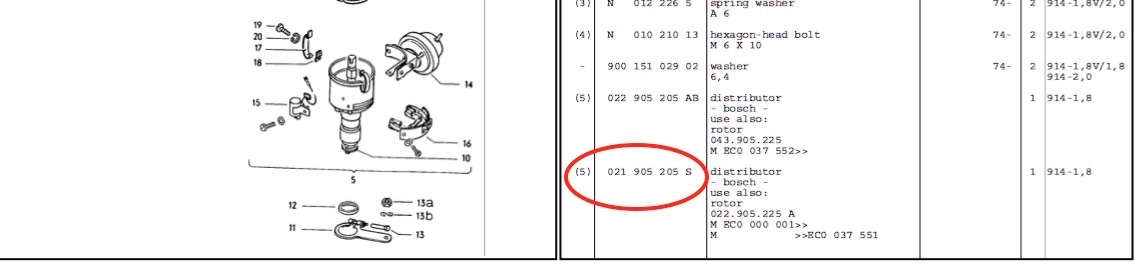 i cracked the mystery of the 021 905 205 S distributor that superseded original distributors (022 905 205AA). you might remember you brought this up back when we started off on the EC-A/EC-B rabbit hole more than a year ago. we couldn't work out the why and the what of the S distributor replacement that was listed. the 021 905 205 S distributor was staring at me in the face. its listed on the original CARB emissions approval documents for the VW 412 and VW 1,8 bus. it is the original distributor for the 412. except its listed as an 022 on CARB docs and as an 021 in the 914 parts manual. i am pretty sure that all that means is that 022 = US 1.8 engine and 021 means european 1.8 AN engine. i believe USA 412 used same distributor as euro 412 and euro 914 1.8. and pics below show what it looks like. VW 412 variant engine bay and sedan engine bay ![]() its a single vac cannister distributor. vac advance only. no retard. 412s did not use vac retard at idle to clean up to pass emissions. they had exhaust gas recirculation. did their clean up at cruise not idle. conclusion. the replacement distributor would do away with vac retard at idle. make the 914 run cooler at idle but dirtier. looks like that was the official VW and Porsche response to NLA double vac can distributors that went out of production. use the vac advance only model to replace. @Van B might have a view on this. ie distributor curve at back off on throttle. but looks like VW just did away with the retard as a replacement part at some point in time - probably after their statutory obligations to emissions warranties and spare parts provisions ceased. 10 years after manufacture? you can also see it in engine bay of 1,8 914 in porsche museum. this is the replacement S distributor they offer. |