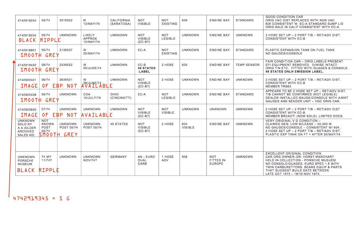 @wonkipop @jeffbowlsby Mine is the smooth gray type; original still in place. Body DOT plate is 12/73; Karmann plate is 5/74. If needed can provide photo and precise Karmann date. details i have on file for your car are as follows steve. vin------09760 date 11/73. from vin sticker photo you had. k plate # = 4839578 = wed 28 nov 1973. where is the k plate 5/74 date coming from? still its interesting it has the smooth grey engine insul pad. i'll double check that one i have listed after your vin as a black ripple back pad. (IMG:style_emoticons/default/beerchug.gif) You are correct. My bad. Don’t know what I was recalling. Thanks! Back pad definitely not ripple. Because it has appearance group? no its not an appearance group thing. the examples suggest its a production line cluster. two of them are only 40 cars apart (see the first page of the spread sheets, the ones that are slightly earlier than yours. no doubt about yours though - def smooth grey. in the end the sample i have whilst it does broadly speaking sample every month is but a drop in the ocean of the thousands produced. i think my sample is suggestive of something but you would need a lot more examples to get to the bottom of it, it could even be that certain weeks on the production line got supplied with the black ripple type. definitely the grey ones are by far the more common type. several of the examples of the black ripple type seem entirely trustworthy and are original cars. i would certainly trust the one in the porsche museum i feel that is a very original car. later on (see last page of spreadsheet) i have two examples that are literally the car after the other. and one has the black ripple. but the one that immediately precedes it off the production line had had its pad removed. that would have been very compelling to have but unfortunately........thwarted. (IMG:style_emoticons/default/smile.gif) its possible that the one after yours on the spreadsheet is not a trustworthy black ripple pad car. its been restored. the pad may or may not be original to the car. so yours might be after the point where they were installing black ripple pads and were installing smooth grey again. very hard to be 100% definitive on the car listed after you. the ones before you seem very definitive though. |