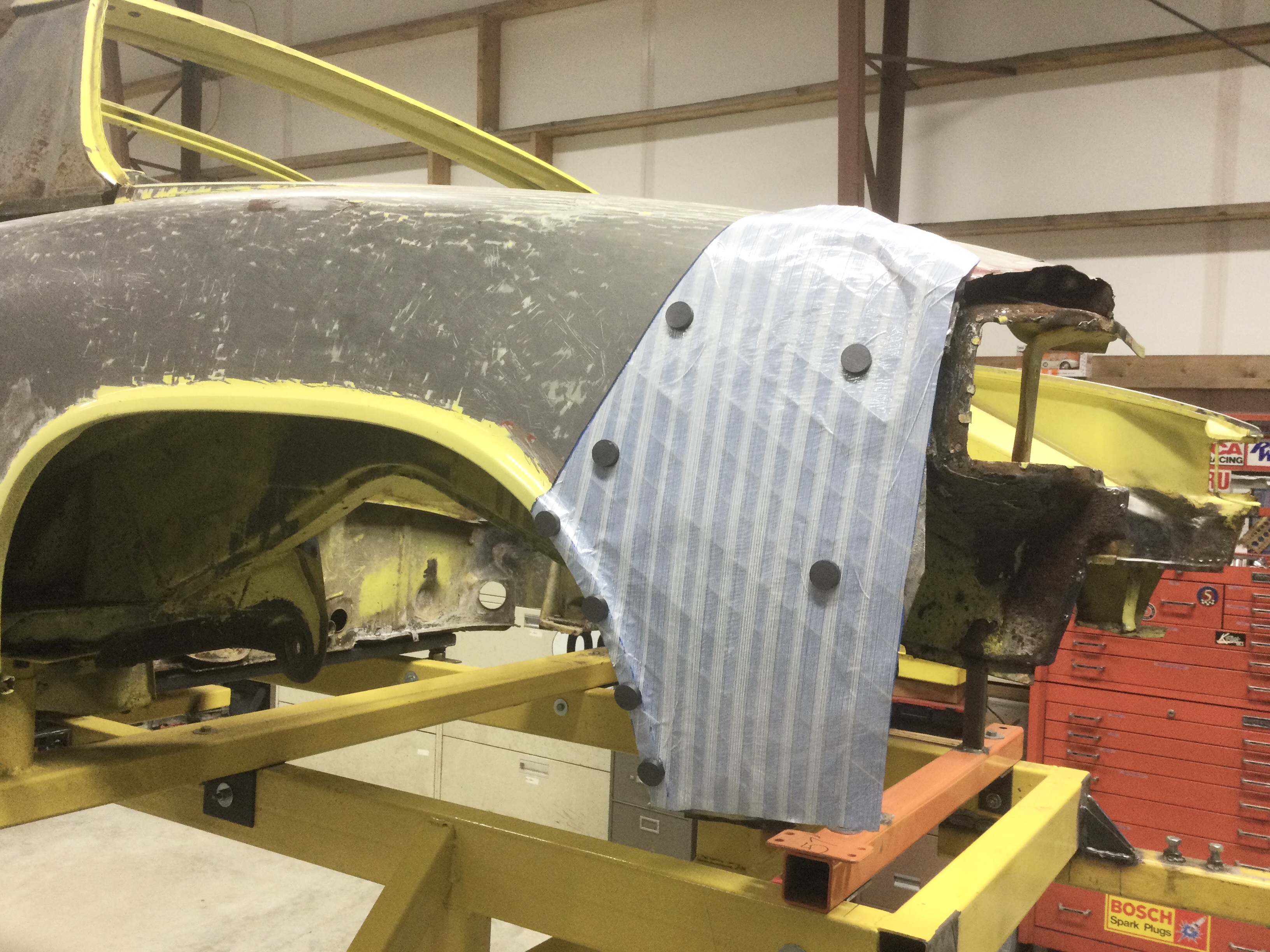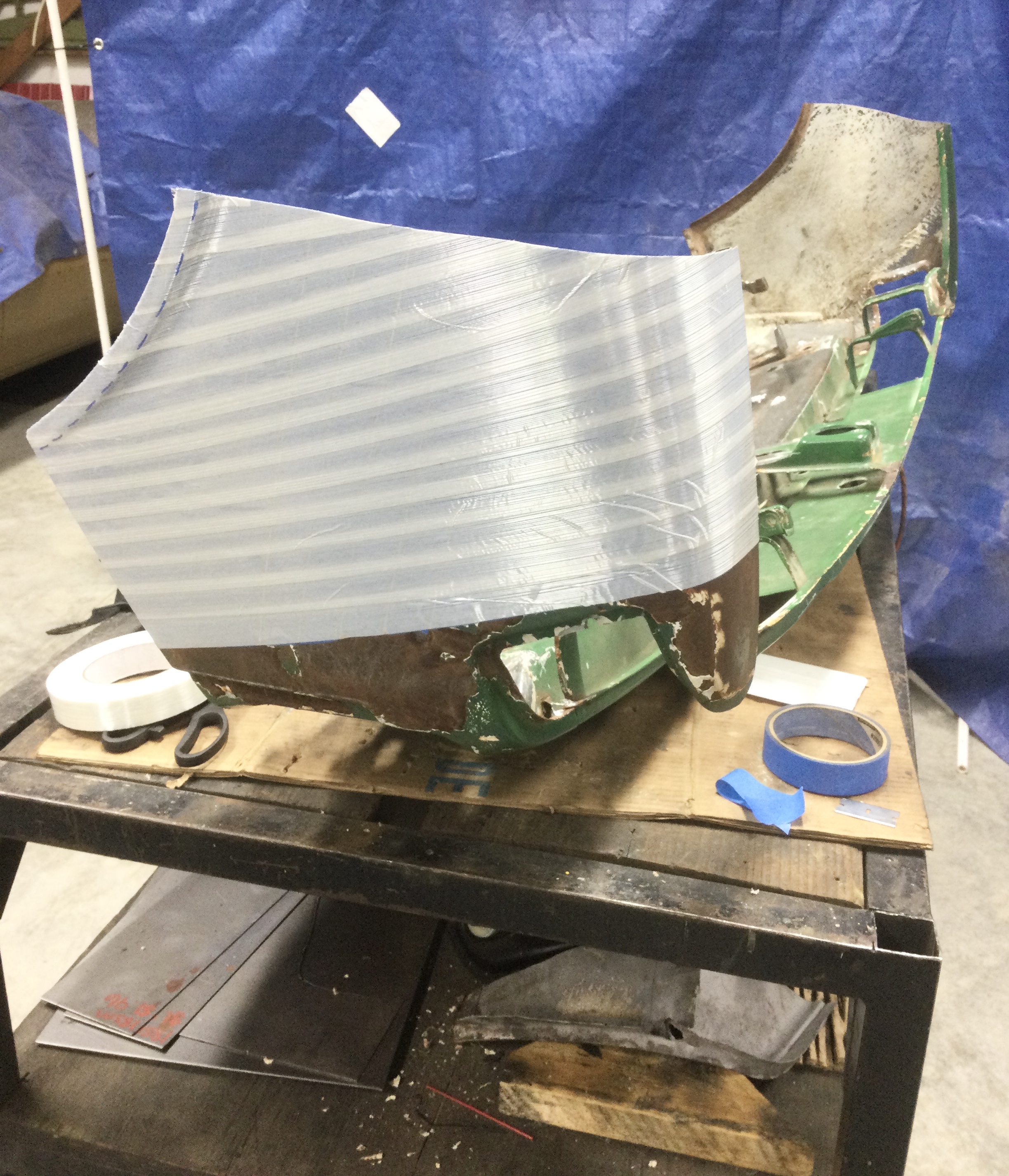 In order to get a decent fit, I made a “flexible shape pattern” of each side of the good fender panels with painters tape & fiberglass reinforced tape. (Got the tip from Wray Schelin’s pro shaper workshop video on YouTube).