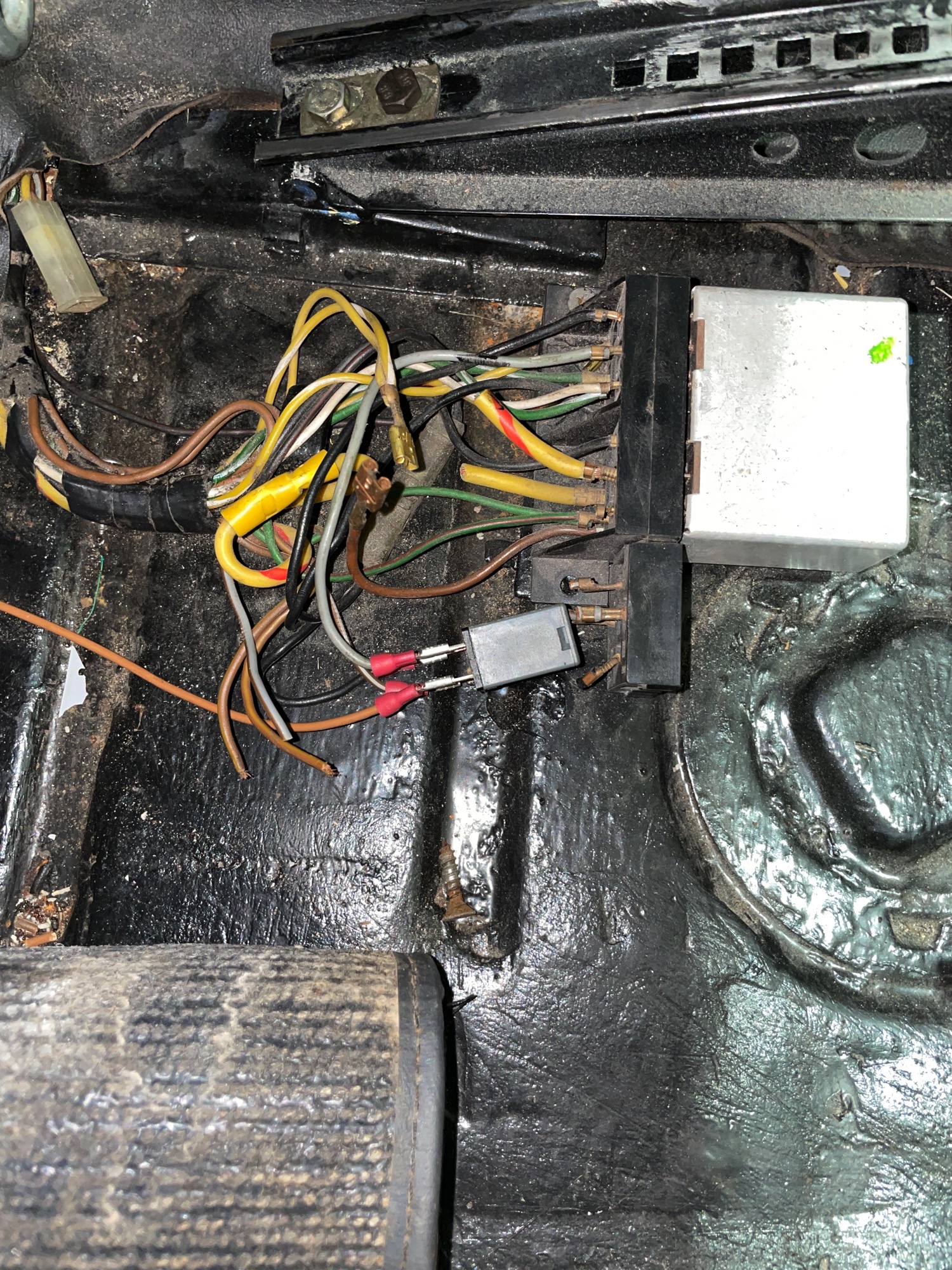 I've had my 1974 914 since September 2021. Lots of good stuff going on with it, Fat Performance 2.4 litre engine with 1000 miles on it, decent body and rust repair etc. Slowly working through correcting minor stuff that needs attention. Most of it is correction of PO not so correctly done work. Mounting a horn in the front wheel well (dry weather only car?), epoxied in burnt out halogen headlight bulbs, wood screws holding headlight retaining rings... the usual not done so right stuff. I pulled out the seats for reupholstering (thank you search function for how to do this) and came across this mess with cut wires and loose connectors etc under the passenger seat. At least someone could have put masking tape on cut and unplugged wires if electrical tape was too much to ask for... this looks like a recipe for blown fuses. Hmmm... more wood screws? Before pulling the seat I used to sometimes hear a faint buzz when the key was in the ignition. I think there is a buzzer in here. I can tell the seat sensors were not connected for the seatbelt warning sign that does nothing (not an issue). Mechanical stuff isn't scary but electrical problems are (can't see those electrons moving). I'm not sure what to search for to see what I am facing. I am guessing some of this may have been related to the engine change? Not sure what the heavy gauge yellow and yellow/red wire do that are permanently connected now. The car has a dashboard switched electric fuel pump and dashboard switched powered fan oil cooler. There also seems to be an non standard relay doing something that a missing relay used to do. From what I understand the brown wires are ground so no real problem unless it touches a non ground wire. Any suggestions what I am looking at and what to search for? Attached thumbnail(s) |