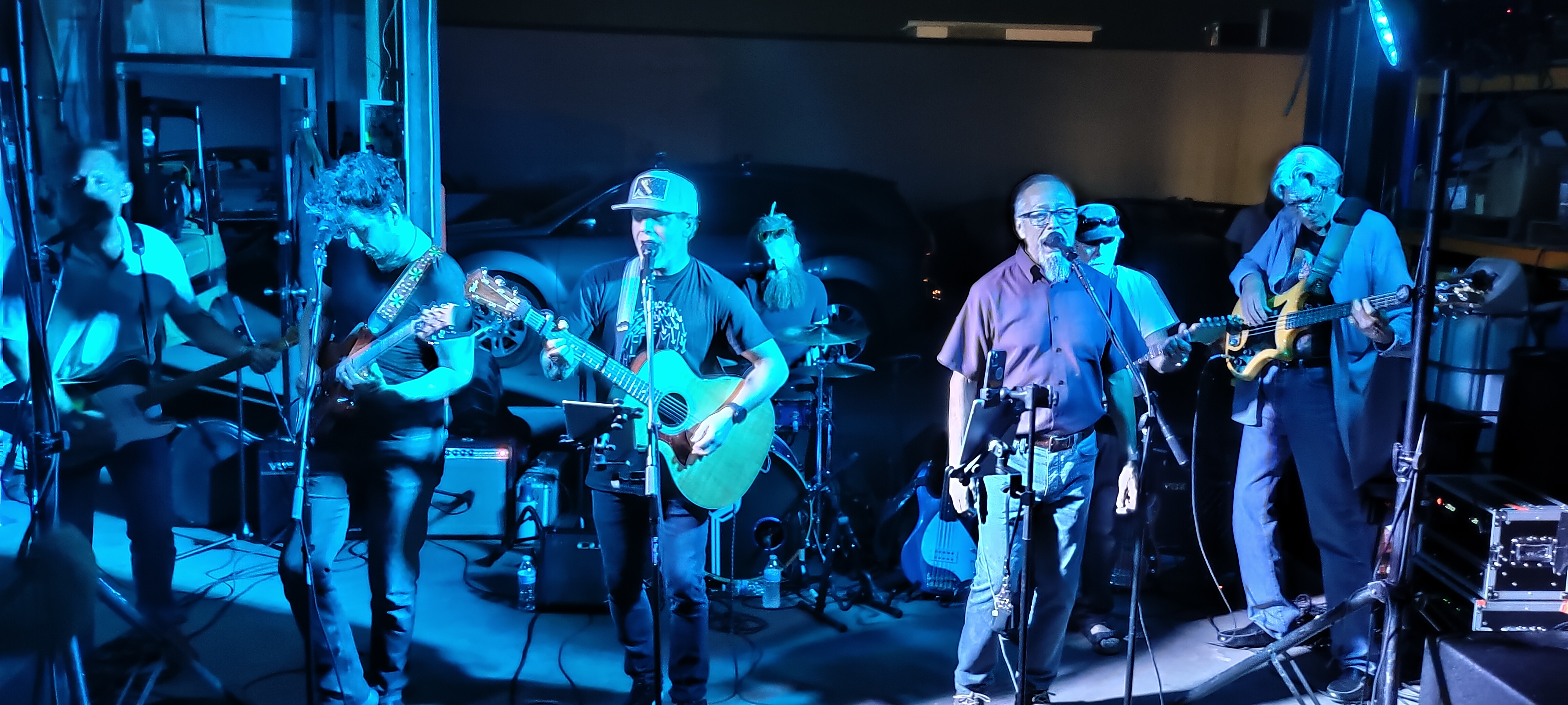 The band expanded to include a few "extras" Eric far left kept in the shadows. Can't see me, I'm behind the singer Saw your foot. Unmistakable. Thanks so much for posting these photos. Time passes slowly up here in the mountains, but really fast for me. So, it is nice to be able to look back at a runaway awesome tour in your pictures. |