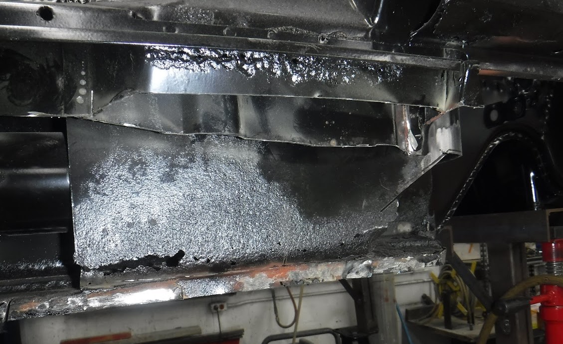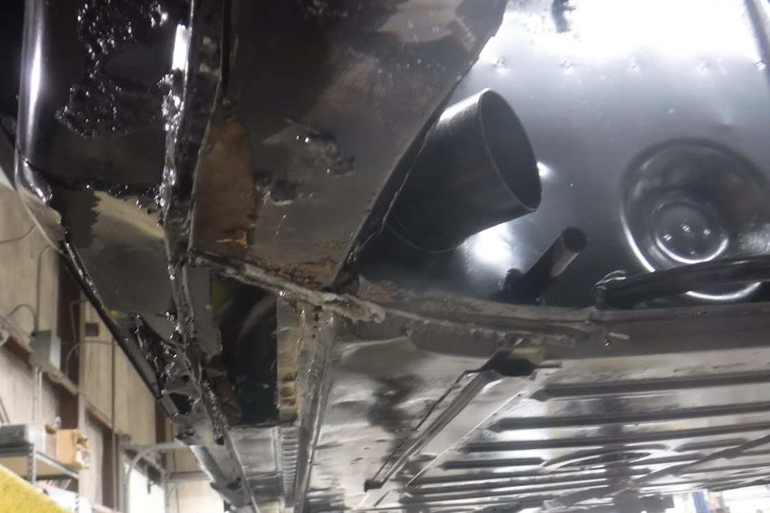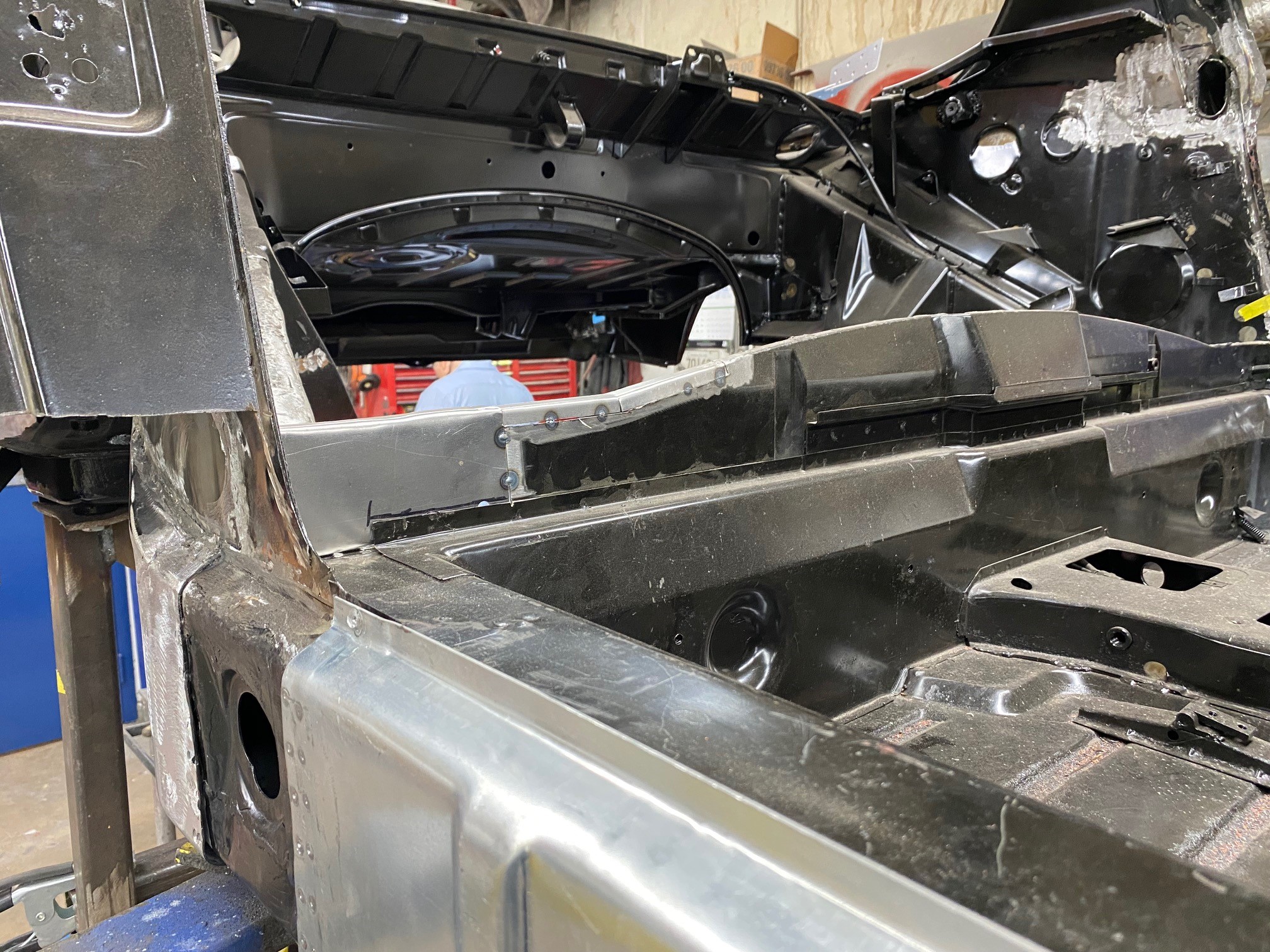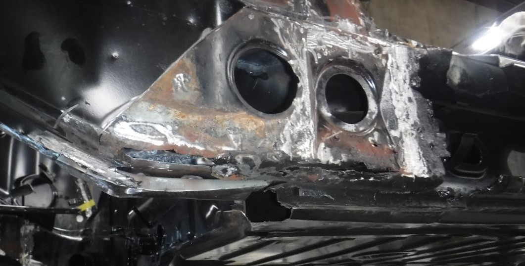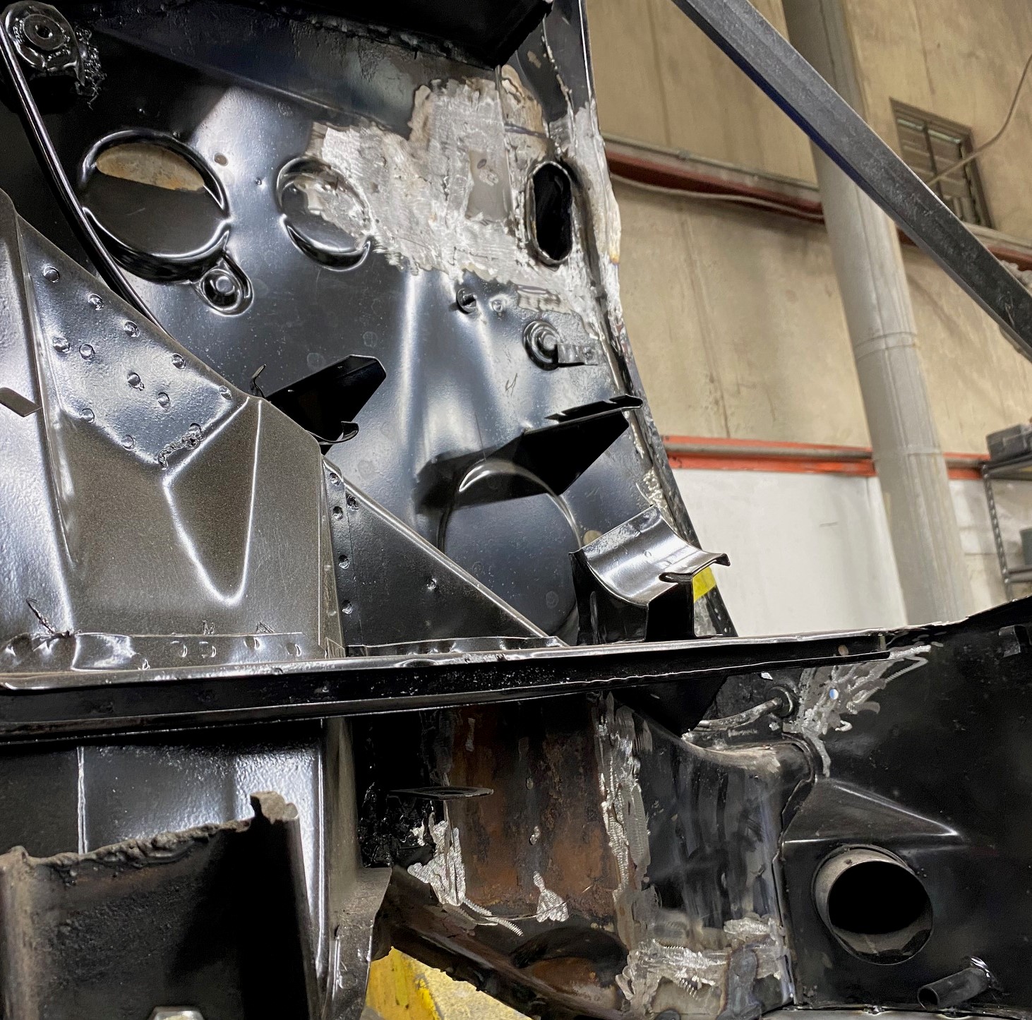 More progress on rust repair at Auto Associates. Engine bay L&R (hell hole) side rust repaired. Heater tubes reinstalled and outer longitudinals being replaced. Interesting note on the acid/e-coat dip. We have found some spots where neither the acid nor the e-coat penetrated. Fortunately, these areas also had only light surface rust.