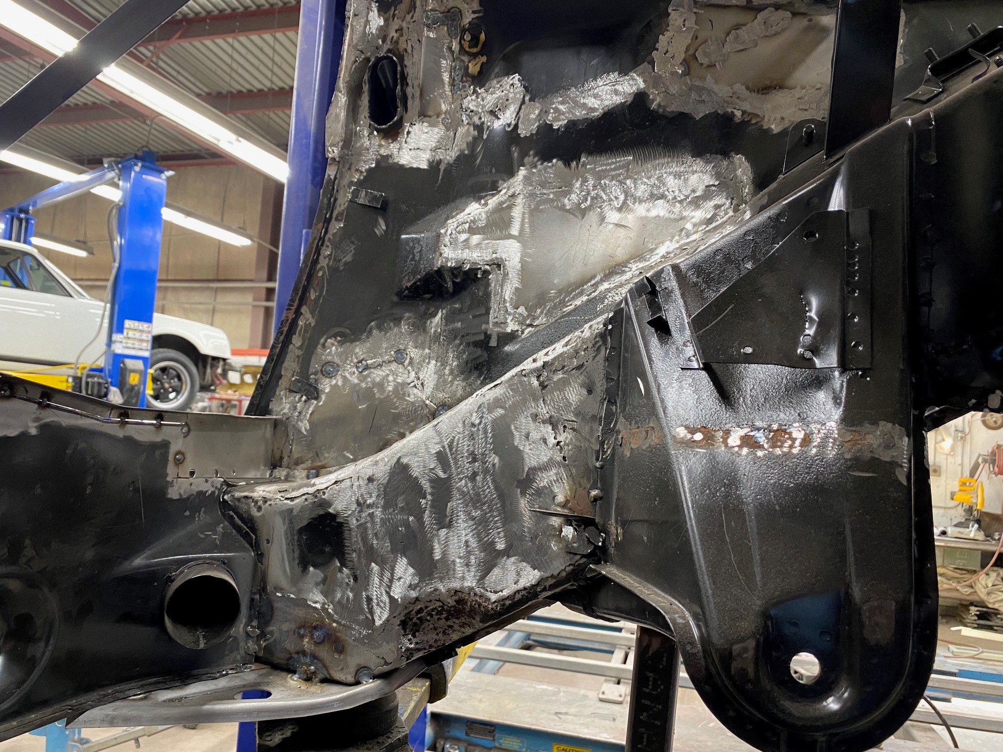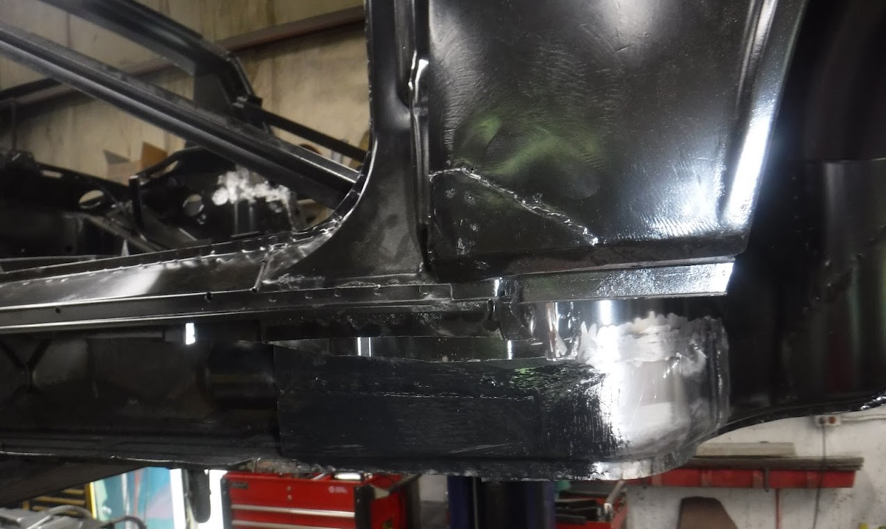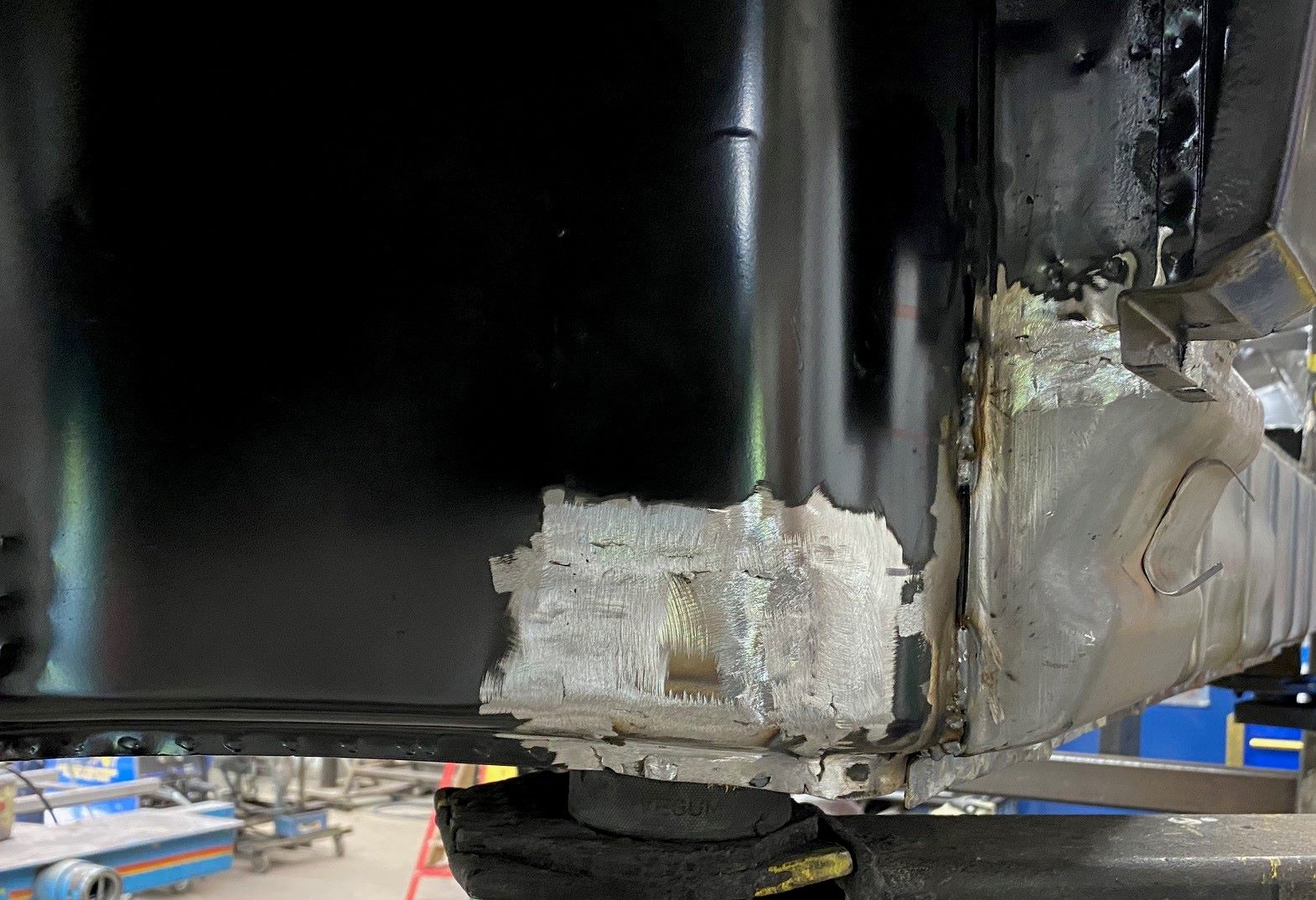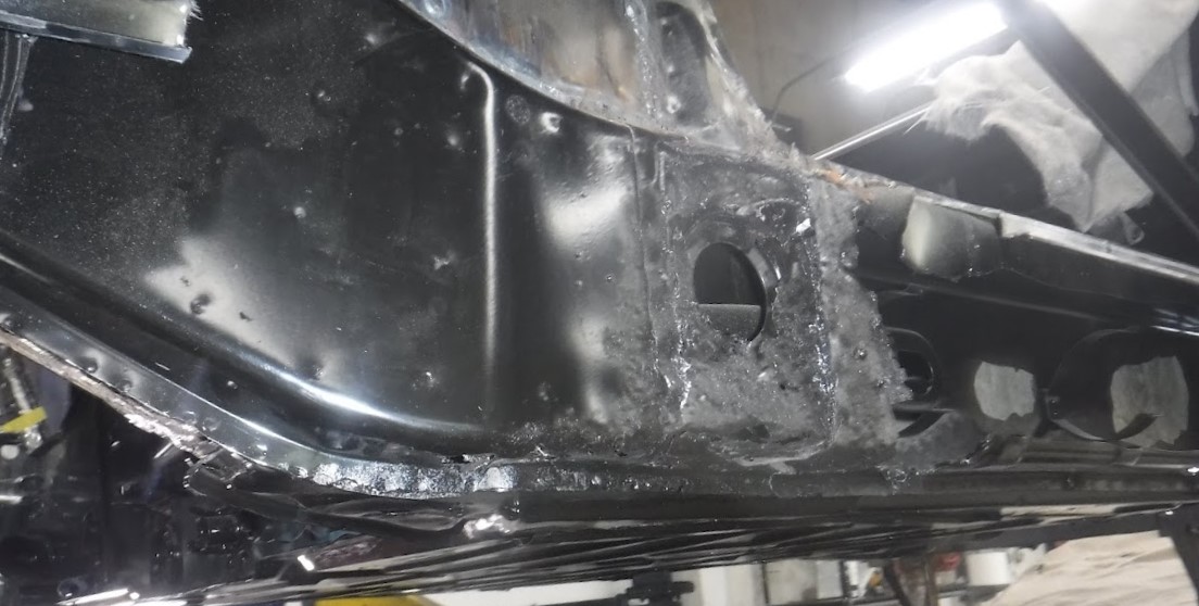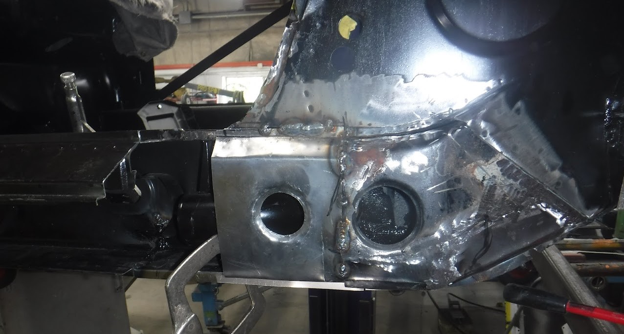 More progress on rust repair at Auto Associates. Engine bay L&R (hell hole) side rust repaired. Heater tubes reinstalled and outer longitudinals being replaced. Interesting note on the acid/e-coat dip. We have found some spots where neither the acid nor the e-coat penetrated. Fortunately, these areas also had only light surface rust.