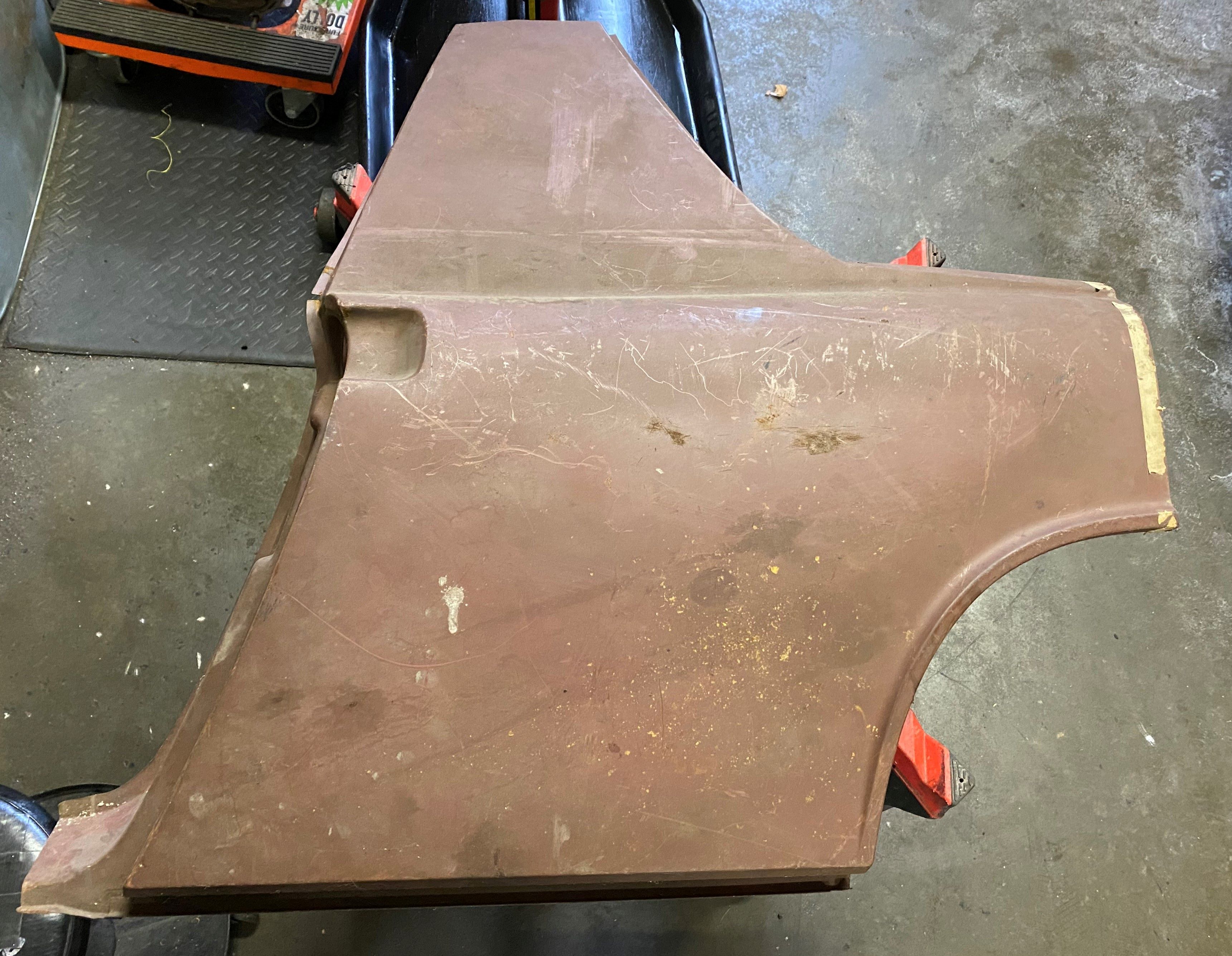 I was able to find some good replacement panels. A LHS sail/rear quarter at Carlisle and a rear panel from our friend Chris Foley. We will use only the taillight section of the rear panel. However, if anyone has a good RHS sail/rear quarter panel like the LHS I found, we could make good use of it.
