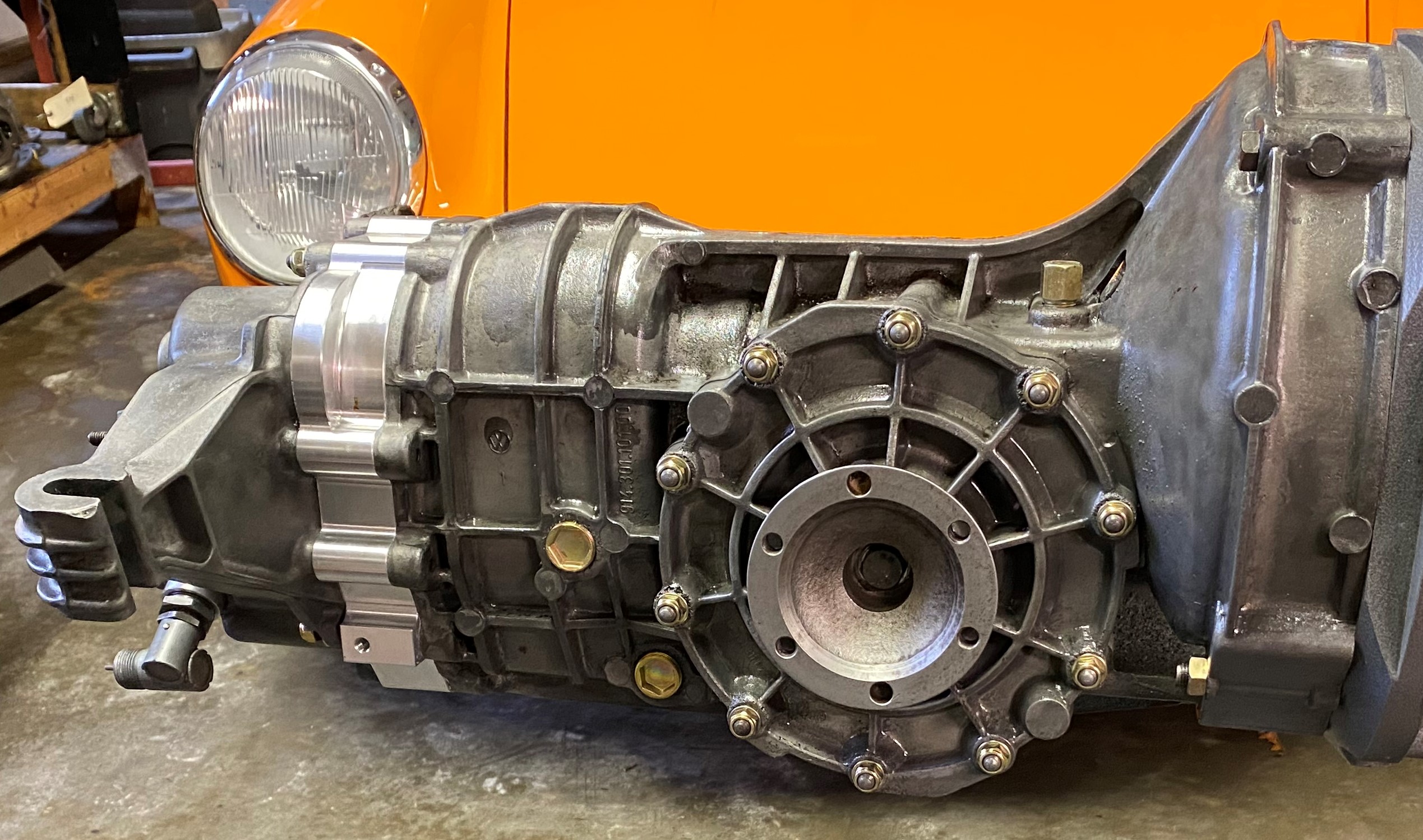 In the meantime, the original '73 side shift gearbox has been rebuilt with a billet Al intermediate plate and 108 mm output shafts to mate with sway away axles and 911 108 mm CV's. The intermediate plate was drilled and tapped to accept the 914-6 throttle bell crank. The gear box will also get the Tangerine Racing precision shift coupler.
