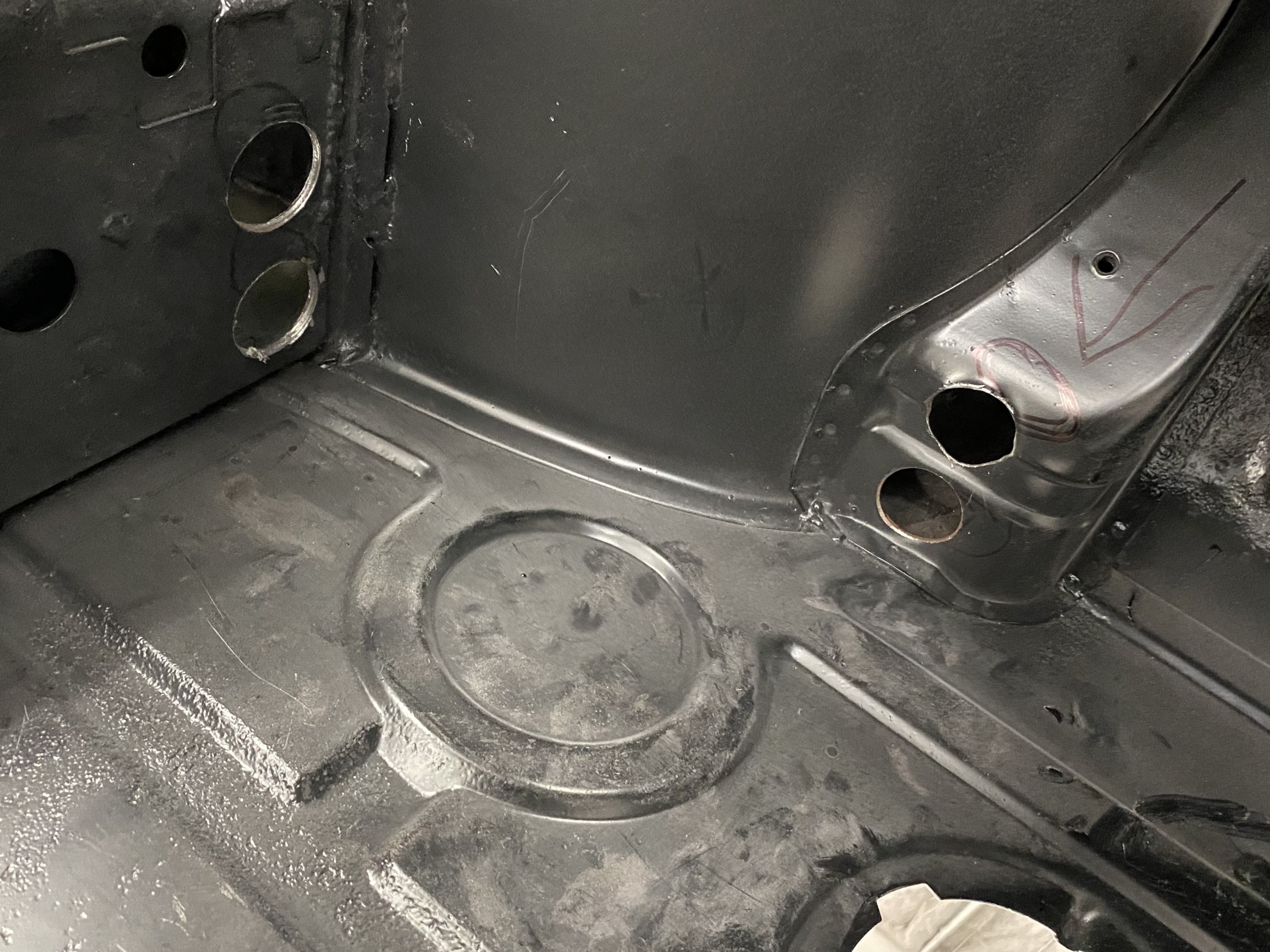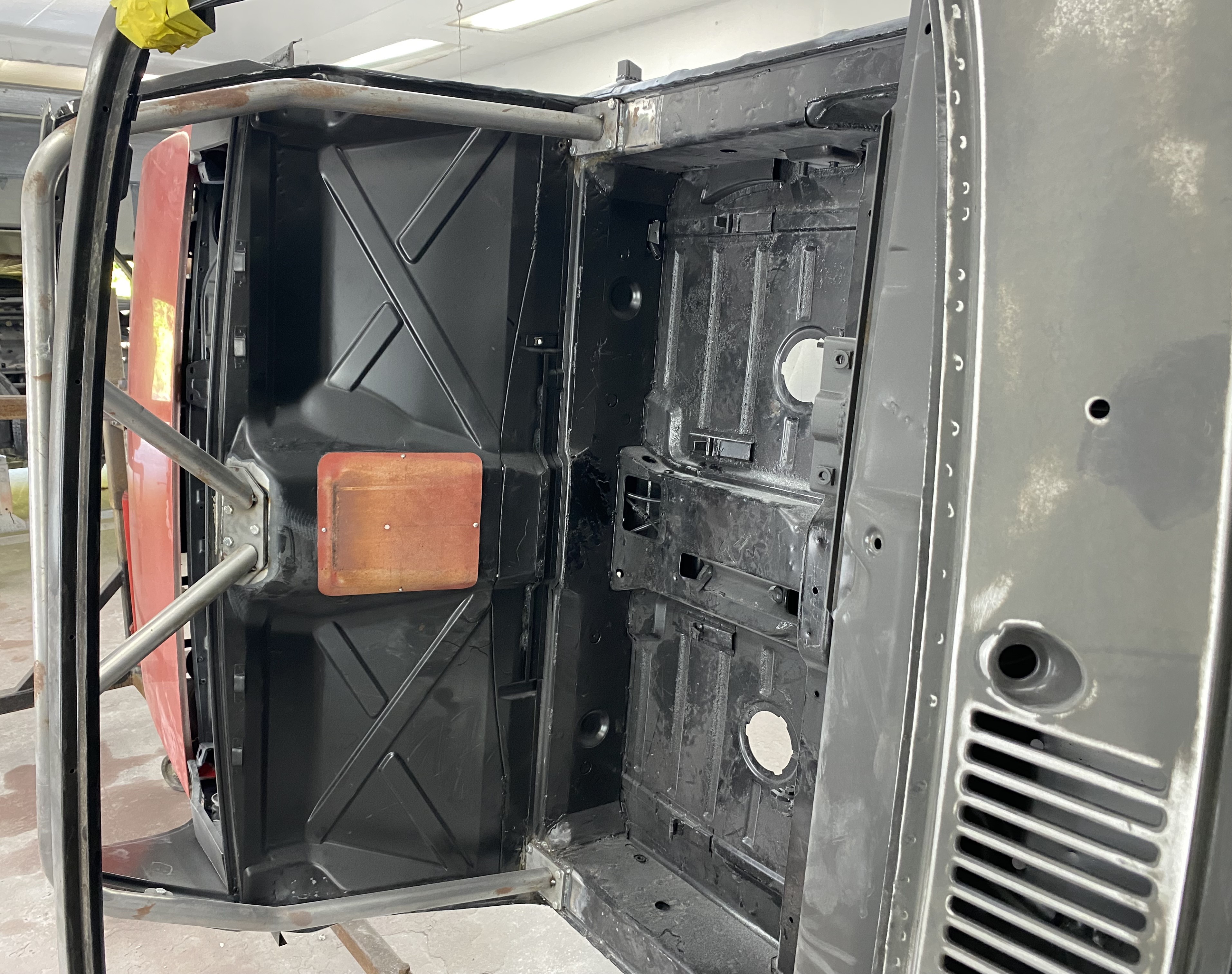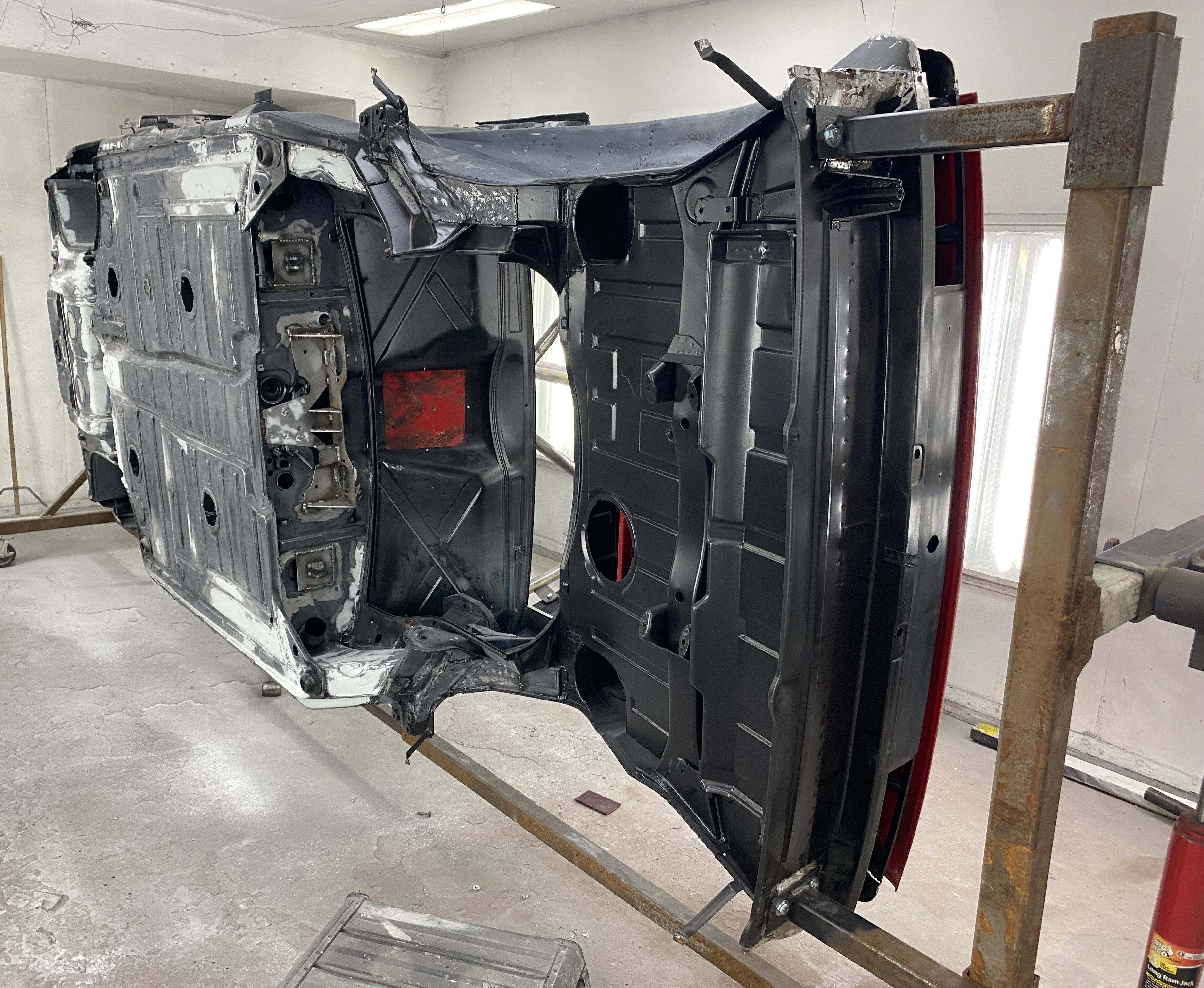 Another trip up to Auto Associates today to check on the project. The chassis is getting some final touch up before another coat of epoxy primer, then light undercoating on the floor bottom and backsides of the inner fender wells. Then the undersides, front trunk, engine compartment and rear trunk will get final paint in Lizard Green. After that, sometime in October, the car will come back to me for mechanical and electrical assembly including the engine build and installation. The plan is to get the car in running condition before it goes back to Auto Associates for final body work and paint including the installation of the GT flares, both trunk lids and doors. This will ensure the flares are properly aligned with the wheels & tires and the door gaps are set perfectly.