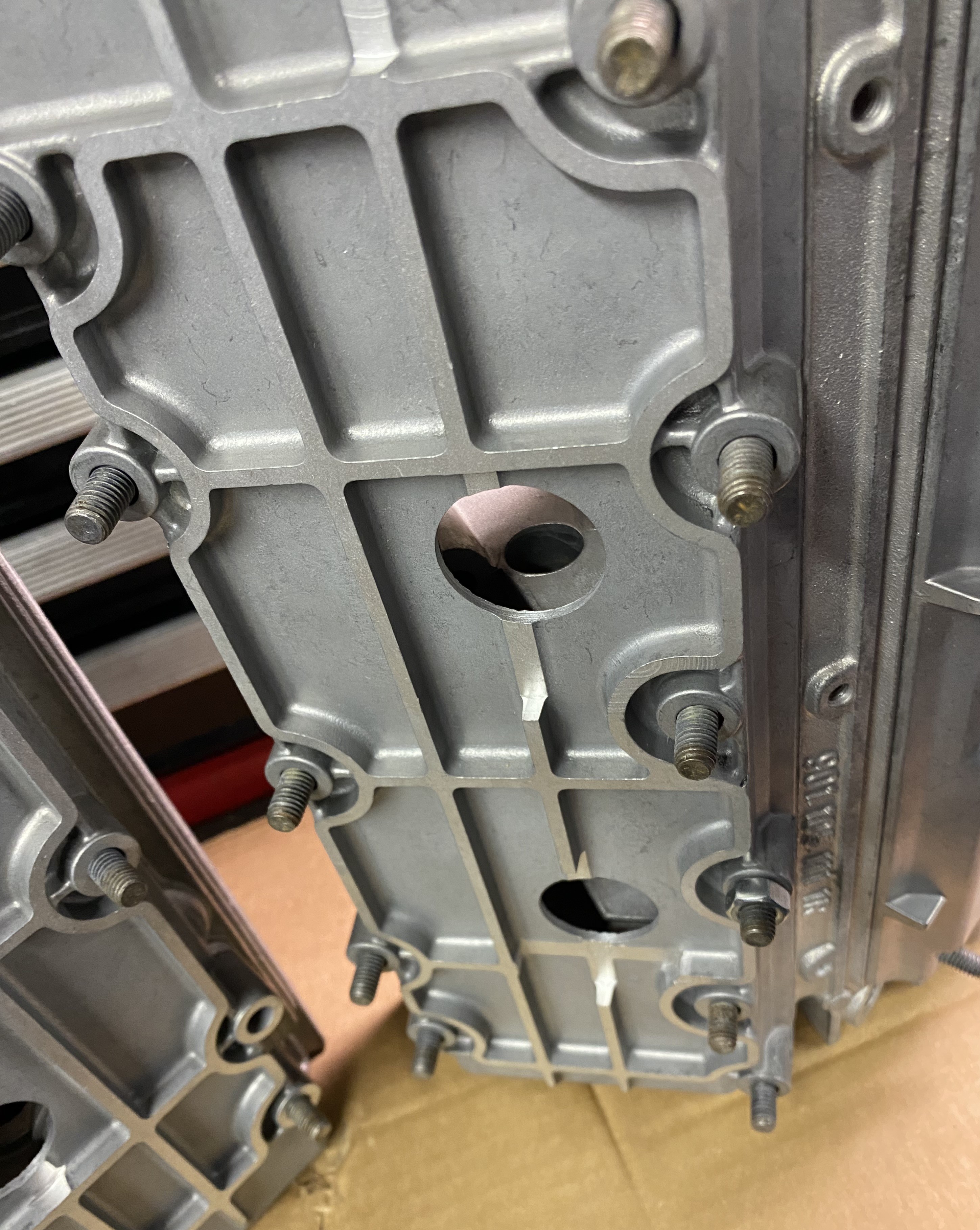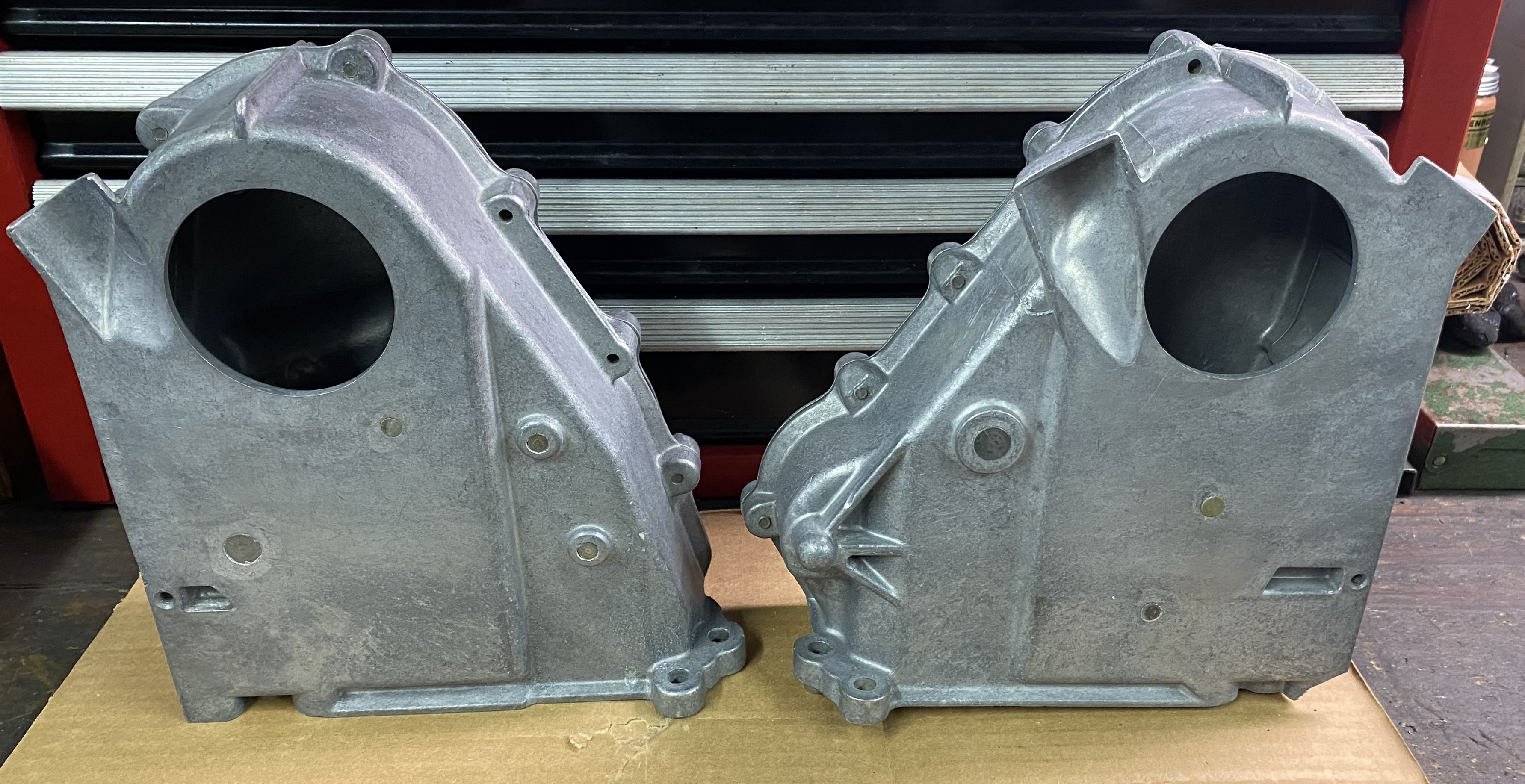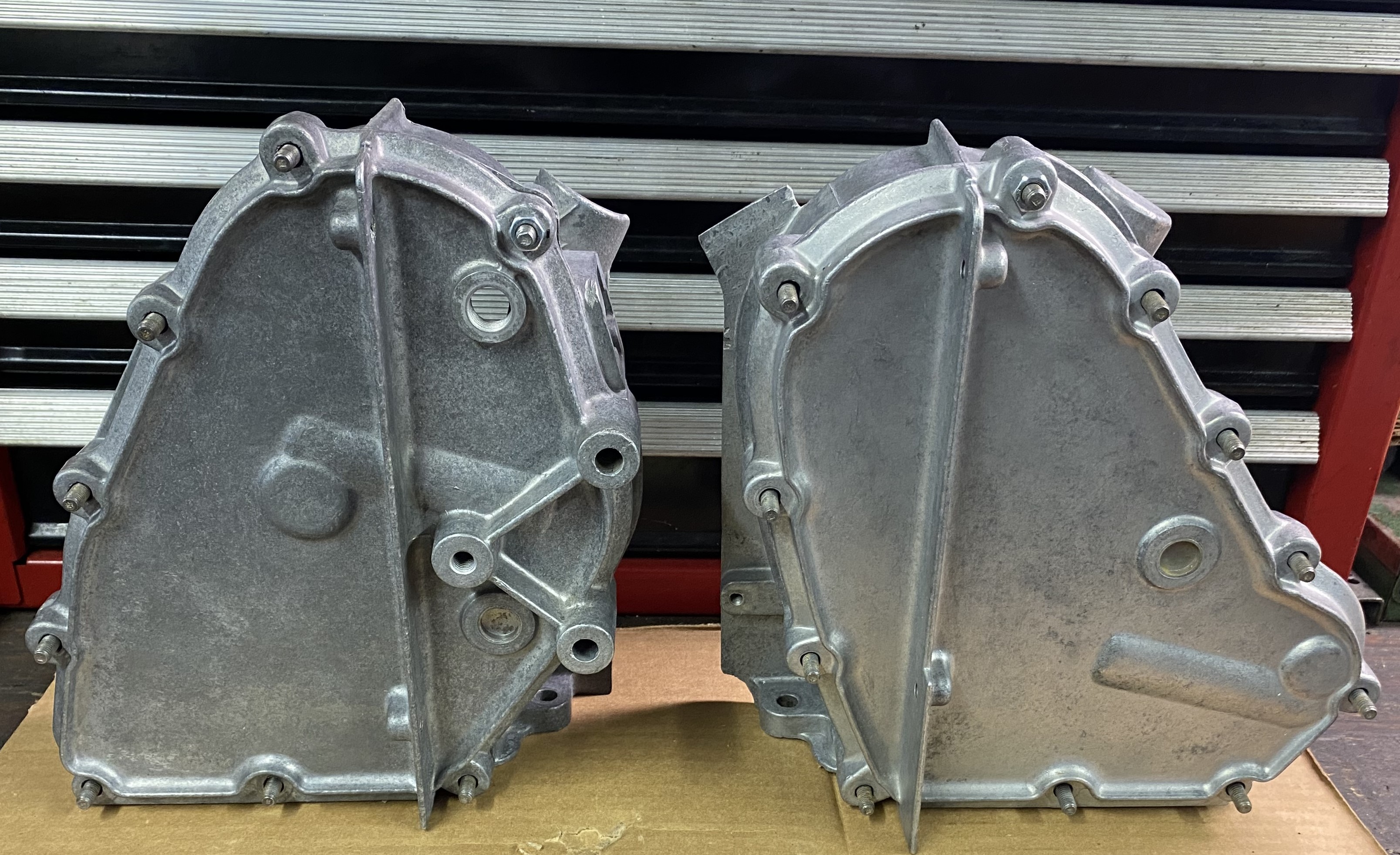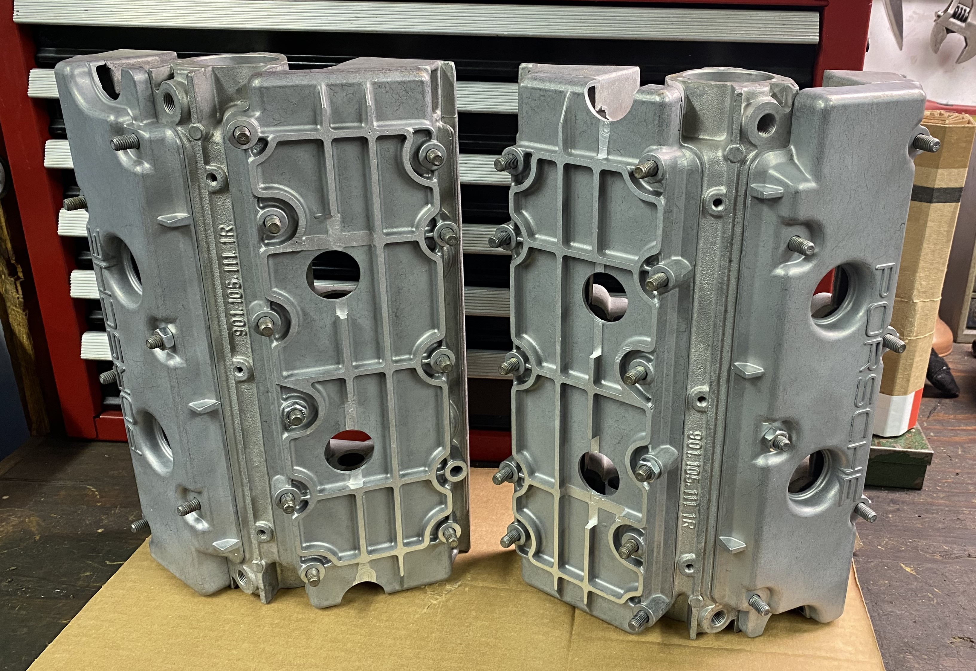 Cam towers and valve covers. Lower covers were drilled for twin plug, and the ribs were milled to allow added clearance for ease of removal. Both upper and lower covers were tumbled and resurfaced. The cam towers got new plugs and spray bars and were also tumbled. |