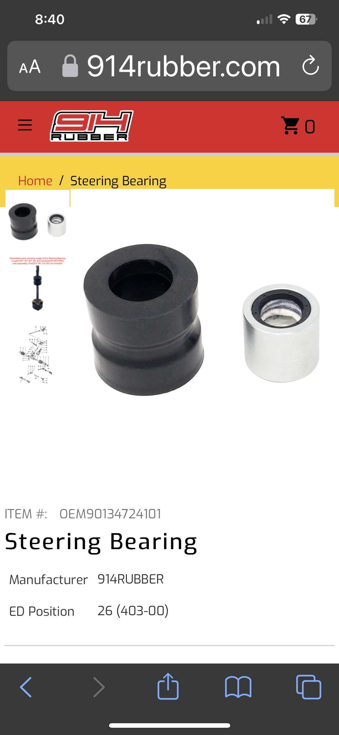 Thanks Mark Any idea what that part is and where to get one? I may be missing something here but this is what came to mind when I saw your first post. Pretty reasonable price at 914 rubber. I think that is the rubber, two-piece steering bearing that is clamped to the chassis shown in my photo. The parts diagram shows it as two separate pieces but they fit together. |