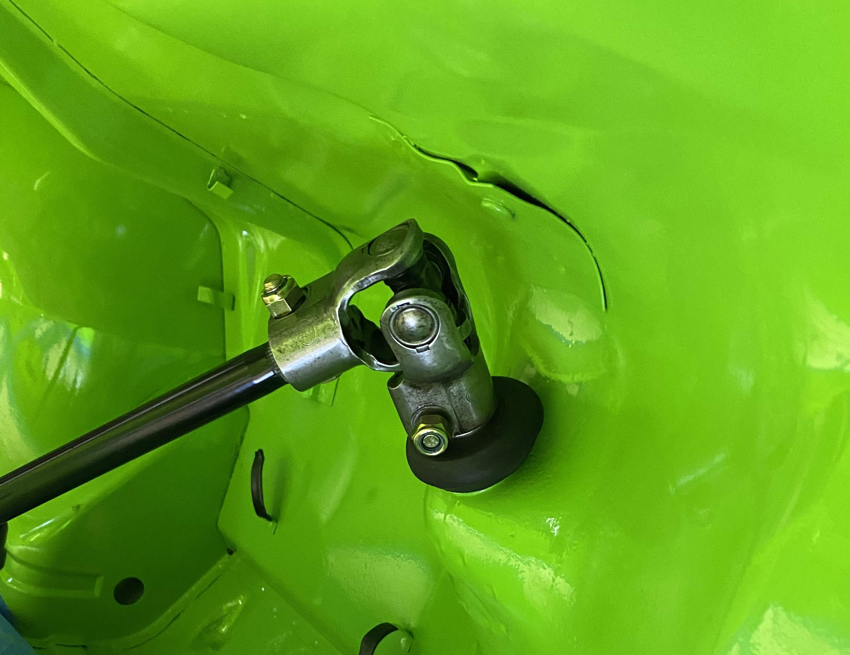 Tom the black collar/bearing that slips over the first shaft on the rack should press against the tank side of that hole. I has a small lip to form a seal there. Could it be reversed ? I think you'll have to lower the rack/crossmember |