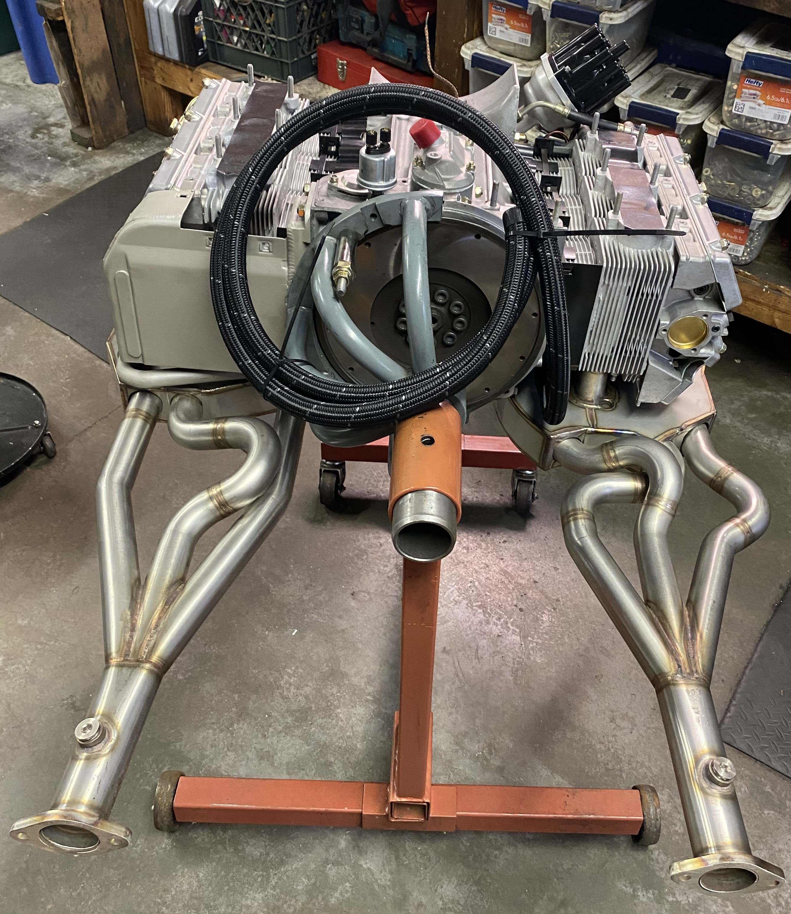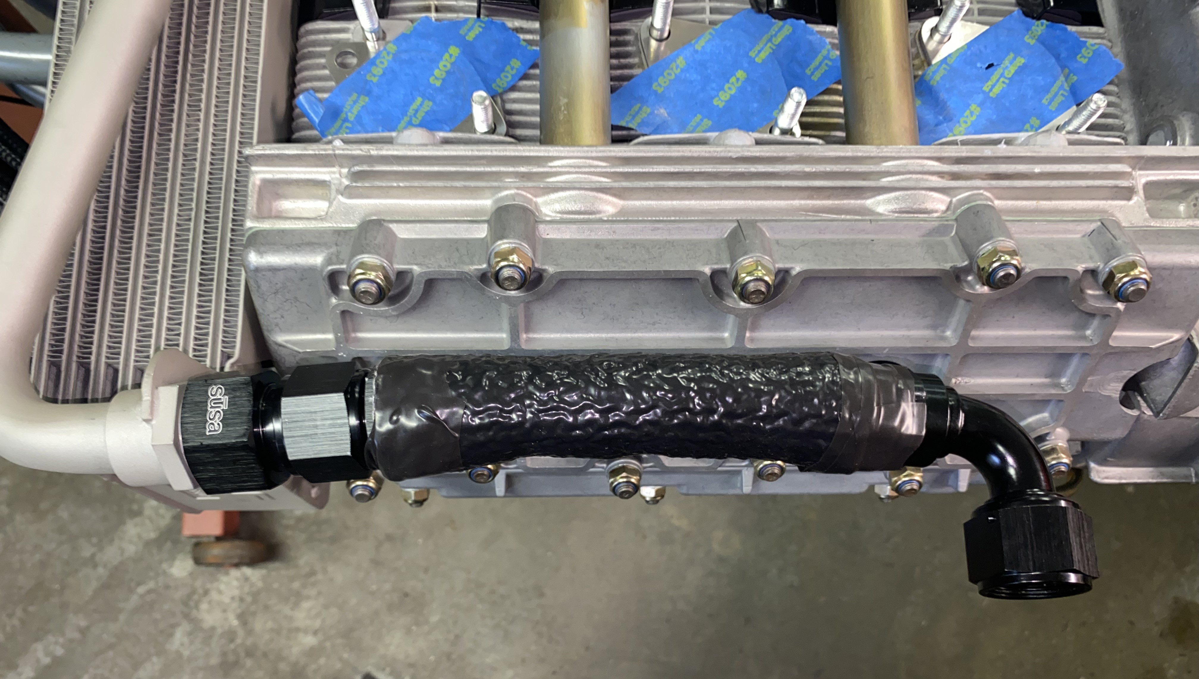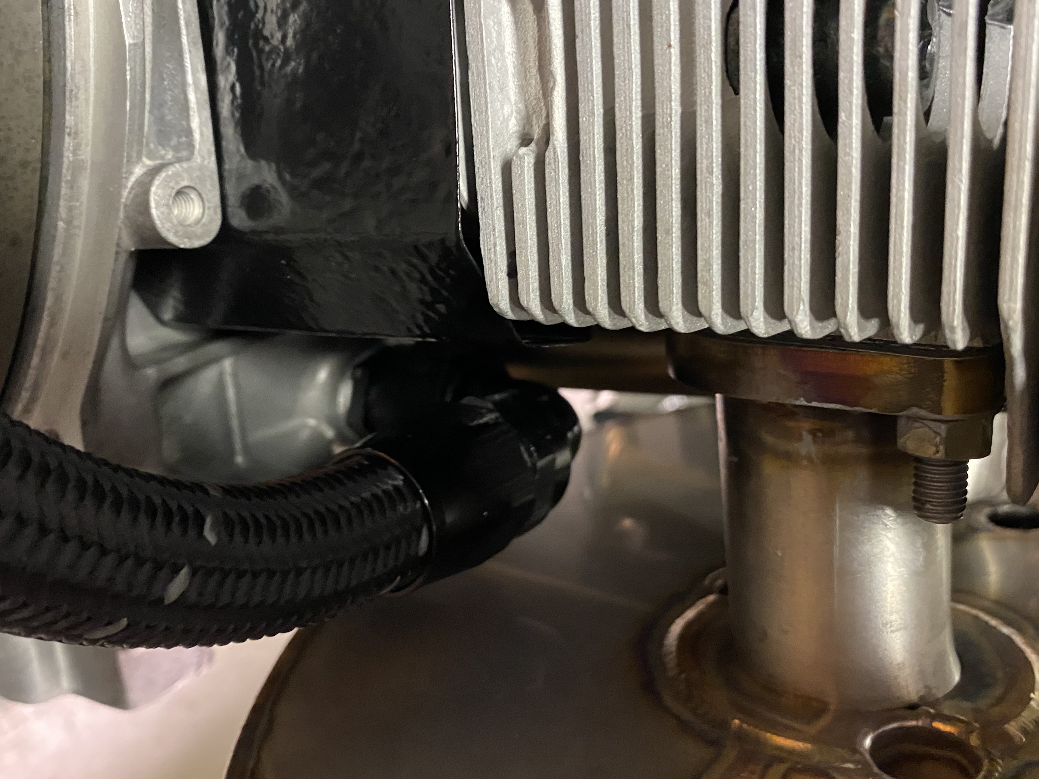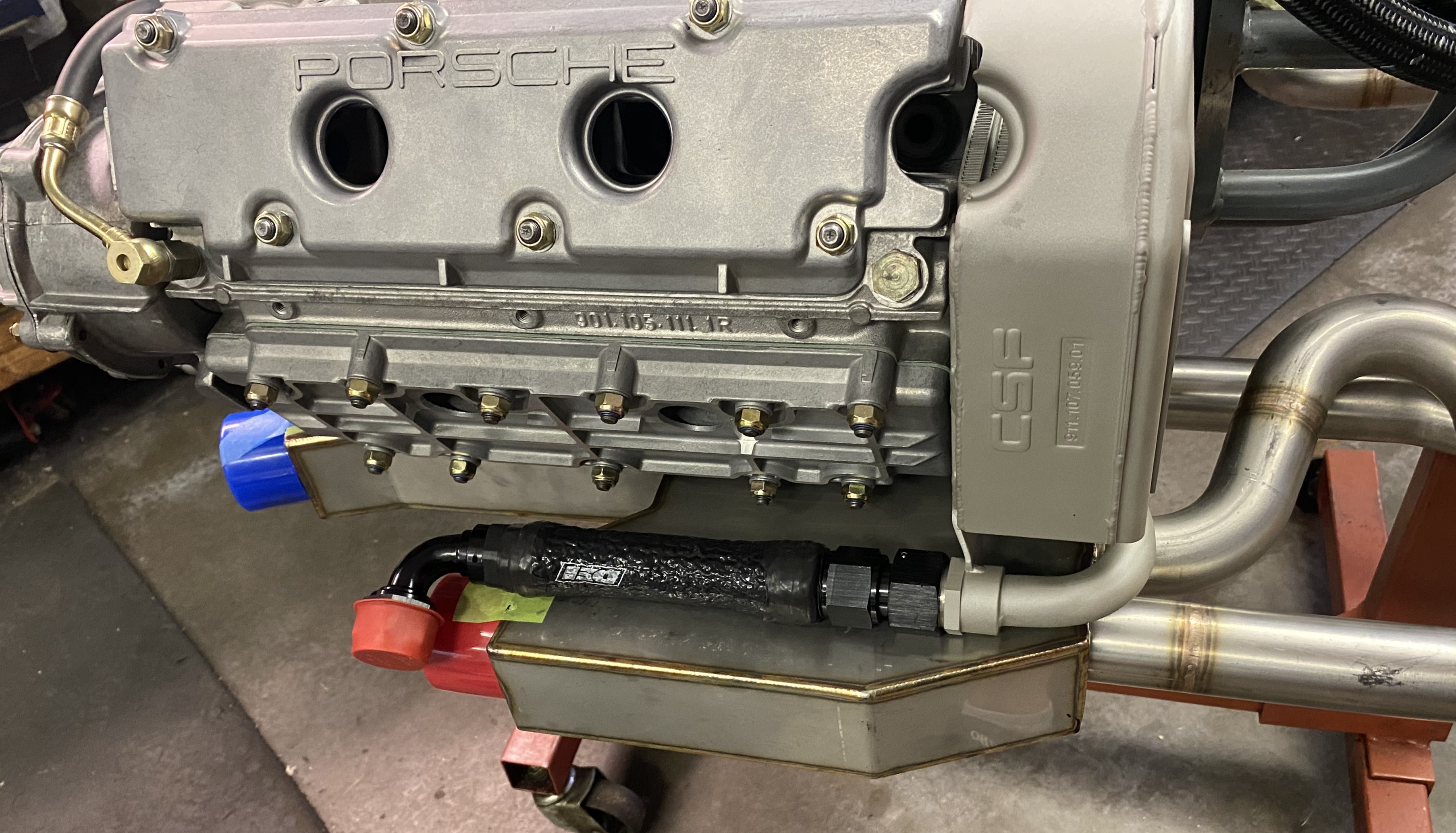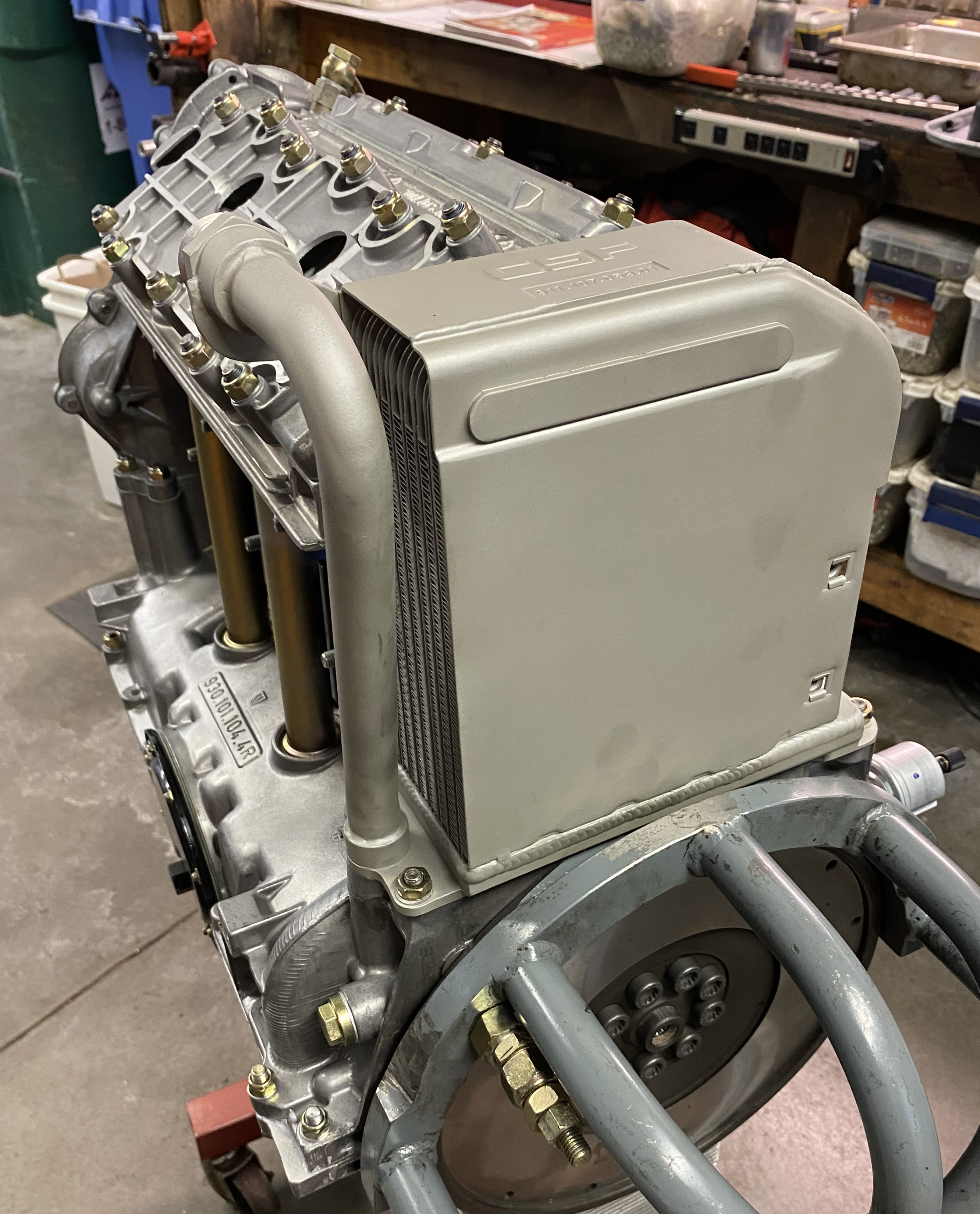 Some more progress on the engine. Installed the oil scavenge line. I plan to run this over the rear of the engine/transmission to the external t-stat much like the early 911. I also installed the RHS heat exchanger. Thank you, Ben McFarland, for the beautiful workmanship on the heat exchangers and for the oil line hardware and plumbing suggestions.