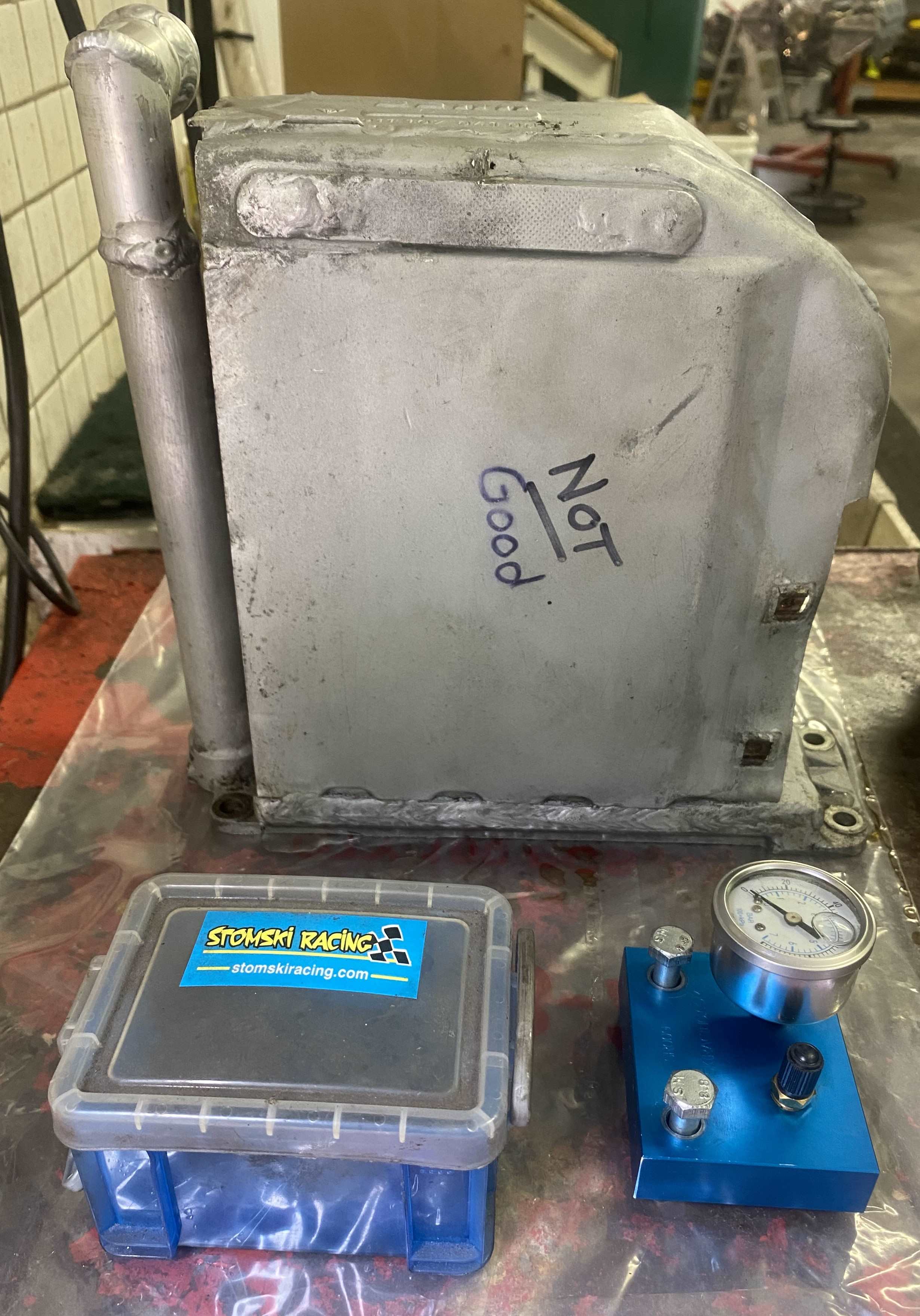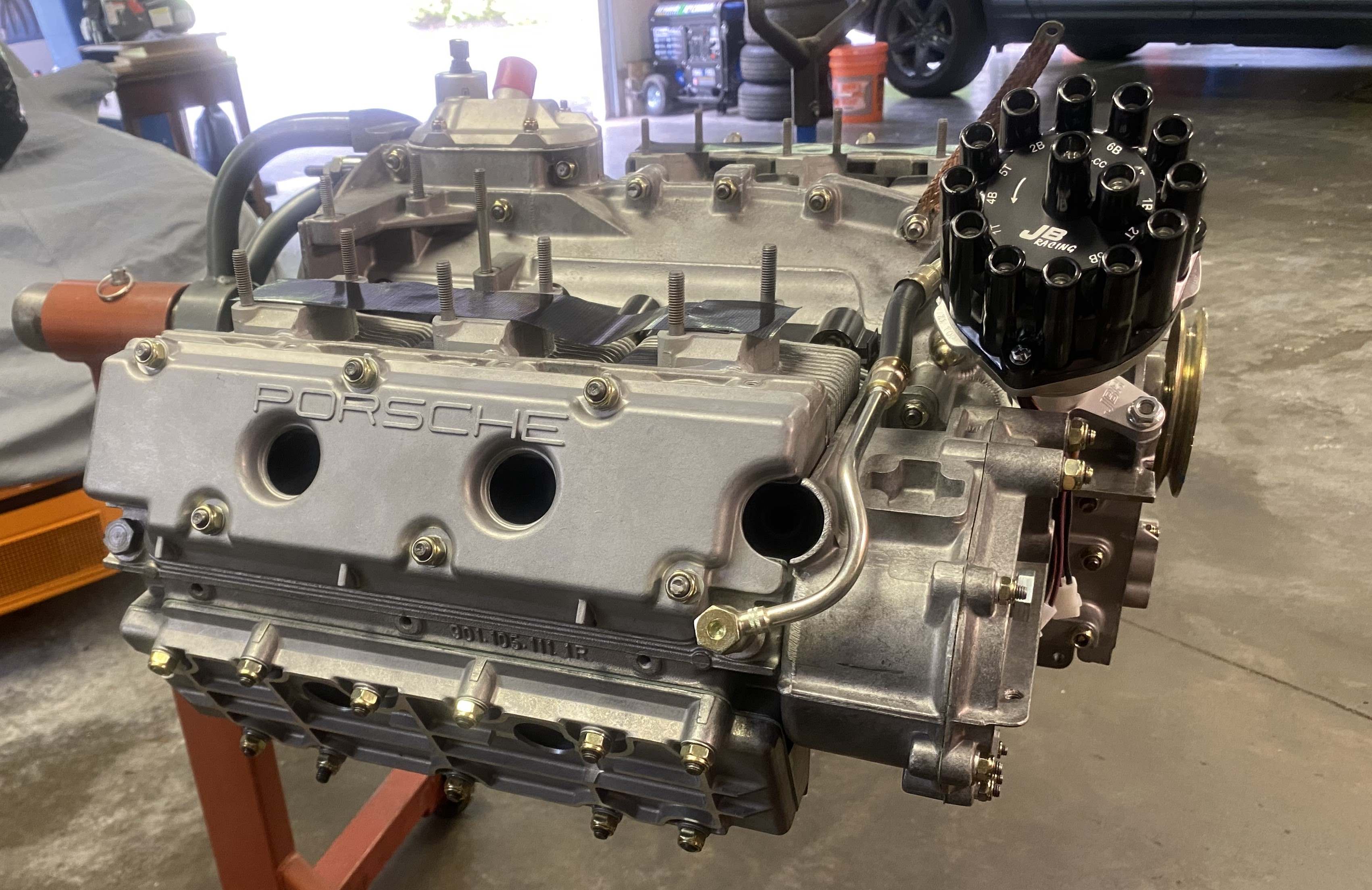 I did the piston-to-valve clearance check by screwing in the intake and exhaust valve rocker adjusters on cylinders 1 and 4 by 1.5 mm and 2.0 mm respectively and then rotating the engine through several revolutions to check for interference. No interference between the pistons and valves means that there is at least 1.5 mm intake valve clearance and 2.0 mm exhaust valve clearance. After assuring adequate piston-to-valve clearance I installed the JB Racing billet twin plug distributor and set the top rotor to the Z1 mark on the distributor while the engine was at TDC of the compression stroke for cylinder #1. After this, I installed the remaining rockers, adjusted the valve clearance and installed the valve covers. I then decided to recheck the engine oil cooler for leaks. I planned to use a 911 cooler that was modified for the 914-6 configuration with a welded in elbow. I had checked it with the Stromski pressure tester before sending out for the -6 modification and did not see any leaks. However, upon rechecking it, I got plenty of air bubbles. So now I need to find a replacement 914-6 style cooler. |