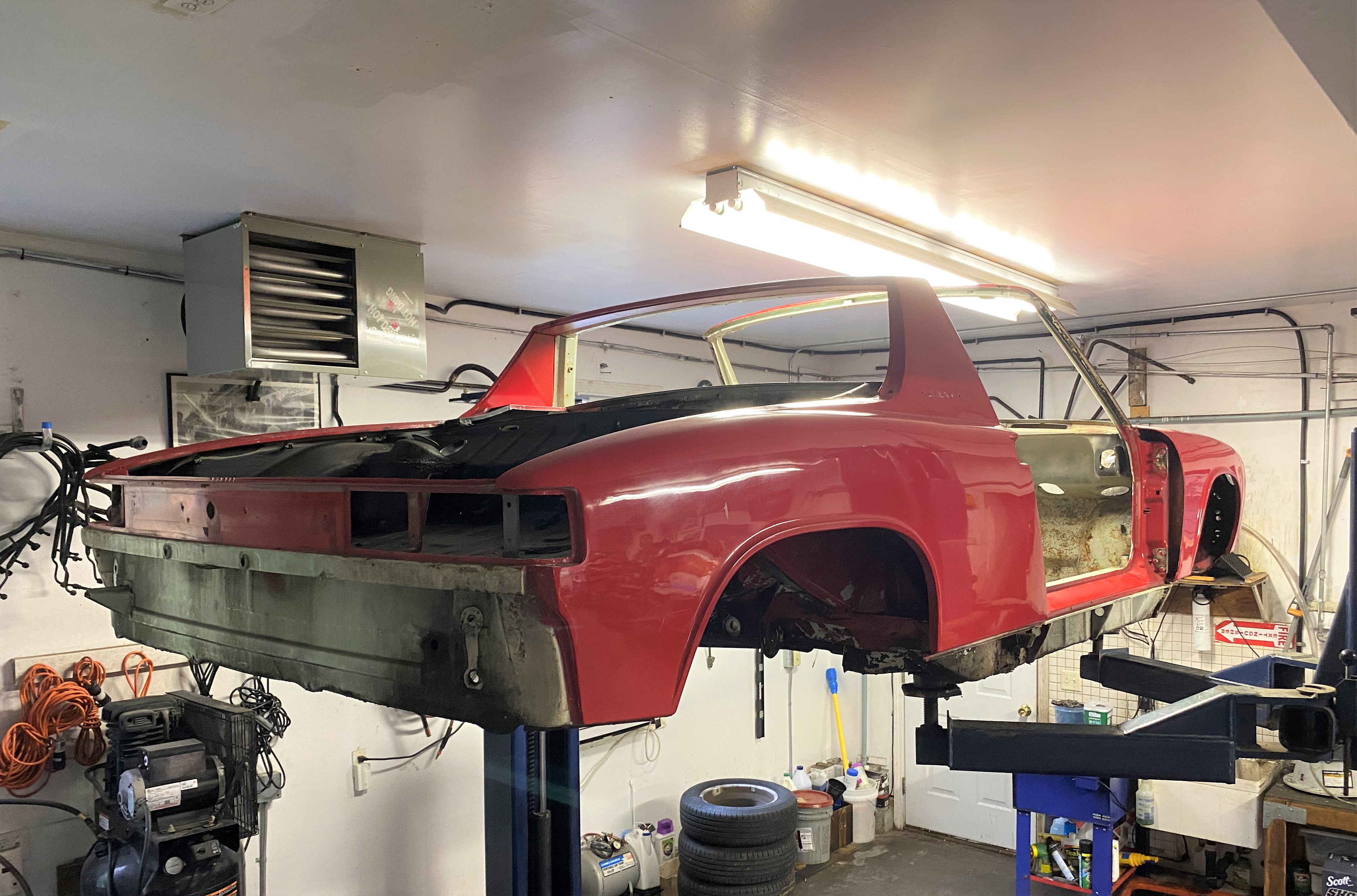 Time for an update on my GT project. After a long delay while waiting to clear garage space, I sold my 1970 911E restoration and moved the 914 from the basement to the garage and onto my lift. The car is now stripped to a bare shell. After consulting with Ken (body shop manager & co-owner) at Auto Associates, we have decided to send the shell out to be dipped, stripped and E-coated prior to starting the chassis restoration at Auto Associates.