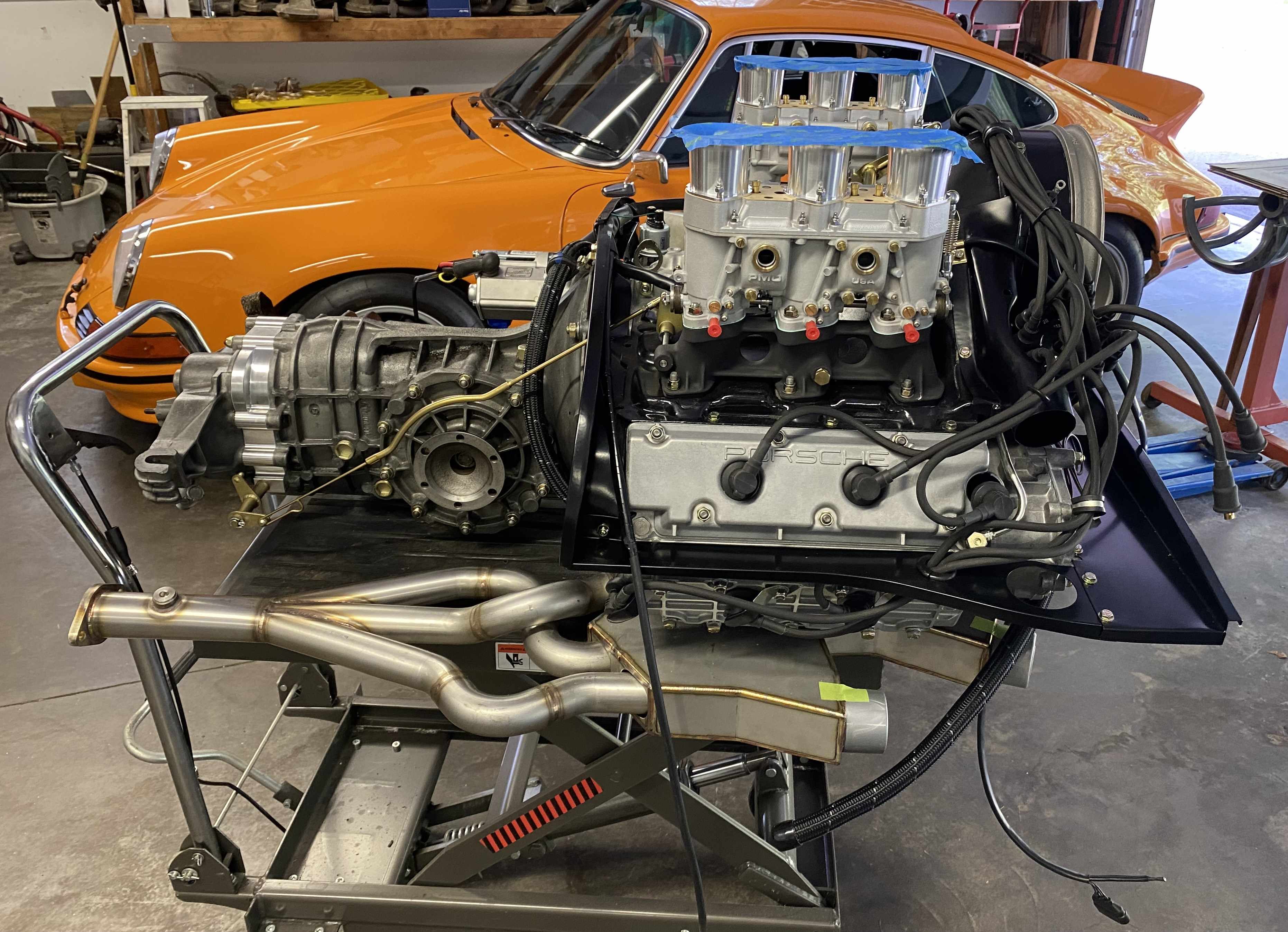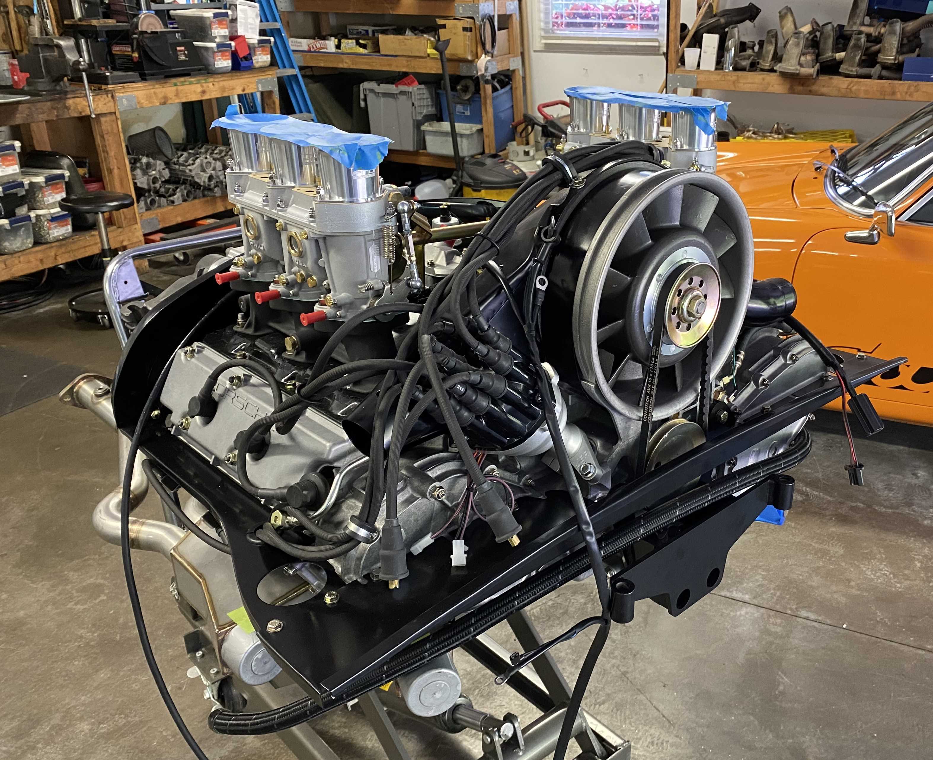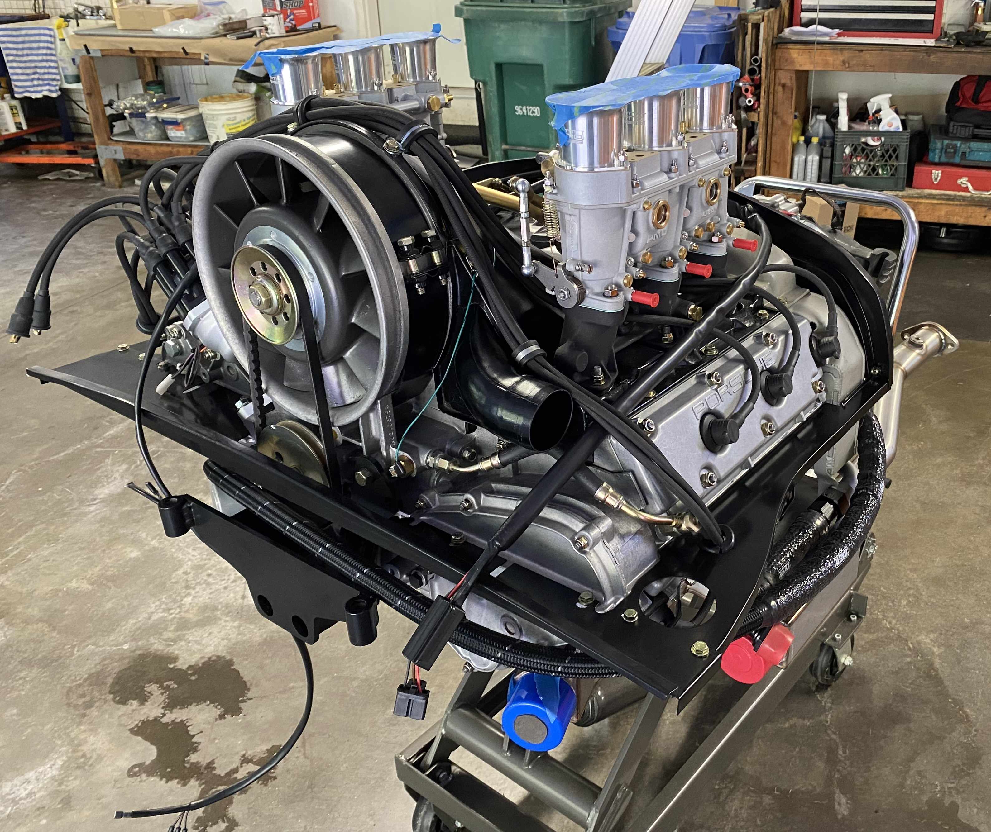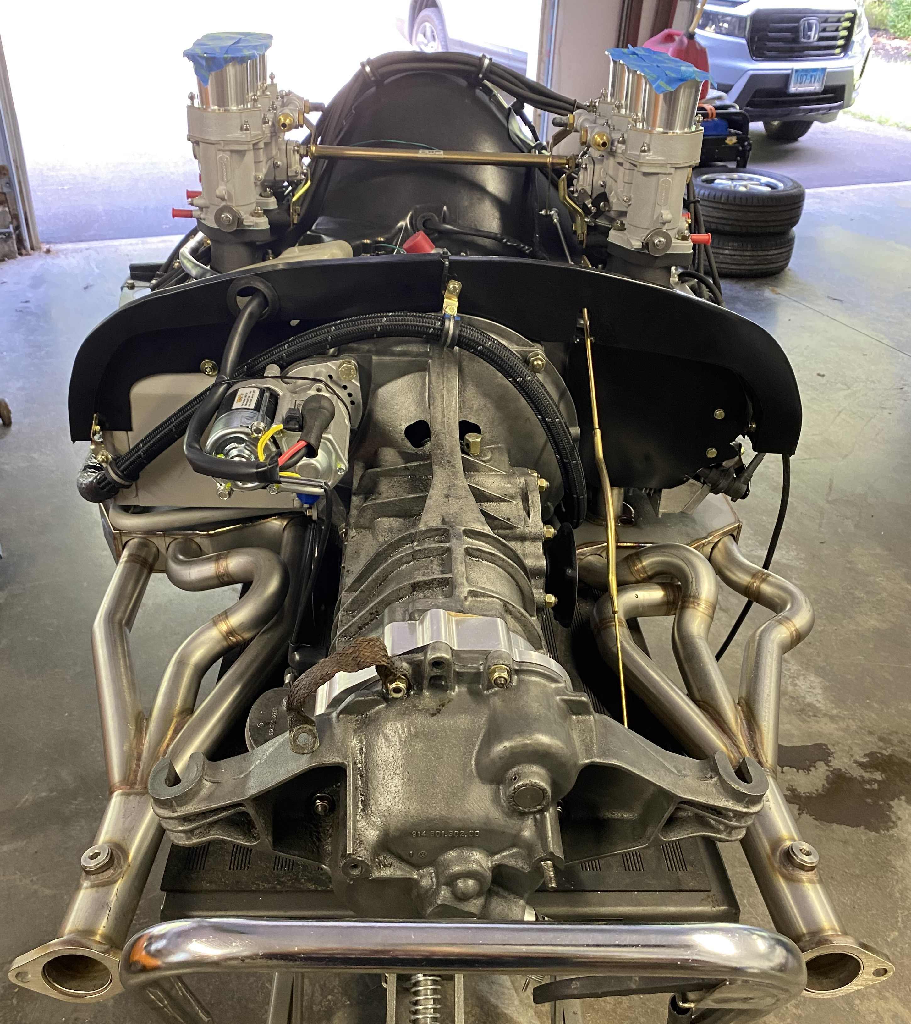 I installed the twin plug wire set from Patrick Motorsports. I had planned to build my own set, but I found that I did not have any good Beru plug connectors remaining in my stash. The price on the Patrick set was considerably less that if I had purchased new connectors and bulk wire. I tried to follow the wire management for the plug wires and engine harness used on the factory GT motors as close as possible. I also installed the new PMO 46 card kit and linkages and filled the gearbox with Swepco 201. I plan to install the external Mocal T-stat, the MSD CD boxes, coils and fuel lines to the carbs before doing the engine install. I also need to install the fuel tank and fuel pumps up front before the engine goes in. I'll have to sort out all the electrical connections between the engine, the chassis harness and the MSD system before the engine install. I expect this will require some modifications to the engine and chassis harness connections as well as the creation of some new wiring harness. Anyone who has already been down this path is welcome to make some suggestions to point me in the right direction. |
