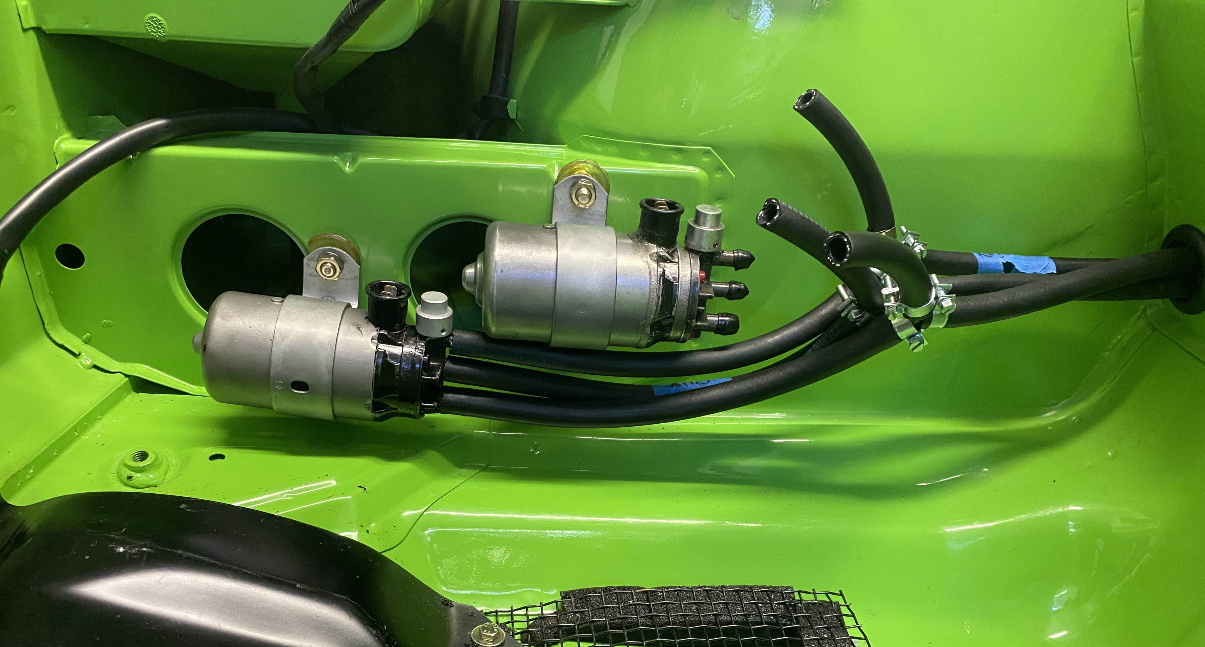 Looks good to me and 2 fuel pumps that seems like overkill but looks great Hi Ben Many of the factory GT's had the dual fuel pumps. I was told the second pump was for redundancy in case the primary pump failed. The driver had a switch to engage the second pump. For me, the coolness factor was too much to resist even though it makes the setup more complicated and susceptible to leaks. In my case, the lower pump is a dummy with the ports and connections sealed up. The upper pump will be supplying all the fuel. |
