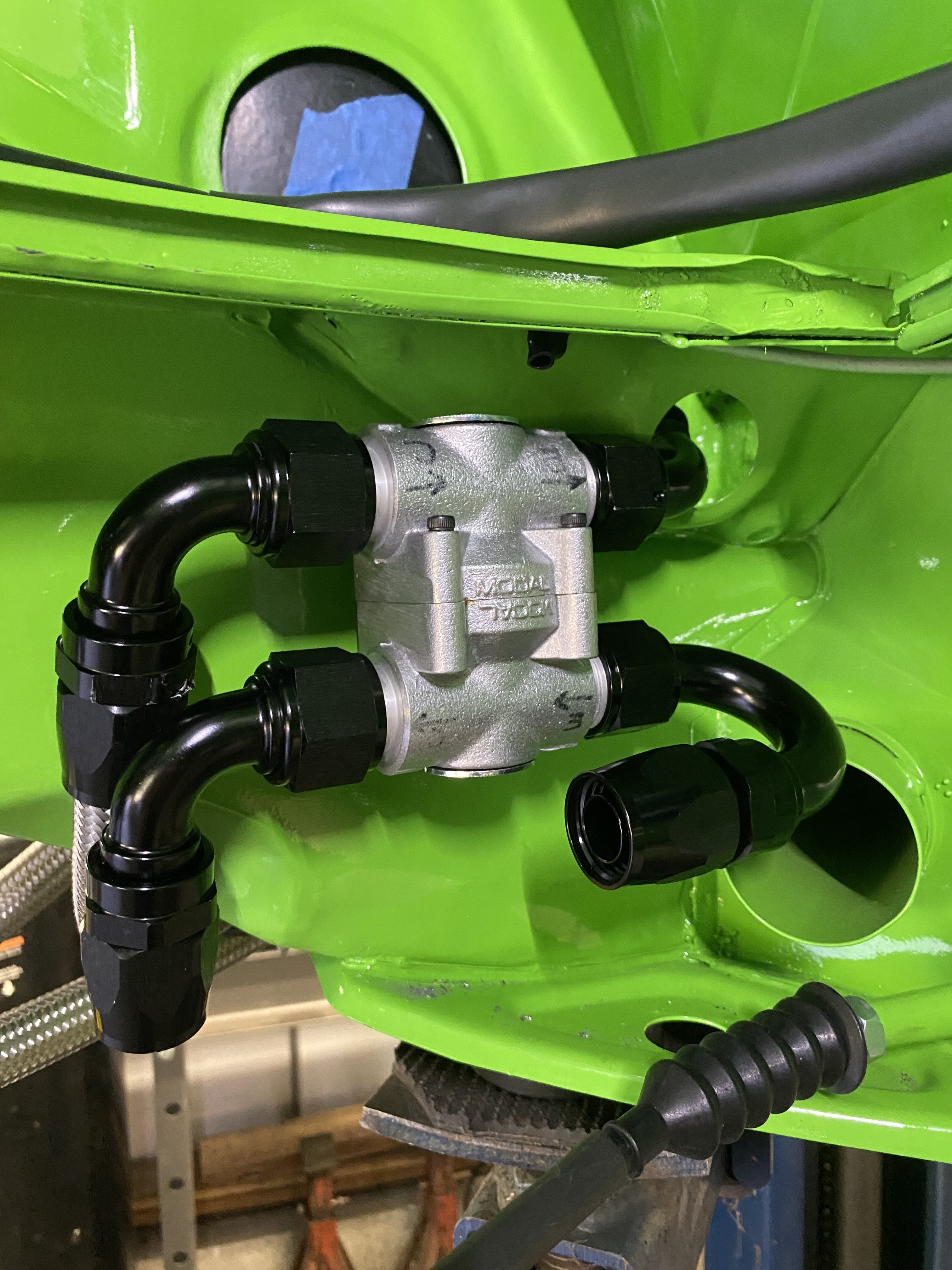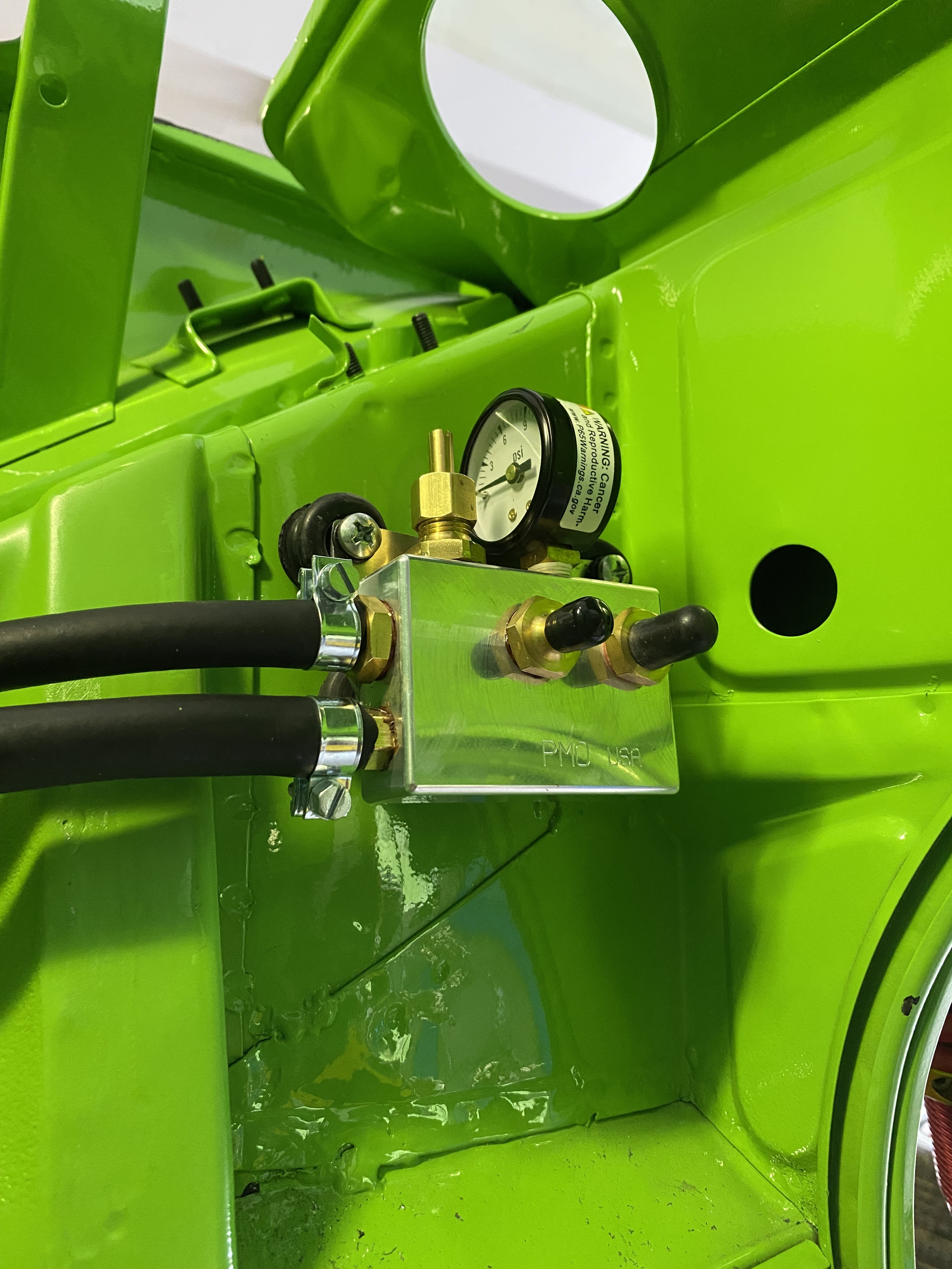 Finishing up the fuel delivery system. I installed the PMO pressure regulator in what I think will be a good location for easy unimpeded delivery to the carbs. (2) in-line Mahle filters will go between the regulator outputs and the carb inputs.