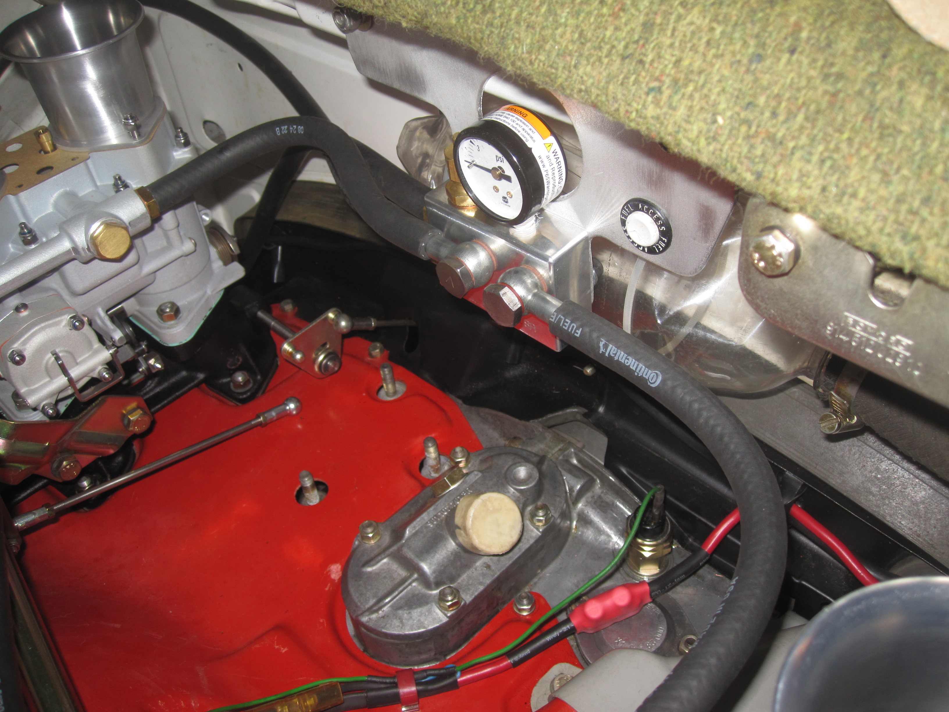 Hey Tom What I did. Not the ideal orietation of the gauge. Two 356 bango fittings with seals pointed at each carb. Hollow bolts will be safety wired. Starter button incorporated. Rory Hi Rory...Thanks for your suggestion. I thought about that location. That's the spot I've used on my 911 with PMO's and the spot most commonly used on 911's with carbs. However, I like to use two in-line filters between the pressure regulator and the carbs. My experience is that the PMO's are very susceptible to idle jet plugging and that the in-line filters minimize this problem. It seemed to me that placing the regulator on the back bulkhead wall of the 914 would not leave enough room for the filters. I am going to try the side wall location and see how that plumbing works out once I get the engine installed. I'll move it if need be. |
