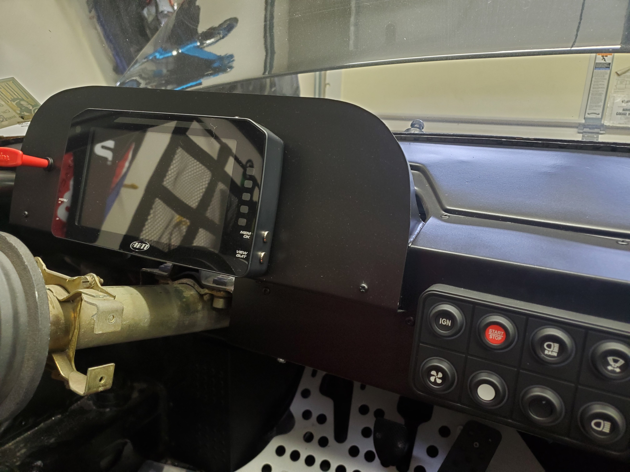 The PO built a nice dash but it was rather heavy and not really in keeping with my vision so worked with an awesome friend of mine who took a stock dash and rebuilt the front out of aluminum for a clean look that will allow installation of accessories. I am really excited about it but still need to figure out a nice enclosure for the back of the gauge pod. The hoop and upper secrion of dash are stock so will try to mirror as close to original look as possible. Function trumps that though. Will be installing electrical kill switch in next couple days. Has the AIM keypad, fire extinguisher pull, and data upllink installed. |