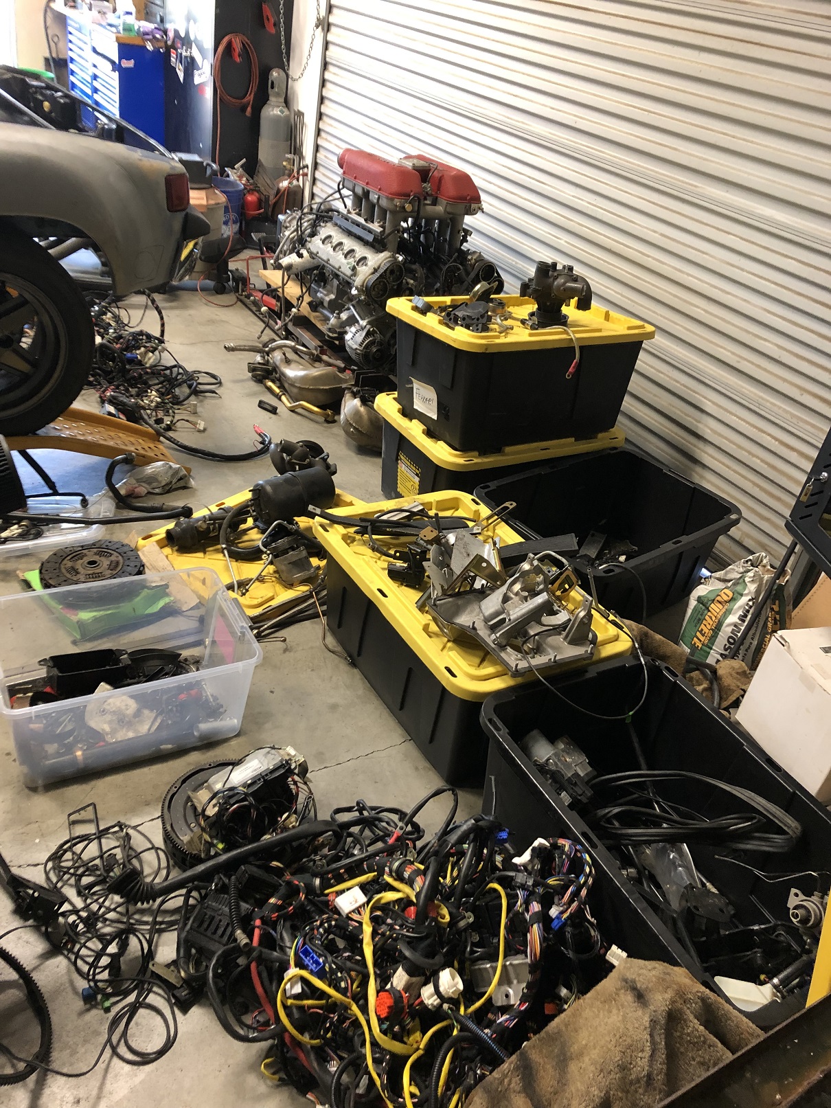 Then the owner said, "Come get the rest of the parts..." This is the first load. A bit of the back story is there were at least two 360s that contributed to the parts stash. One was an F1 paddle shift car, one was a manual. One was a spyder, one not. There are boxes of parts, not labeled other than "Ferrari". There's some F1 wiring, some manual wiring...