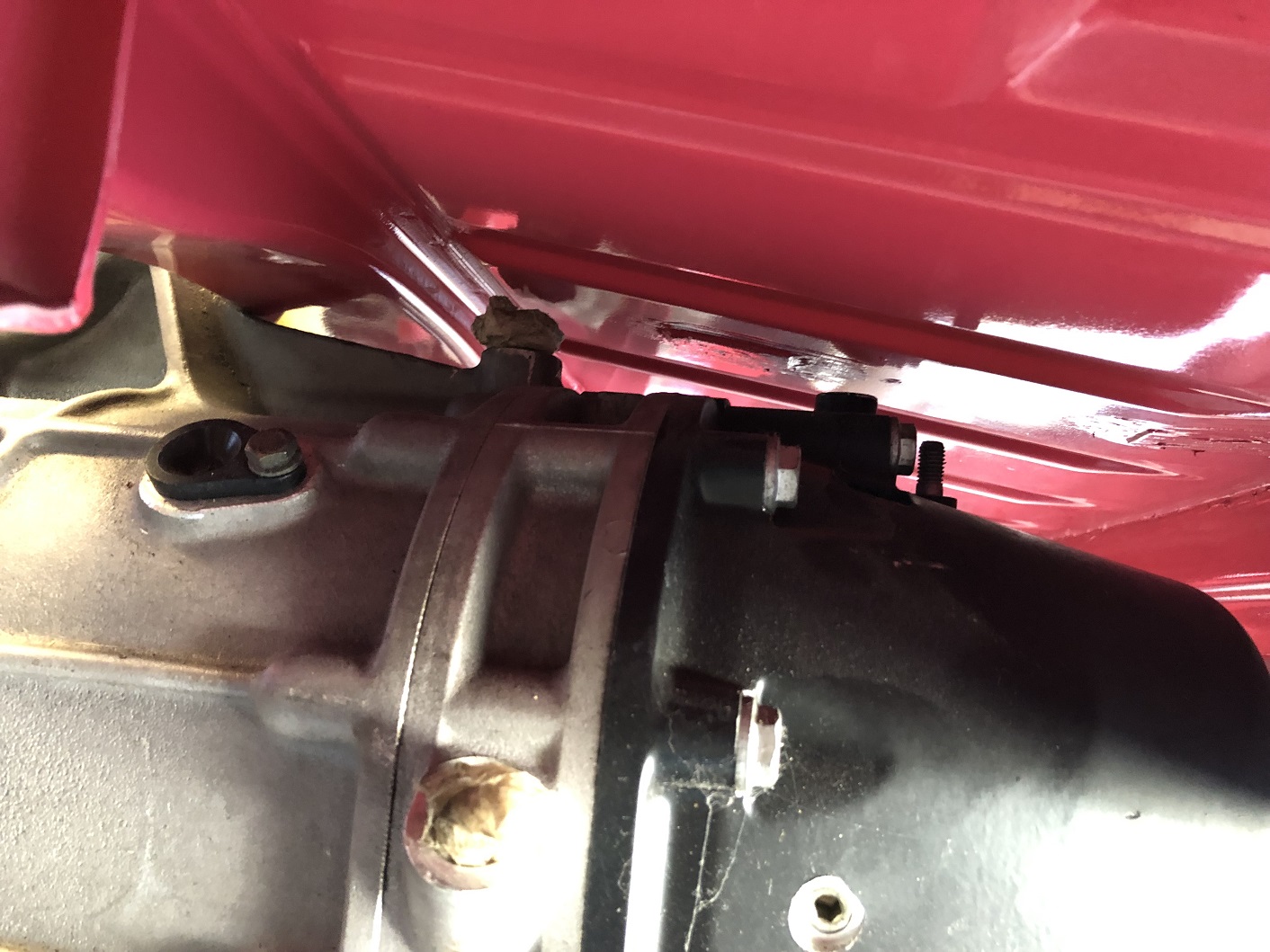Rear of trans showing how close things are. What you wouldn't know is there are transmission cooler lines that need to fit up there, too. So, as I mentioned, it'll get notched.