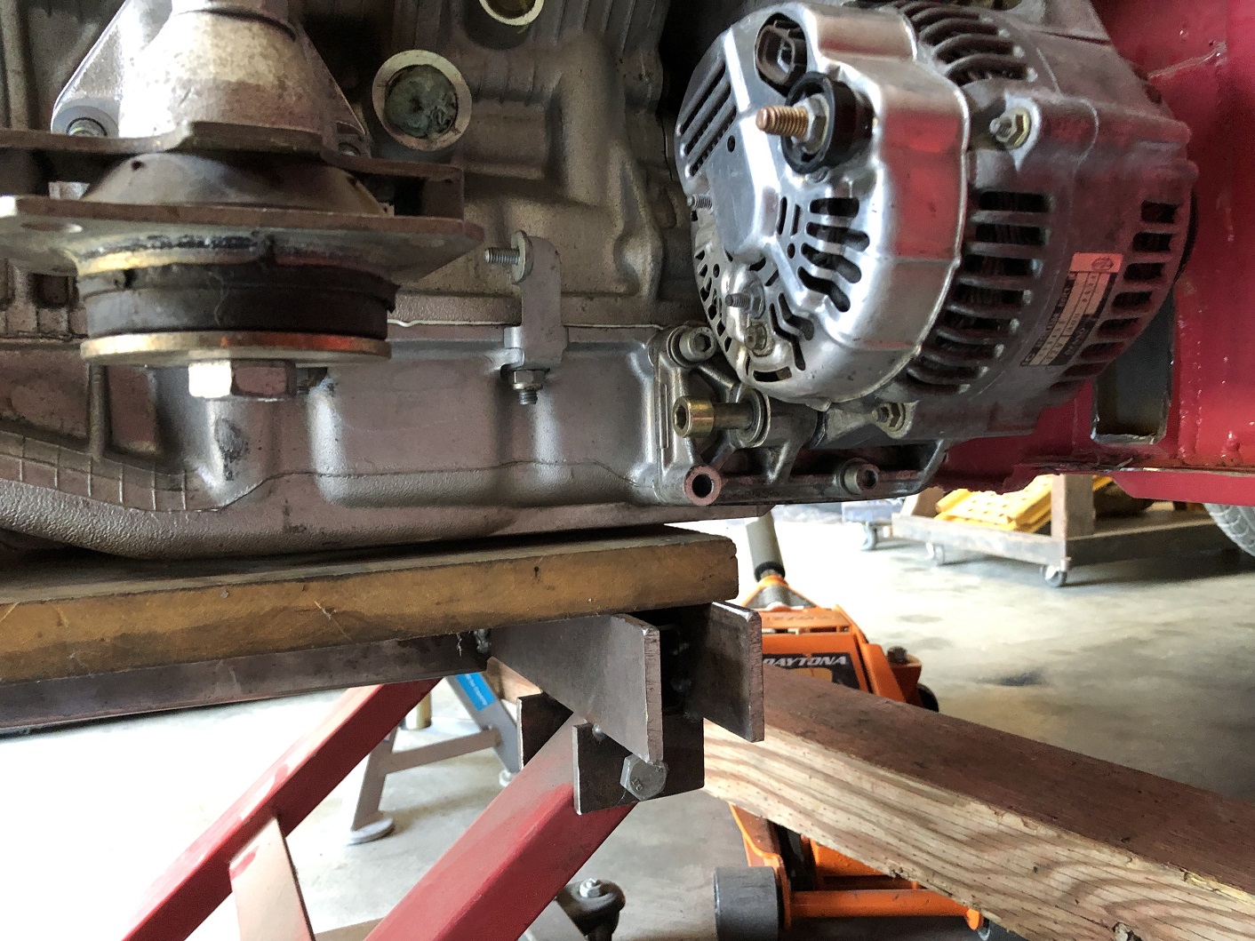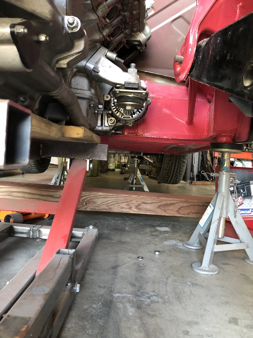 And a better, no-twisting-moment, trans mount system can be installed. Just mocked in approximate location, as you can see, but the transmission mounting tab will sit between these bars. Structurally better, for sure.