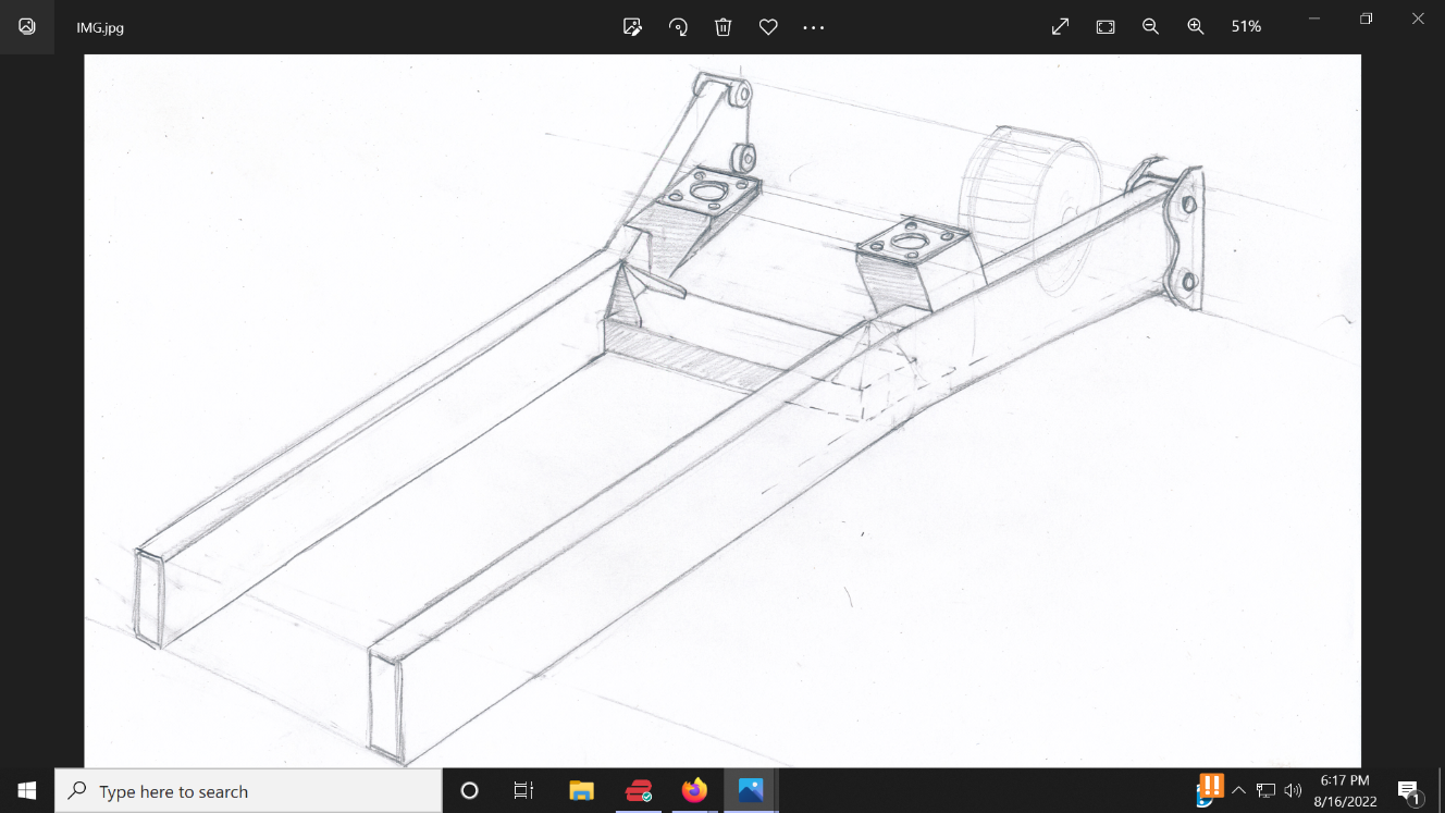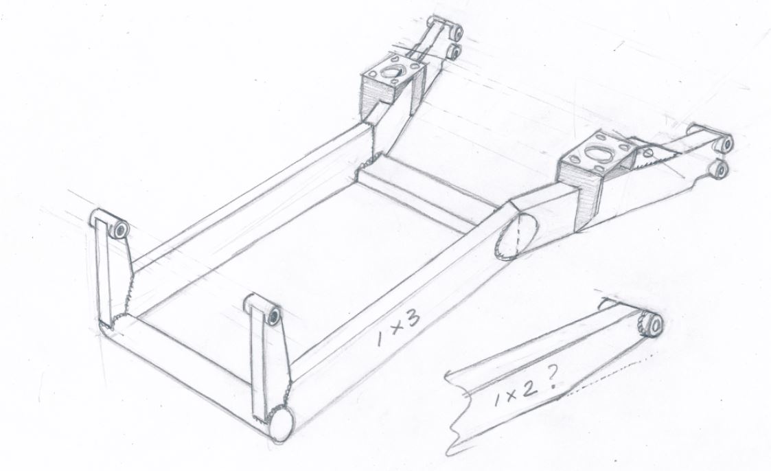 I passed this new info and the pics along to Martin, we kicked around a couple ideas and he sent a sketch of the latest thinking. Note it's not to scale, just "to concept". The plan is 3" x 1" .095 wall for those main tubes, even though the sketch makes them look far larger.