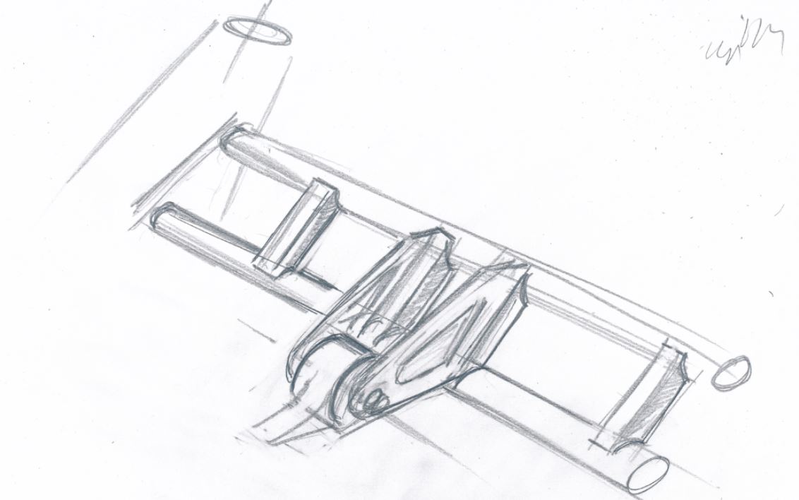 Seems everyone on my contributing team likes to sketch! Here's Martin's cut at one side of the cradle we noodled up. The tabbed bracket on the right if the sketch welds to the lower firewall, the "j" shape tube is one side of the cradle, the bracket on it is where the Ferrari engine mount sits and the part with the "?" and arrow is the rear mounting bracket that'll weld on between the 914 factory trans mount/cross bar and the round tube cross bar you saw in the earlier pics.