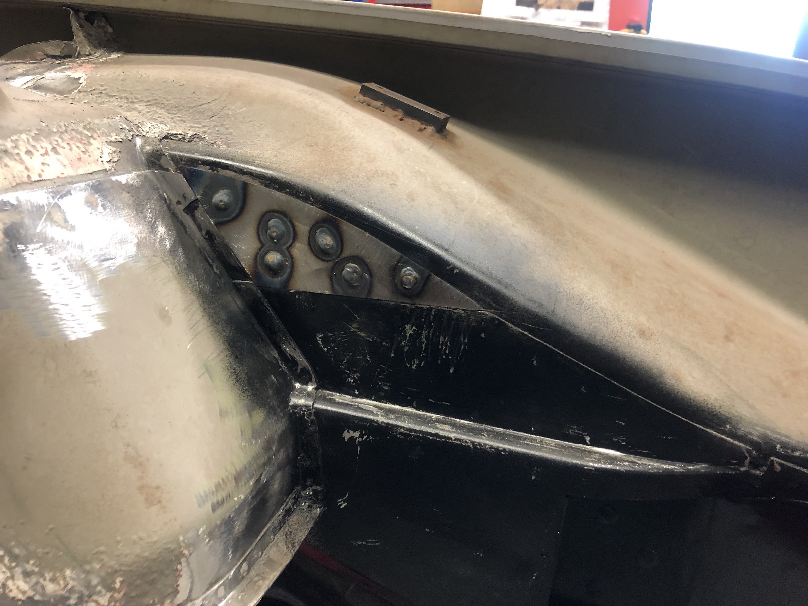 Left side upper, inner plate plug welded, sanded, primed and ready for the outer spreader.