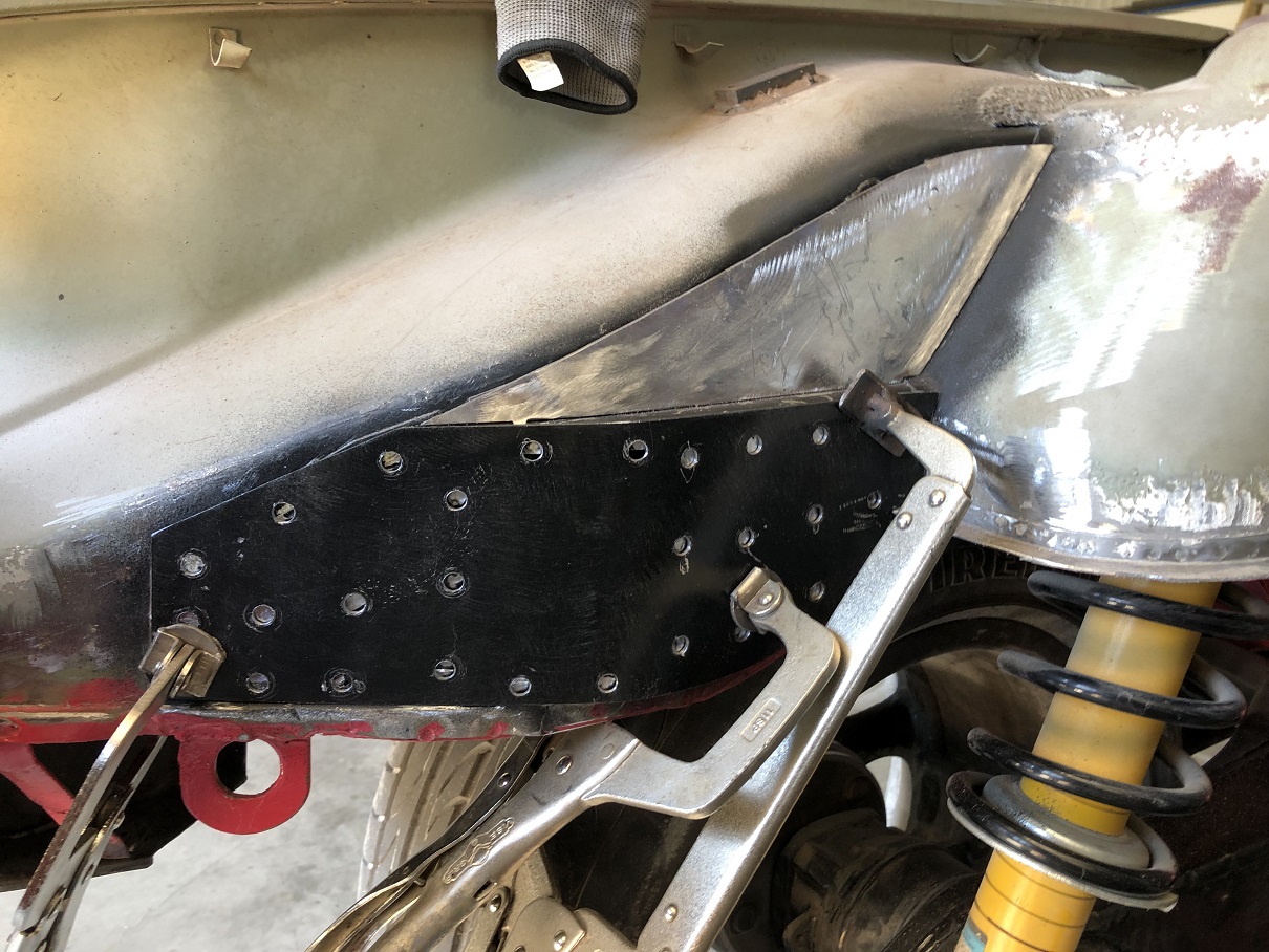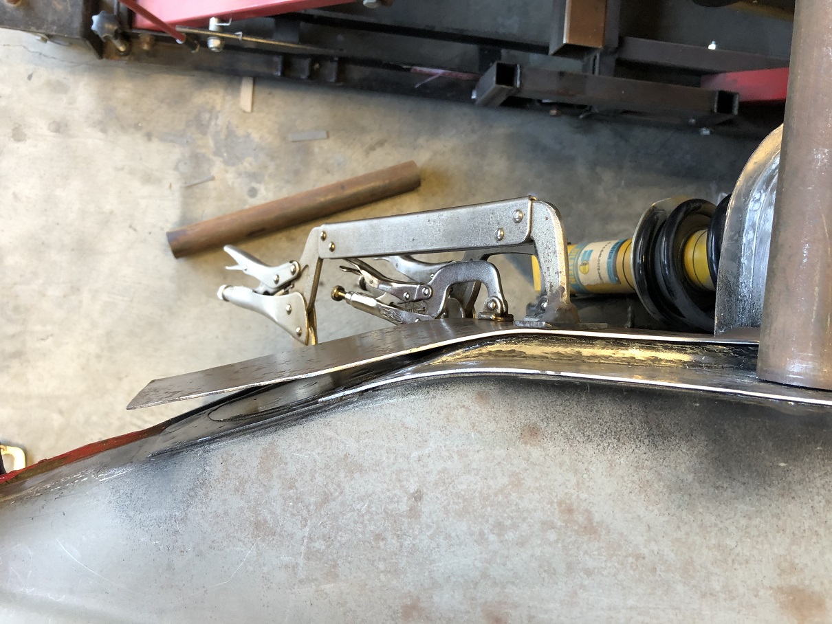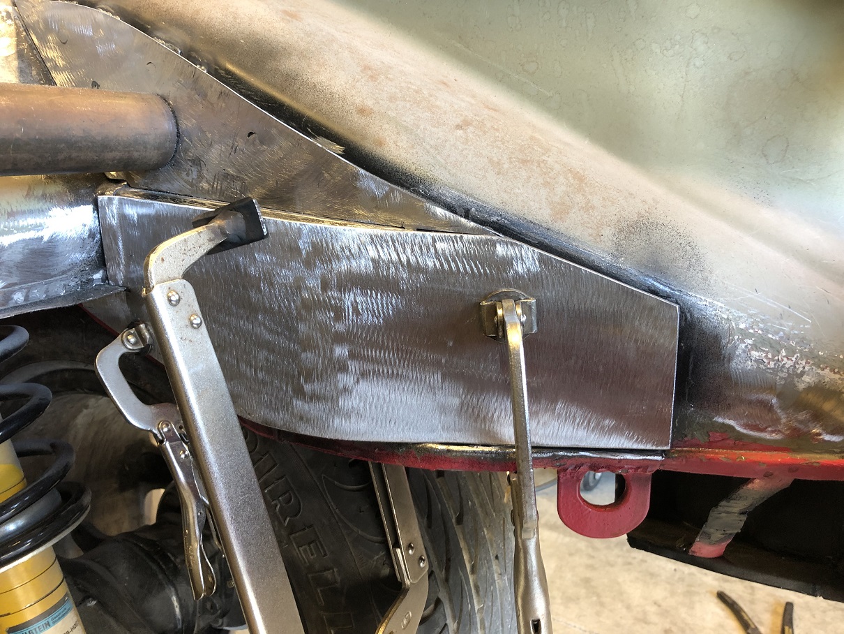 Left side upper spreader in place. I clamp near each hole as I'm plug welding it to be sure the plate is firmly contacting the parent material.