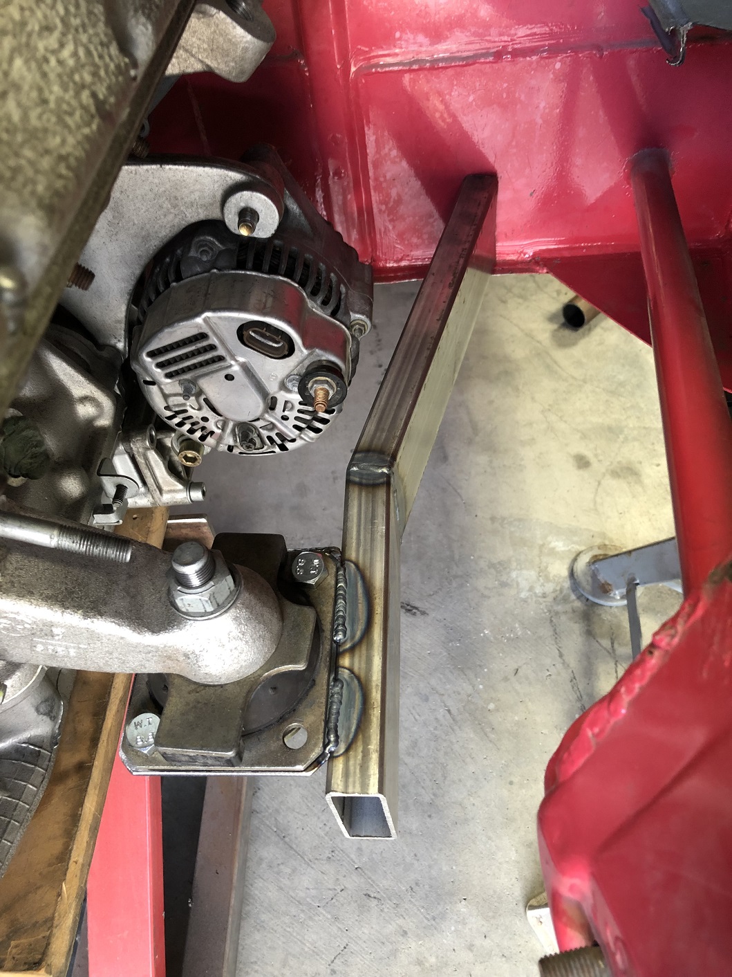Just my $.02... It looks like it would work, but I am not a fan of a cantilevered mount. Too much stress on the welds due to all that weight being on the end of the arm. I can't tell from the pictures, but is there a way to tie the two mounts together with a cross bar? It would help with the twisting a cantilevered mount will experience. Something to think about? Clay @ClayPerrine - Clay - Let me start by saying that there's a lot of engineering/measuring/discussion that I've not covered in these posts. We've been looking at how a cross bar might be incorporated. At the very start, I assumed I could just run a cross bar under the engine, just like in my LS build. The problem is that with the dry sump design, a cross bar (in a convenient location) would hang too far below the engine and raising the drive train to solve that problem means even worse news for the height of the trans output shafts/CV angles. The decision has already been made that the bottom of the sump is going to be below the bottom of the chassis by about 3/4" and a ramp/skid plate is planned. As you can see in the pic, the only place for a cross bar is well back from the engine mounts and there's only room for about a 1" tall piece of material. Remember, this motor moves around a fair bit so some additional clearance is needed on top of that. Again, nothing is off the table at this point and whatever we end up doing, it'll be over-engineered. Attached thumbnail(s) |