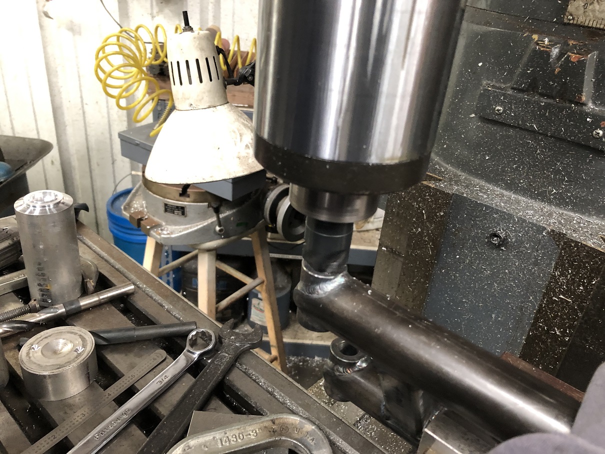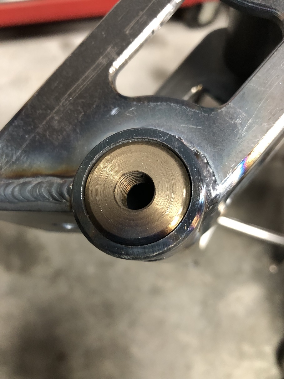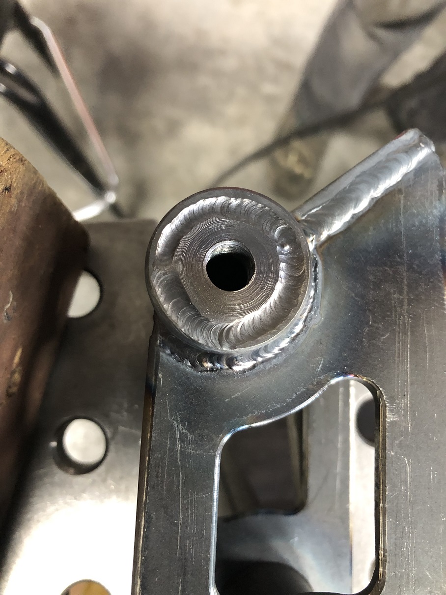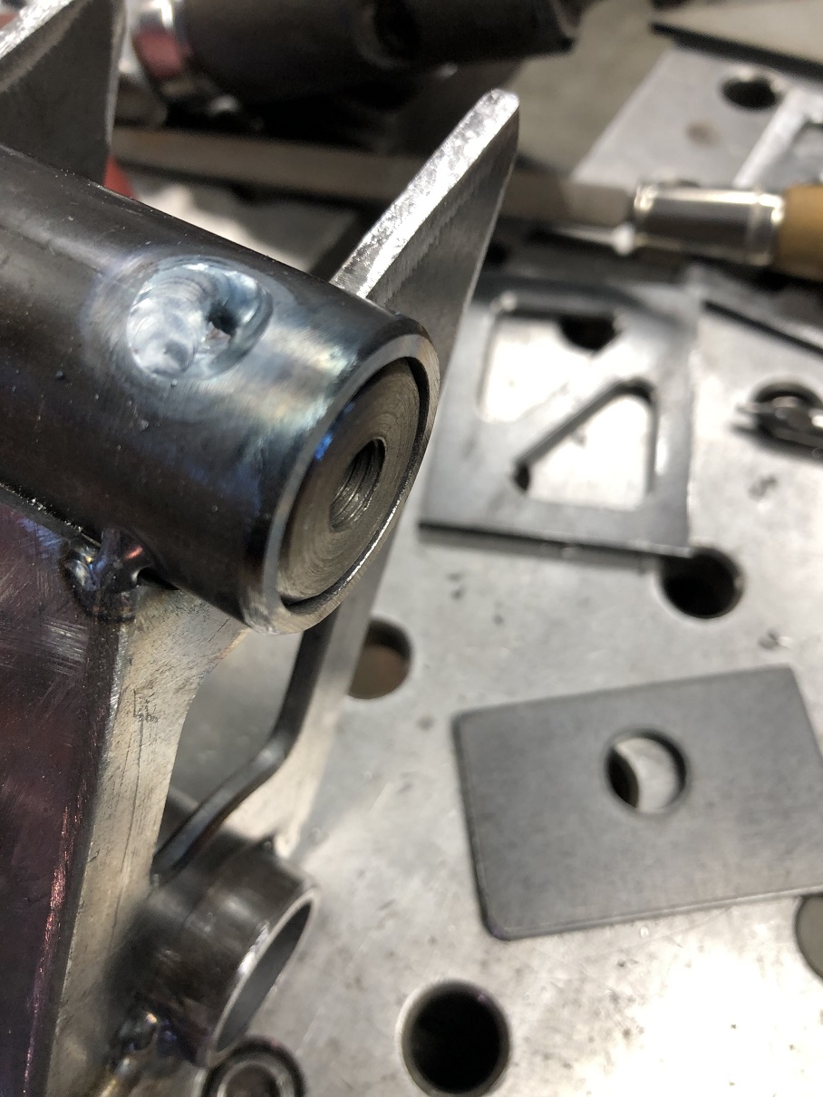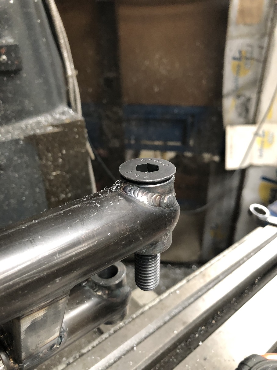 Next was to cut the bars to length and weld in the threaded bungs. Martin broke out his NHRA rule book experience and mentioned that whenever there was a plug weld, you had to leave a bit of the inner material visible through the outer material and weld so the tech inspector could validate things met the requirements and safety specs. Like you weren't trying to sneak in thinner wall than is required, etc.