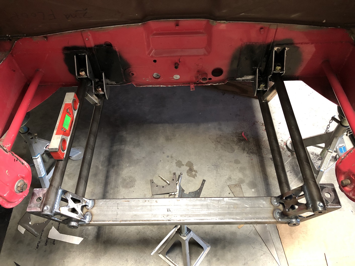 Chris - something to think about: will you still be able to get a socket/spanner on the inner axle pivot bolt with the engine/headers in place? Might a well placed slot in the console "beard" side braces be prudent?