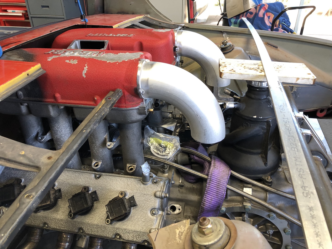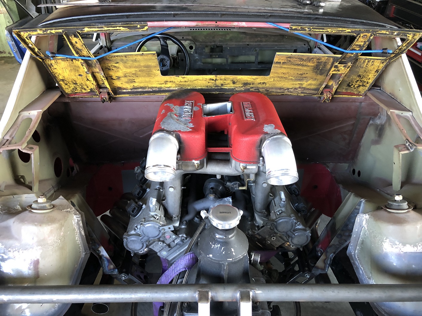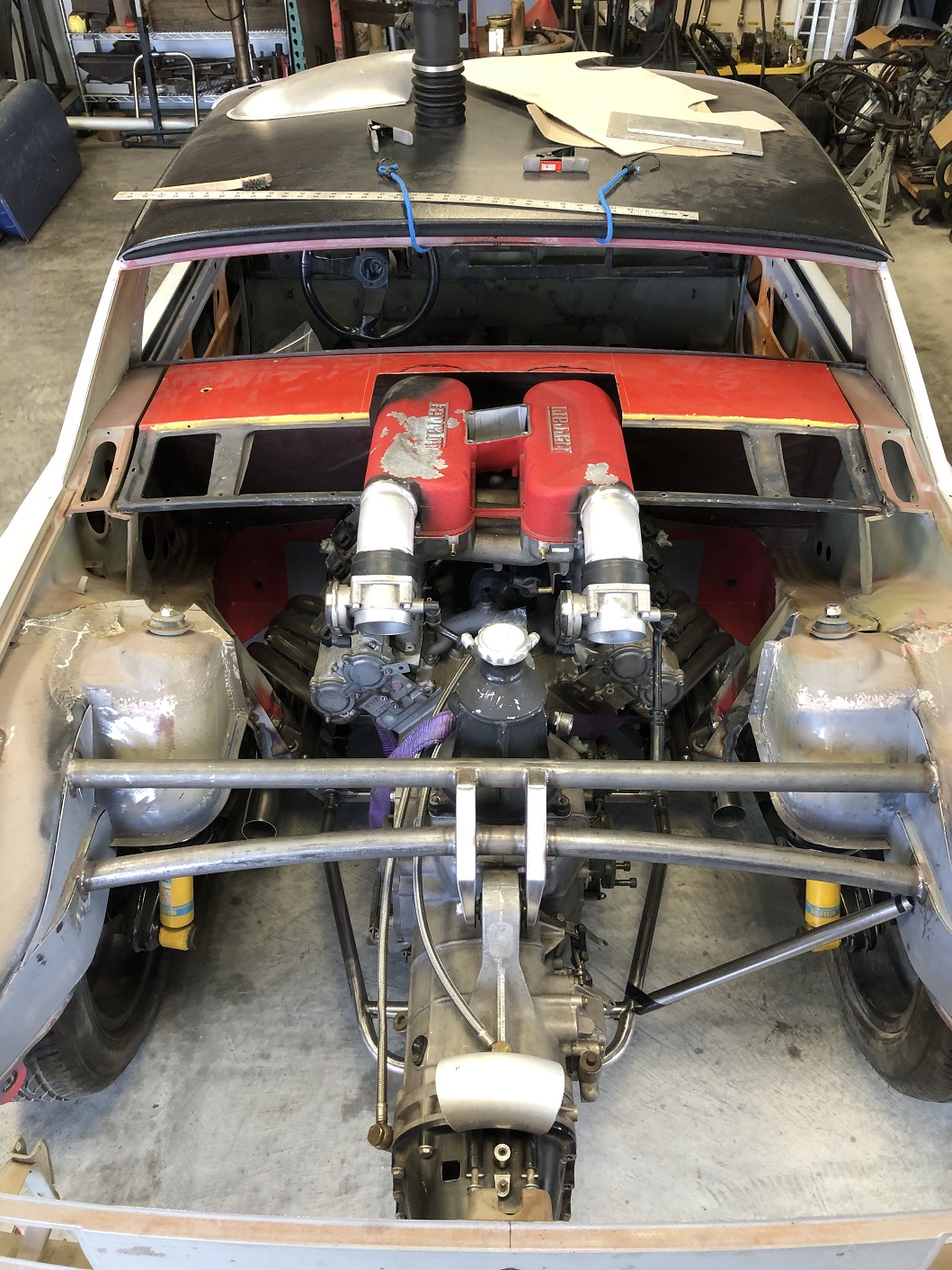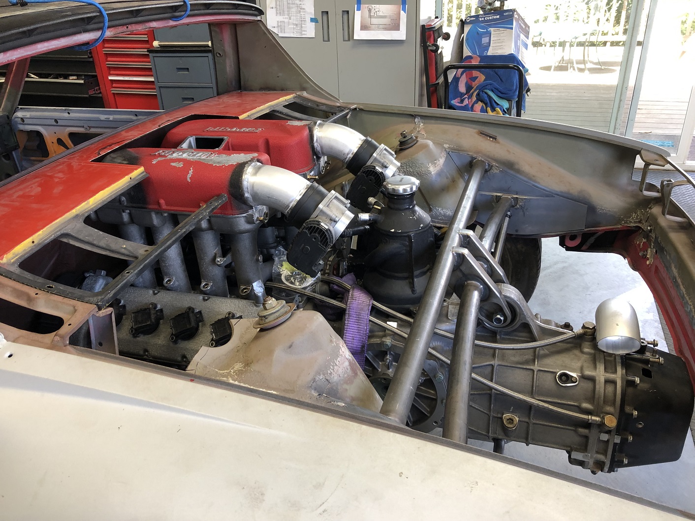 Shuffling cars so I can work on the LS build while I wait for some parts for the Ferrari car. This is the first time it's been outside since the drive train swap. Note the intake turn-downs won't be that severe - they'll be maybe about 45 degrees with just a bit of straight before the throttle bodies. But it'll look mostly like this. It'll sit a bit lower, too. Hahaha (IMG:style_emoticons/default/av-943.gif) that trans hanging down there, just makes me chuckle. |