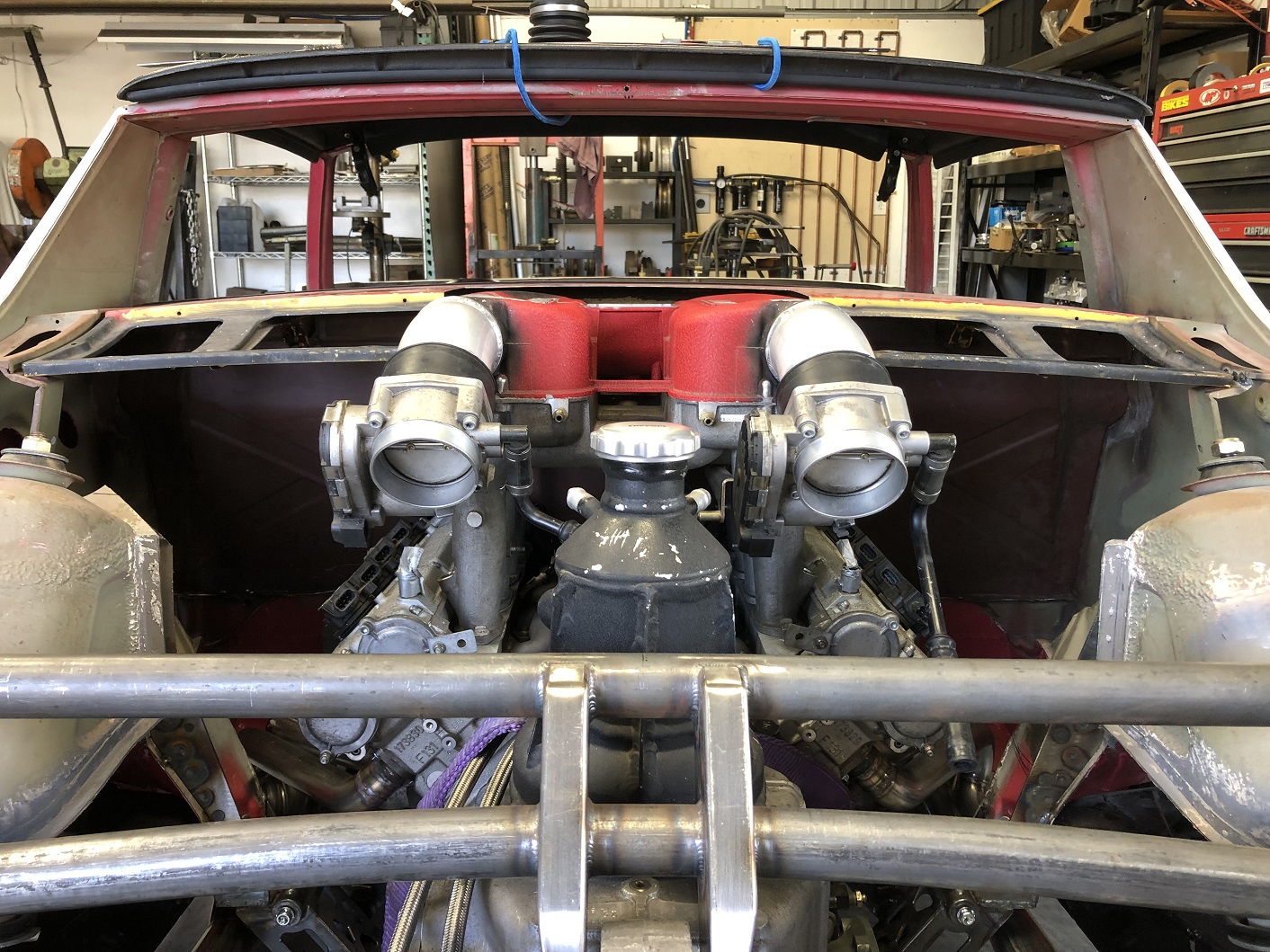 The factory set up has the TBs splayed outward a bit. Style-wise, I saw that as a bit out of place on the 914 so these are set to head straight back off the plenum. Attached thumbnail(s) |
